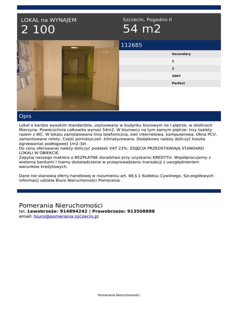 Szczecin, Pogodno II LOKAL na WYNAJEM 54 m2 2 100 112685 Secondary 1 2 2007 Perfect Opis Lokal o bardzo wysokim standardzie, usytuowany w budynku biurowym na I piętrze, w okolicach Mierzyna. Powierzchnia całkowita wynosi 54m2. W biurowcu na tym samym piętrze- trzy toalety razem z WC. W lokalu zainstalowana linia telefoniczna, sieć internetowa, komputerowa. Okna PCV, zamontowane rolety. Część pomieszczeń -klimatyzowana. Dodatkowo należy doliczyć koszta ogrzewania( podłogowe) 1m2-3zł. Do ceny oferowanej należy doliczyć podatek VAT 23%. ZDJĘCIA PRZEDSTAWIAJĄ STANDARD LOKALI W OBIEKCIE. Zapytaj naszego maklera o BEZPŁATNE doradztwo przy uzyskaniu KREDYTU. Współpracujemy z wieloma bankami i mamy doświadczenie w przeprowadzaniu transakcji z uwzględnieniem warunków kredytowych. Dane nie stanowią oferty handlowej w rozumieniu art. 66,§ 1 Kodeksu Cywilnego. Szczegółowych informacji udziela Biuro Nieruchomości Pomerania . Pomerania Nieruchomości tel. Lewobrzeże: 914894242 | Prawobrzeże: 913508888 email: [email protected] Pomerania Nieruchomości Powered by TCPDF (www.tcpdf.org)