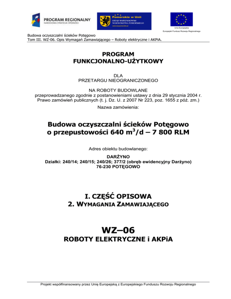 Unia Europejska Europejski Fundusz Rozwoju Regionalnego Budowa oczyszczalni ścieków Potęgowo Tom III. WZ-06. Opis Wymagań Zamawiającego – Roboty elektryczne i AKPiA. PROGRAM FUNKCJONALNO-UśYTKOWY DLA PRZETARGU NIEOGRANICZONEGO NA ROBOTY BUDOWLANE przeprowadzanego zgodnie z postanowieniami ustawy z dnia 29 stycznia 2004 r. Prawo zamówień publicznych (t. j. Dz. U. z 2007 Nr 223, poz. 1655 z póź. zm.) Nazwa zamówienia: Budowa oczyszczalni ścieków Potęgowo o przepustowości 640 m3/d – 7 800 RLM Adres obiektu budowlanego: DARśYNO Działki: 240/14; 240/15; 240/26; 377/2 (obręb ewidencyjny DarŜyno) 76-230 POTĘGOWO I. CZĘŚĆ OPISOWA 2. WYMAGANIA ZAMAWIAJĄCEGO WZ–06 ROBOTY ELEKTRYCZNE i AKPiA Projekt współfinansowany przez Unię Europejską z Europejskiego Funduszu Rozwoju Regionalnego Unia Europejska Europejski Fundusz Rozwoju Regionalnego Budowa oczyszczalni ścieków Potęgowo Tom III. WZ-06. Opis Wymagań Zamawiającego – Roboty elektryczne i AKPiA. Strona 2/31 ZAWARTOŚĆ 1 INFORMACJE OGÓLNE.................................................................................................................................. 4 1.1 ZAKRES STOSOWANIA....................................................................................................................................... 4 1.2 PODSTAWOWE OKREŚLENIA .............................................................................................................................. 4 1.2.1 Linia kablowa ........................................................................................................................................ 4 1.2.2 Osprzęt linii kablowej ............................................................................................................................ 4 1.2.3 Osłona kabla.......................................................................................................................................... 4 1.2.4 Skrzyżowanie ......................................................................................................................................... 4 1.2.5 Zbliżenie................................................................................................................................................. 4 1.3 MINIMALNY ZAKRES ROBÓT ELEKTRYCZNYCH ORAZ AKPIA ...................................................................................... 5 1.4 SZCZEGÓŁY DOTYCZĄCE ROBÓT ELEKTRYCZNYCH ORAZ AKPIA .................................................................................. 7 1.4.1 Zasilanie elektroenergetyczne............................................................................................................... 7 1.4.2 Rozdzielnica główna niskiego napięcia 0,4 kV....................................................................................... 7 1.4.3 Aparatura kontrolno pomiarowa i automatyki (AKPiA) ........................................................................ 8 1.4.4 Punkt zlewny ....................................................................................................................................... 10 1.4.5 Sito-piaskownik z odtłuszczaczem ....................................................................................................... 10 1.4.6 Pompownia wewnętrzna..................................................................................................................... 11 1.4.7 Komora anaerobowa........................................................................................................................... 11 1.4.8 Bioreaktor............................................................................................................................................ 11 1.4.9 Osadniki wtórne .................................................................................................................................. 12 1.4.10 Kanał odpływowy z komorą pomiarową ........................................................................................ 13 1.4.11 Kanał ulgi........................................................................................................................................ 13 1.4.12 Pompownia osadu powrotnego...................................................................................................... 13 1.4.13 Pompownia osadu nadmiernego.................................................................................................... 14 1.4.14 Dmuchawy...................................................................................................................................... 14 1.4.15 Węzeł odwodnienia osadów........................................................................................................... 14 1.4.16 Stacja dozowania chemikaliów ...................................................................................................... 15 1.4.17 Budynek techniczno - administracyjny ........................................................................................... 15 1.4.18 Oświetlenie zewnętrzne.................................................................................................................. 16 1.4.19 Gniazda potrzeb własnych.............................................................................................................. 16 2 MATERIAŁY .................................................................................................................................................16 2.1 2.2 2.3 2.4 2.5 2.6 2.7 2.8 2.9 2.10 2.11 2.12 2.13 3 SPRZĘT ........................................................................................................................................................24 3.1 4 OGÓLNE WYMAGANIA DLA MATERIAŁÓW........................................................................................................... 16 STOSOWANE MATERIAŁY ......................................................................................