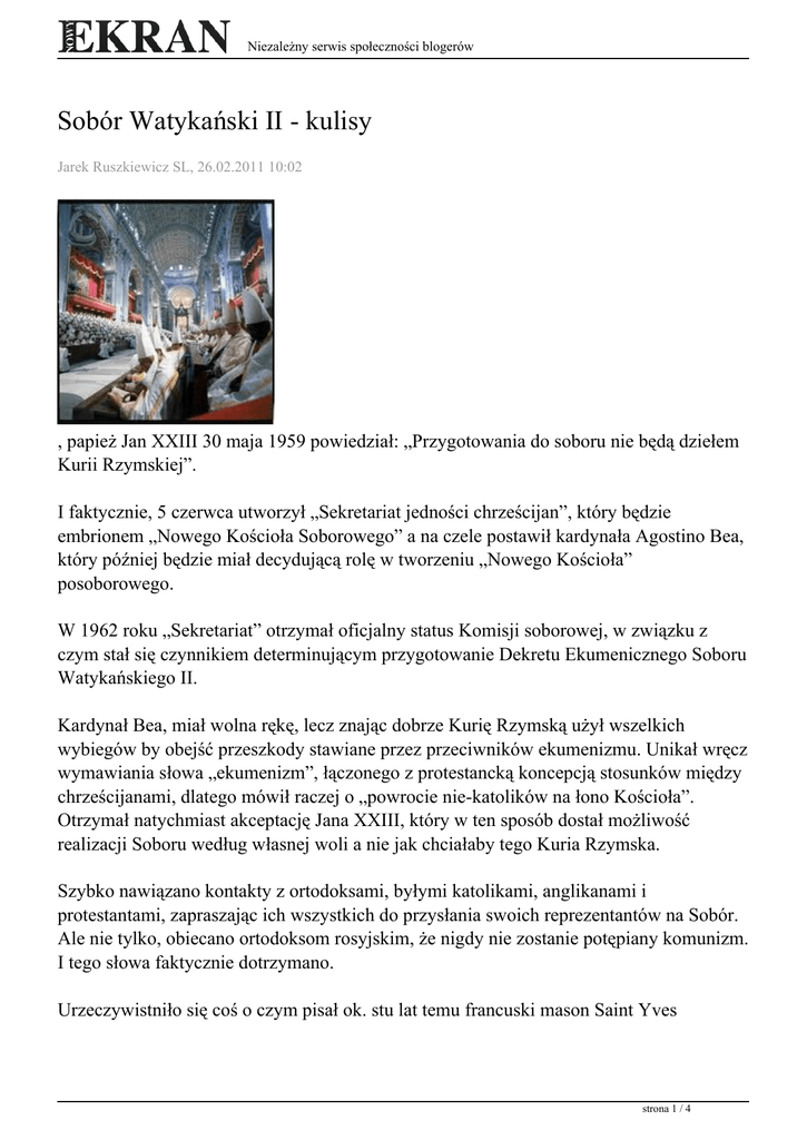 Niezależny serwis społeczności blogerów Sobór Watykański II - kulisy Jarek Ruszkiewicz SL, 26.02.2011 10:02 , papież Jan XXIII 30 maja 1959 powiedział: „Przygotowania do soboru nie będą dziełem Kurii Rzymskiej”. I faktycznie, 5 czerwca utworzył „Sekretariat jedności chrześcijan”, który będzie embrionem „Nowego Kościoła Soborowego” a na czele postawił kardynała Agostino Bea, który później będzie miał decydującą rolę w tworzeniu „Nowego Kościoła” posoborowego. W 1962 roku „Sekretariat” otrzymał oficjalny status Komisji soborowej, w związku z czym stał się czynnikiem determinującym przygotowanie Dekretu Ekumenicznego Soboru Watykańskiego II. Kardynał Bea, miał wolna rękę, lecz znając dobrze Kurię Rzymską użył wszelkich wybiegów by obejść przeszkody stawiane przez przeciwników ekumenizmu. Unikał wręcz wymawiania słowa „ekumenizm”, łączonego z protestancką koncepcją stosunków między chrześcijanami, dlatego mówił raczej o „powrocie nie-katolików na łono Kościoła”. Otrzymał natychmiast akceptację Jana XXIII, który w ten sposób dostał możliwość realizacji Soboru według własnej woli a nie jak chciałaby tego Kuria Rzymska. Szybko nawiązano kontakty z ortodoksami, byłymi katolikami, anglikanami i protestantami, zapraszając ich wszystkich do przysłania swoich reprezentantów na Sobór. Ale nie tylko, obiecano ortodoksom rosyjskim, że nigdy nie zostanie potępiany komunizm. I tego słowa faktycznie dotrzymano. Urzeczywistniło się coś o czym pisał ok. stu lat temu francuski mason Saint Yves strona 1 / 4 Niezależny serwis społeczności blogerów d’Alveidre, w “Mission de l’Inde”: „W końcu, by zrealizować tę Misję głosowaniem: nadejdzie dzień europejskiego Soboru ekumenicznego, na którym reprezentowane będą wszystkie wyznania”. Należy pamiętać także o roli Hansa Kunga, profesora teologi w Tubindze, który zaprezentował natychmiast porządek obrad Soboru, w którym wnioskował jako cel reformę Kościoła według jawnie protestanckiego klucza: - uznanie Reformacji Lutra za „wydarzenie religijne”, - większe uznanie Biblii, tak w teologii jak i obrządku, - przygotowanie Liturgii ludowej, w jezykach różnych krajów, - uznanie „uniwersalnego kapłaństwa” wszystkich wiernych, - zlikwidowanie jakiegokolwiek związku papiestwa z polityką, - reforma Kurii Rzymskiej i zniesienie Indeksu Ksiąg Zakazanych itd. Jak widać, wspomniany wyżej Saint Yves d’Alveidre był „prorokiem” i faktycznie wszystkie jego „przewidywania” znalazły (nawet jeśli w formie pozornie zmodyfikowanej) odbicie w końcowych dokumentach Soboru. I nie ma się co dziwić bo zatwierdzenie tego projektu było nie tylko przygotowaniem schematów, tak różnych od tych przygotowanych przez Komisje w Kurii Rzymskiej lecz prawdziwym projektem dostarczonym wszystkim Ojcom soborowym. A właściwie „projektem” żydowskiego spisku przeciwko Kościołowi katolickiemu, zdemaskowanego już wcześniej, w 1936 roku przez londyńską“ Catholic Gazette”, oficjalny organ Katolickiego Towarzystwa Misyjnego Anglii. W numerze z lutego 1936 pojawił się artykuł pod tytułem: “The jewish peril and the Catholic Church” (Niebezpieczeństwo żydowskie a Kościół katolicki) . W artykule tym przytoczono to co zostało powiedziane w czasie tajnych spotkań w Paryżu. Niedługo potem, tygodnik “Le Réveil du Peuple” opublikował artykuł, w którym sprecyzował, że te „deklaracje” padły na tajnych zebraniach loży masońskiej B’nai B’rith, złożonej z samych Żydów. Poniżej niektóre tezy tego artykułu z 1936roku. „Dopóki będzie istnieć wśród gojów jakakolwiek moralna koncepcja porządku społecznego i dopóki każda religia, każdy patriotyzm, każda godność nie zostaną strona 2 / 4 Niezależny serwis społeczności blogerów zlikwidowane, nasze królowanie na ziemi nie może nadejść... Mamy przed sobą jeszcze długą drogę zanim będziemy mogli zniszczyć naszego głównego przeciwnika – Kościół katolicki. Z tego też powodu zabraliśmy się z całą mocą by skutecznie zaatakować fundamenty Kościoła. Rozpowszechniliśmy ducha Rewolucji i fałszywy liberalizm wśród wszystkich Narodów goim, by przekonać ich do oddalenia się od od ich wiary, by zaczęli wstydzić się wyznawać i praktykować religię, by przestali być posłusznymi przykazaniom ich Kościoła. To my doprowadziliśmy wielką ich liczbę do stania się ateistami, jeszcze więcej przekonaliśmy do szczycenia się pochodzeniem od małpy (Darwinizm). To my wbiliśmy im do głowy nowe teorie, niemożliwe do zrealizowania, jak komunizm, socjalizm, anarchizm. A wszystkie służą naszym celom. To my postępowaliśmy zgodnie ze wskazówkami naszych przywódców, którzy mówili mądrze: sprawcie by niektórzy z naszych synów zostali kardynałami i biskupami by zniszczyć Kościół. To my jesteśmy ojcami wszystkich rewolucji, także tych, które obracają się przeciwko nam. To my możemy chwalić się, że jesteśmy twórcami Reformacji. Kalwin był jednym z naszych synów, z pochodzenia był Żydem, wykształconym przez autorytety żydowskie i wspierany przez przez nasze finanse by odegrać swoją rolę w Reformacji. Luter był pod wpływem naszych przyjaciół Żydów a jego spisek przeciwko Kościołowi ukoronowany został sukcesem, także dzięki naszym finansom. Jesteśmy wdzięczni Protestantom za wspaniałomyślne poparcie, które udzielają nam w walce przeciwko potędze cywilizacji chrześcijańskiej i w naszych przygotowaniach do nadejścia naszej supremacji na światem całym i nad królestwami goim. Udało nam się zniszczyć większość europejskich tronów. Reszta podzieli ich los niebawem. Rosja już zaakceptowała nasze panowanie. Francja ze swoim masońskim rządem znajduje się w naszej mocy. Anglia, zależna od naszych finansów, znajduje się pod naszymi obcasami. st