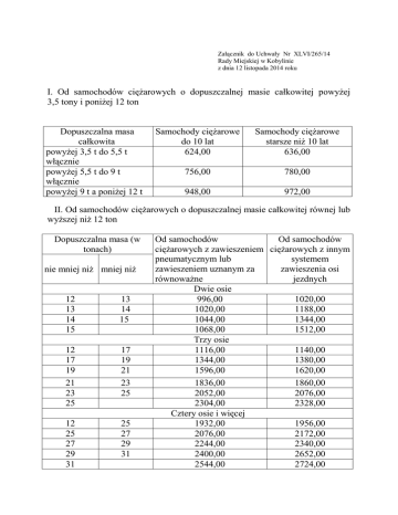 Załącznik do Uchwały Nr XLVI/265/14 Rady Miejskiej w Kobylinie z dnia 12 listopada 2014 roku I. Od samochodów ciężarowych o dopuszczalnej masie całkowitej powyżej 3,5 tony i poniżej 12 ton Dopuszczalna masa całkowita powyżej 3,5 t do 5,5 t włącznie powyżej 5,5 t do 9 t włącznie powyżej 9 t a poniżej 12 t Samochody ciężarowe do 10 lat 624,00 Samochody ciężarowe starsze niż 10 lat 636,00 756,00 780,00 948,00 972,00 II. Od samochodów ciężarowych o dopuszczalnej masie całkowitej równej lub wyższej niż 12 ton Dopuszczalna masa (w tonach) nie mniej niż mniej niż 12 13 14 15 13 14 15 12 17 19 21 23 25 17 19 21 23 25 12 25 27 29 31 25 27 29 31 Od samochodów Od samochodów ciężarowych z zawieszeniem ciężarowych z innym pneumatycznym lub systemem zawieszeniem uznanym za zawieszenia osi równoważne jezdnych Dwie osie 996,00 1020,00 1020,00 1188,00 1044,00 1344,00 1068,00 1512,00 Trzy osie 1116,00 1140,00 1344,00 1380,00 1596,00 1620,00 1836,00 1860,00 2052,00 2076,00 2304,00 2328,00 Cztery osie i więcej 1932,00 1956,00 2076,00 2172,00 2244,00 2340,00 2400,00 2652,00 2544,00 2724,00 III. Od ciągników siodłowych i balastowych przystosowanych do używania łącznie z naczepą lub przyczepą o dopuszczalnej masie całkowitej od 3,5 tony i poniżej 12 ton Dopuszczalna masa całkowita zespołu pojazdów od 3,5 t i poniżej 12 t Ciągniki siodłowe i Ciągniki siodłowe i balastowe przystosowane do balastowe starsze niż używania łącznie z naczepą 10 lat lub przyczepą do 10 lat 1800,00 1824,00 IV. Od ciągników siodłowych i balastowych przystosowanych do używania łącznie z naczepą lub przyczepą o dopuszczalnej masie całkowitej zespołu pojazdów równej lub wyższej niż 12 ton Dopuszczalna masa całkowita zespołu pojazdów nie mniej niż mniej niż 12 18 25 31 18 25 31 12 40 40 od ciągników siodłowych i balastowych od ciągników przystosowanych do siodłowych i używania łącznie z naczepą balastowych z innym lub przyczepą z systemem zawieszeniem zawieszenia osi pneumatycznym lub jezdnych zawieszeniem uznanym za równoważne Dwie osie 1584,00 1608,00 1680,00 1800,00 1788,00 1968,00 1884,00 2172,00 Trzy osie i więcej 1896,00 2184,00 2244,00 2772,00 V. Od przyczep i naczep, które łącznie z pojazdem silnikowym posiadają dopuszczalną masę całkowitą od 7 ton i poniżej 12 ton, z wyjątkiem związanych wyłącznie z działalnością rolniczą prowadzoną przez podatnika podatku rolnego Dopuszczalna masa całkowita od 7 ton i poniżej 12 ton Przyczepy i naczepy do 10 lat 276,00 Przyczepy i naczepy starsze niż 10 lat 300,00 VI. Od przyczep i naczep, które łącznie z pojazdem silnikowym posiadają dopuszczalną masę całkowitą równą lub wyższą niż 12 ton, z wyjątkiem związanych wyłącznie z działalnością rolniczą prowadzoną przez podatnika podatku rolnego Dopuszczalna masa całkowita zespołu pojazdów nie mniej niż mniej niż 12 18 25 18 25 12 28 33 38 28 33 38 12 38 38 Przyczepy i naczepy z zawieszeniem pneumatycznym lub zawieszeniem uznanym za równoważne Jedna oś 348,00 540,00 732,00 Dwie osie 456,00 804,00 1164,00 1500,00 Trzy osie i więcej 1044,00 1260,00 Przyczepy i naczepy z innym systemem zawieszenia 396,00 636,00 864,00 480,00 1032,00 1632,00 2148,00 1260,00 1632,00 VII. Od autobusu Liczba miejsc do siedzenia mniejszej niż 30 miejsc równej lub wyższej niż 30 miejsc 708,00 Autobusy starsze niż 10 lat 780,00 1128,00 1404,00 Autobusy do 10 lat