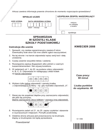 l m ed ia .p zw ww .sq l po br an o Arkusz zawiera informacje prawnie chronione do momentu rozpoczĊcia sprawdzianu! UZUPEàNIA ZESPÓà NADZORUJĄCY WPISUJE UCZEē KOD UCZNIA DATA URODZENIA UCZNIA dzieĔ miesiąc miejsce na naklejkĊ z kodem rok dysleksja SPRAWDZIAN W SZÓSTEJ KLASIE SZKOàY PODSTAWOWEJ Instrukcja dla ucznia KWIECIEē 2008 1. SprawdĨ, czy zestaw egzaminacyjny zawiera 8 stron. Ewentualny brak stron lub inne usterki zgáoĞ nauczycielowi. 2. Na tej stronie i na karcie odpowiedzi wpisz swój kod i datĊ urodzenia. 3. Czytaj uwaĪnie wszystkie teksty i zadania. 4. Rozwiązania zapisuj dáugopisem albo piórem z czarnym tuszem/atramentem. Nie uĪywaj korektora. 5. W zadaniach od 1. do 20. są podane cztery odpowiedzi: A, B, C, D. Odpowiada im nastĊpujący ukáad kratek na karcie odpowiedzi: 6. Wybierz tylko jedną odpowiedĨ i zamaluj kratkĊ z odpowiadającą jej literą – np. gdy wybraáeĞ odpowiedĨ „A”: Czas pracy: 60 minut Liczba punktów do uzyskania: 40 7. Staraj siĊ nie popeániaü báĊdów przy zaznaczaniu odpowiedzi, ale jeĞli siĊ pomylisz, báĊdne zaznaczenie otocz kóákiem i zaznacz inną odpowiedĨ. 8. Rozwiązania zadaĔ od 21. do 25. zapisz czytelnie i starannie w wyznaczonych miejscach. Pomyáki przekreĞlaj. 9. Ostatnia strona arkusza jest przeznaczona na brudnopis. Zapisy w brudnopisie nie bĊdą sprawdzane. Powodzenia! S-1-082 l m ed ia .p zw ww .sq l po br an o Jasne jak sáoĔce Tekst do zadaĔ od 1. do 3. SáoĔce jest gwiazdą, która Ğwieci juĪ od kilku miliardów lat. To wáaĞnie ono zapewnia znoĞne do Īycia temperatury na naszej planecie. Jego ciepáo sprawia, Īe wody oceanów parują, by potem przerodziü siĊ w Īyciodajne deszcze. DziĊki promieniom sáonecznym roĞliny mogą rosnąü i zaopatrywaü nas w pokarm. Jednym sáowem – bez SáoĔca Īycie na Ziemi nie byáoby moĪliwe. Nie trzeba siĊ jednak martwiü, Īe zgaĞnie. BĊdzie Ğwieciü jeszcze przez kolejne miliardy lat. Od najdawniejszych czasów SáoĔce byáo przez ludzi obserwowane, wykorzystywane do okreĞlania czasu, a nawet czczone jako bóstwo. Prastare miejsca kultu, kamienne krĊgi, budowano najczĊĞciej tak, by miaáy związek ze wschodem lub zachodem SáoĔca na początku wiosny lub lata. Najbardziej znanym spoĞród zachowanych do dziĞ jest potĊĪny krąg Stonehenge w Anglii, zbudowany kilka tysiĊcy lat temu. Niektórzy uczeni uwaĪają, Īe mógá sáuĪyü do przewidywania zaümieĔ SáoĔca. Zaümienie SáoĔca jest niezwykáym zjawiskiem. Powstaje, gdy KsiĊĪyc znajdzie siĊ miĊdzy SáoĔcem a Ziemią. SáoĔce zostaje wtedy zasáoniĊte przez KsiĊĪyc, którego cieĔ pada na ZiemiĊ. Podczas caákowitego zaümienia KsiĊĪyc zupeánie zasáania tarczĊ sáoneczną. Wtedy w ciągu dnia, na krótki czas, zapada ciemnoĞü, spada temperatura, a roĞliny i zwierzĊta reagują tak, jakby zbliĪaáa siĊ noc. W tym samym miejscu na Ziemi zjawisko caákowitego zaümienia SáoĔca moĪna obserwowaü przeciĊtnie tylko raz na kilkaset lat. CzĊĞciej wystĊpują zaümienia, podczas których KsiĊĪyc nie zasáania tarczy sáonecznej caákowicie. Nazywamy je czĊĞciowymi zaümieniami SáoĔca. Na podstawie: E. Übelacker, SáoĔce, Wrocáaw 1992. 1. SáoĔce jest waĪne dla Ziemi, poniewaĪ A. istnieje juĪ od miliardów lat. B. dostarcza ciepáa i Ğwiatáa. C. byáo kiedyĞ obiektem kultu. D. moĪna je obserwowaü. 2. Które zjawiska wystĊpują najrzadziej? A. Caákowite zaümienia SáoĔca. B. CzĊĞciowe zaümienia SáoĔca. C. Wschody i zachody SáoĔca. D. Astronomiczne zmiany pór roku. 3. Caákowite zaümienie SáoĔca wystĊpuje wtedy, gdy A. niebo jest caákowicie zachmurzone. B. na Ziemi zapada ciemna, gáĊboka noc. C. KsiĊĪyc zasáania caáą tarczĊ sáoneczną. D. Ziemia rzuca cieĔ na SáoĔce. 4. W Europie ĝrodkowej moĪna byáo obserwowaü caákowite zaümienia SáoĔca w latach 1706 i 1954. W których to byáo wiekach? A. XIX i XX B. XVIII i XX C. XVIII i XIX D. XVII i XIX 2 l m ed ia .p zw ww .sq l po br an o Tekst do zadaĔ od 5. do 7. 11 sierpnia 1999 r. w Polsce moĪna byáo zaobserwowaü czĊĞciowe zaümienie SáoĔca. Oto wyniki obserwacji tego zjawiska w niektórych miastach: Godzina CzĊĞü tarczy sáonecznej zakryta podczas Ğrodka zaümienia początku zaümienia Ğrodka zaümienia koĔca zaümienia GdaĔsk 11.30 12.47 14.04 0,819 Kraków 11.30 12.51 14.12 0,919 PoznaĔ 11.26 12.45 14.04 0,878 Szczecin 11.23 12.41 14.00 0,864 Waábrzych 11.25 12.45 14.05 0,924 Miejsce Na podstawie: www.zjawiska.art.pl 5. W Ğrodku zaümienia SáoĔce byáo najbardziej zakryte w A. Krakowie. B. GdaĔsku. C. Waábrzychu. D. Poznaniu. 6. W Krakowie Ğrodek zaümienia nastąpiá o godzinie A. 12.51 B. 11.30 C. 14.12 D. 12.45 7. Jak dáugo moĪna byáo obserwowaü zaümienie SáoĔca w Poznaniu? A. 1 godz. i 19 min B. 1 godz. i 41 min C. 3 godz. i 22 min D. 2 godz. i 38 min Tekst do zadania 8. Sáownik podaje trzy znaczenia sáowa sáoĔce: SàOēCE 1. «gwiazda najbliĪsza Ziemi, centralne ciaáo Ukáadu Sáonecznego» 2. «Ğwiatáo, blask wysyáane przez to ciaáo» 3. pieszczotliwie «osoba ukochana lub bardzo lubiana» 8. Jej wáosy lĞniáy w sáoĔcu. W tym zdaniu uĪyto sáowa sáoĔce w znaczeniu A. 1. i 2. B. 2. C. 3. D. 2. i 3. 9. Powiedzenie to jasne jak sáoĔce znaczy, Īe coĞ jest A. mądre. B. báyszczące. C. gorące. D. oczywiste. 3 l m ed ia .p zw ww .sq l po br an o Tekst do zadaĔ od 10. do 13. SáoĔce i sosny Zanim sáoĔce nad wieczorem zajdzie sosen bĊdzie siĊ czepiaáo uparcie. Nie stoczy siĊ za te sosny prĊdzej aĪ nasyci je czerwienią jak pĊdzle. Ruda farba po pniach igáach pocieknie. Sosny niebo pomalują jak najpiĊkniej. KaĪdy obáok. KaĪdą chmurkĊ biaáą. BĊdzie niebo rudziaáo gorzaáo. ZwĊgli siĊ na sadze najczarniejsze. AĪ je brzoza rano wiechciem liĞci przetrze. Joanna Kulmowa 10. Wiersz jest poetyckim opisem A. poĪaru w lesie. B. zaümienia SáoĔca. C. zachodu sáoĔca nad lasem. D.