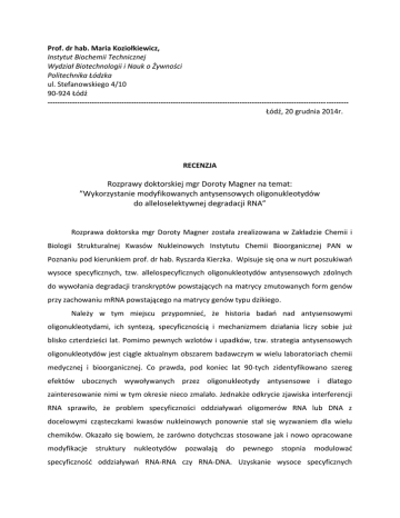 Prof. dr hab. Maria Koziołkiewicz, Instytut Biochemii Technicznej Wydział Biotechnologii i Nauk o Żywności Politechnika Łódzka ul. Stefanowskiego 4/10 90-924 Łódź -------------------------------------------------------------------------------------------------------------------------Łódź, 20 grudnia 2014r. RECENZJA Rozprawy doktorskiej mgr Doroty Magner na temat: ”Wykorzystanie modyfikowanych antysensowych oligonukleotydów do alleloselektywnej degradacji RNA” Rozprawa doktorska mgr Doroty Magner została zrealizowana w Zakładzie Chemii i Biologii Strukturalnej Kwasów Nukleinowych Instytutu Chemii Bioorganicznej PAN w Poznaniu pod kierunkiem prof. dr hab. Ryszarda Kierzka. Wpisuje się ona w nurt poszukiwań wysoce specyficznych, tzw. allelospecyficznych oligonukleotydów antysensowych zdolnych do wywołania degradacji transkryptów powstających na matrycy zmutowanych form genów przy zachowaniu mRNA powstającego na matrycy genów typu dzikiego. Należy w tym miejscu przypomnieć, że historia badań nad antysensowymi oligonukleotydami, ich syntezą, specyficznością i mechanizmem działania liczy sobie już blisko czterdzieści lat. Pomimo pewnych wzlotów i upadków, tzw. strategia antysensowych oligonukleotydów jest ciągle aktualnym obszarem badawczym w wielu laboratoriach chemii medycznej i bioorganicznej. Co prawda, pod koniec lat 90-tych zidentyfikowano szereg efektów ubocznych wywoływanych przez oligonukleotydy antysensowe i dlatego zainteresowanie nimi w tym okresie nieco zmalało. Jednakże odkrycie zjawiska interferencji RNA sprawiło, że problem specyficzności oddziaływań oligomerów RNA lub DNA z docelowymi cząsteczkami kwasów nukleinowych ponownie stał się wyzwaniem dla wielu chemików. Okazało się bowiem, że zarówno dotychczas stosowane jak i nowo opracowane modyfikacje struktury nukleotydów pozwalają do pewnego stopnia modulować specyficzność oddziaływań RNA-RNA czy RNA-DNA. Uzyskanie wysoce specyficznych oligonukleotydów antysensowych miałoby szczególne znaczenie dla hamowania ekspresji zmutowanych form genów odpowiedzialnych za niektóre choroby neurodegeneracyjne. Nowe odkrycia naukowe, które nastąpiły w ostatnich dwóch dekadach w chemii bioorganicznej kwasów nukleinowych, jak również nowa technologicznie zaawansowana aparatura badawcza, przyczyniły się ostatnio do znacznego postępu w projektowaniu i badaniu właściwości oligonukleotydów antysensowych nie tylko drugiej ale i trzeciej generacji. Celem badań realizowanych przez mgr Dorotę Magner było zaprojektowanie, synteza oraz wielokierunkowa charakterystyka odpowiednio zmodyfikowanych oligonukleotydów, które z racji swej struktury byłyby zdolne do aktywacji RNazy H w warunkach in vitro. Przystępując do realizacji projektu Doktorantka zastosowała dwie strategie projektowania oligonukleotydów; pierwszym z nich było wykorzystanie tzw. oligomerów tandemowych, z których jeden (tzw. inhibitor) nie aktywował RNazy H i wiązał się do transkryptu ”typu dzikiego” a drugi (tzw. gapmer) wiązał się w sposób selektywny do transkryptu odpowiadającego zmutowanej formie genu i aktywował RNazę H prowadząc do degradacji tego transkryptu, a tym samym do zróżnicowanej ekspresji obu alleli. Drugi sposób zastosowany przez Doktorantkę polegał na wykorzystaniu odpowiednio zmodyfikowanych oligonukleotydów (ASO), które ze względu na rodzaj modyfikacji chemicznej wykazywały się zaburzoną helikalnością i powodowały powstawanie termodynamicznie lub strukturalnie zróżnicowanych dupleksów RNA/ASO o zróżnicowanej podatności na działanie RNazy H. Te dwie koncepcje alleloselektywnej hydrolizy RNA zastosowano dla 6 przypadków substytucji nukleotydowych występujących w genach APP (Amyloid-beta Precursor Protein) SNCA (ang. Synuclein-alpha) i SOD1 (Superoxide Dysmutase 1) związanych z etiologią, odpowiednio, choroby Alzheimera, Parkinsona oraz stwardnienia zanikowego bocznego. Punktem wyjścia do pracy pani mgr Magner było zaprojektowanie i synteza blisko 150 oligonukleotydów antysensowych oraz przynajmniej 50 oligonukleotydów RNA niezbędnych do eksperymentów in vitro. Pierwszy etap badań obejmował wyznaczenie parametrów termodynamicznych (-ΔG oraz TM) dla dupleksów RNA/ASO, co pozwoliło określić ich trwałość termodynamiczną. Z kolei elektroforeza w warunkach niedenaturujących oraz metoda EMSA pozwoliły wyznaczyć stałe wiązania dupleksów RNA/ASO. Kolejny etap badań polegał na określeniu wydajności katalizowanej przez RNazę H degradacji RNA związanego z antysensowym oligonukleotydem. Wymienione wyżej metody pozwoliły wyselekcjonować najbardziej efektywne pary inhibitor-gapmer lub gapmery z zaburzoną helikalnością. Dla potwierdzenia ich efektywności w warunkach in vivo wykorzystano komórki nowotworowe linii HeLa transfekowane wektorem ekspresyjnym zawierającym gen reporterowy białka zielonej fluorescencji GFP oraz 100-nukleotydowy fragment genu APP (alternatywnie: fragment genu SNCA albo genu SOD1 zawierający analizowane substytucje nukleotydowe). Hybrydyzacja badanych ASO do RNA odpowiadającego fragmentowi badanego genu i jego degradacja powodowały uszkodzenie transkryptu genu GFP; wynikające stąd zmiany poziomu mRNA genu GFP określano w sposób jakościowy (obserwacje mikroskopowe) oraz ilościowy (metoda qPCR). Stosując opisane wyżej podejście określono alleloselektywność zaprojektowanych oligonukleotydów zarówno w warunkach in vitro jak i in vivo. Doktorantka udowodniła, że w warunkach in vivo alleloselektywność jest niższa niż w warunkach in vitro, a czynnikiem decydującym o poziomie selektywności jest na ogół stężenie oligonukleotydu. W przypadku oligonukleotydów tandemowych ich allelospecyficzność była zazwyczaj o połowę gorsza w komórkach HeLa niż w układzie izolowanym. Badania realizowane przez mgr Dorotę Magner wymagały olbrzymiego nakładu pracy i drobiazgowe