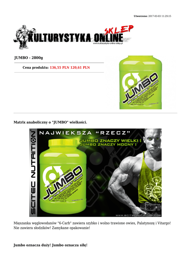 Utworzono: 2017-03-03 11:29:15 JUMBO - 2800g Cena produktu: 136,55 PLN 120,61 PLN Matrix anaboliczny o "JUMBO" wielkości. Mięszanka węglowodanów "6-Carb" zawiera szybko i wolno trawione owies, Palatynozę i Vitargo! Nie zawiera słodzików! Zamykane opakowanie! Jumbo oznacza duży! Jumbo oznacza siłę! Dowiedziono naukowo, że ludzie nie doceniają przyjmowania substancji odżywczych podczas diety ale także przeceniają faktyczną konsumpcję żywności gdy chcą zyskać masę mięśniową i siłę. Inaczej mówiąc jedzą mniej niż sądzą i potrzebują dla stałego i znacącego postępu w treningu. Każdy poszukuje złotego środka, ignorując fakt, iż nie ma niczego mocniejszego niż ciągła konsumpcja właściwych ilości kalorii, energetycznych węglowodanów i budującyc mięśnie protein. Jeśli weźmiemy pod uwagę fakt, iż wielu trenujących nie przeznacza wystarczającej ilości czasu i energii na prowadzenie dziennika diety (jako sprawdzonej metody) wtedy jedynym praktycznym rozwiązaniem jest codzienne stosowanie JUMBO ktory zapewnia w dużym stoopniu wystarczająca ilość składników odżywczych aby osiągnąć doskonałe wyniki. 50 gramów protein najwyższej jakości w jednej porcji, duża dawka szybko i wolno uwalniających się węglowodanów zapewnia zwiększone odżywianie Twojego organizmu. Jumbo zawiera szybkodziałającą serwatkę proteinową, która jest przydatna przed, w trakcie i po treningu jako recepta zawierająca najnowocześniejsze składniki odżywcze jakie zna nauka. Dodakowo reguralne odżywianie się powoduje, że substancje zawierające wolno trawioe proteiny wydzielają aminokwasy do krwioobiegu przez około 4 do 6 godzin. Z tego też powodu suplementy diety powinny zawierać szybko wchłanialne proteiny, w szczególności jeśli chcemy korzystać z nich podczas treningu z maksymalnym efektem. Jumbo nie zawiera żadnych słodzików. Wartość odżywcza: 1 porcja: 220g ( 5 miarek ) Zawartość opakowania: 2860g/13 porcji 4400g/20 porcji 8800g/40porcji Wartość energetyczna w 1 porcji: 805kcal/3381kJ SKŁAD: 100g 1 porcja %ZDS Węglowodany 68.1g 150g Cukry 16.81g 37g Białko 22.73g 50g Tłuszcz 2,72g 6g Cholesterol 22,72mg 50mg 17% Sód 30.91mg 68mg 3% Potas 55,45mg 122mg 3% 50% 100% 9% 6-CARB MATRIX - 155g Palatynoza ( stopniowo uwalniany węglowodan o niskim indeksie glikemicznym ), mąka owsiana, dekstroza, maltodekstryna, fruktoza, VITARGO ( opatentowany węglowodan o wysokiej wadze molekularnej ze szwedzkiej skrobi jęczmiennej: przeciętna waga molekularna 500000 - 70000). JUMBO-SIZE - matrix anaboliczny 8750mg zastrzeżony multi-wektorowy matrix kreatyny CREA-BOMB (jabłczan tri i dikreatyny, mikronizowany monohydrat kreatyny, ester kreatyny, orotan kreatyny, glukonian kreatyny. BCAA XPRESS - 100% czyste, aminokwasy egzogenne BCAA. - L-leucyna - L-isoleucyna - L-walinia HEMO-NO Multi-vector NO generator anabolic matrix (argigina alpha - ketoglutarate, arginina ketoisocaproate, ornithine alpha-ketoglutarate). ABSORPTION BOOSTERS - 50mg - Narnigin, Bioperine. DAWKOWANIE: Spożywać jedną pełną porcję ( pięć miarek ) dziennie w zależności od masy i aktywności fizycznej. Mozna popijać JUMBO w ciągu dnia, przed w trakcie lub po treningu. Wymięszać wybraną ilość proszku ze 100ml płynu na każdą łyżkę. Adres: http://www.ko.sklep.pl/ Telefon: kom. 782 010 880 Email: [email protected]