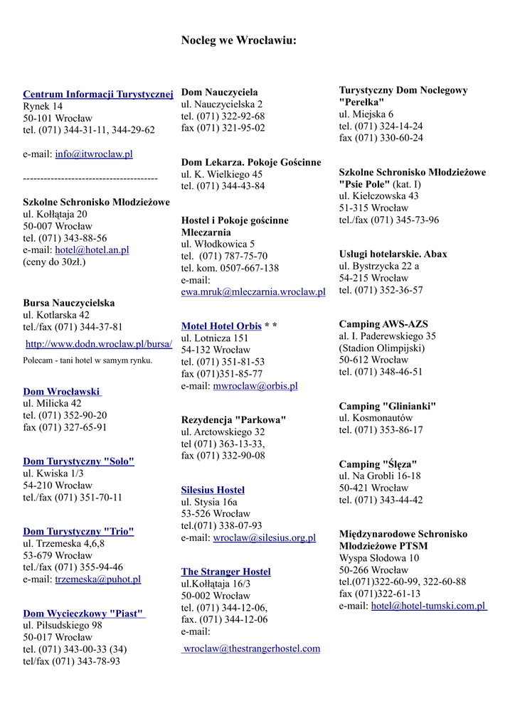 Nocleg we Wrocławiu: Centrum Informacji Turystycznej Rynek 14 50-101 Wrocław tel. (071) 344-31-11, 344-29-62 e-mail: [email protected] --------------------------------------Szkolne Schronisko Młodzieżowe ul. Kołłątaja 20 50-007 Wrocław tel. (071) 343-88-56 e-mail: [email protected] (ceny do 30zł.) Bursa Nauczycielska ul. Kotlarska 42 tel./fax (071) 344-37-81 Dom Nauczyciela ul. Nauczycielska 2 tel. (071) 322-92-68 fax (071) 321-95-02 Dom Lekarza. Pokoje Gościnne ul. K. Wielkiego 45 tel. (071) 344-43-84 Hostel i Pokoje gościnne Mleczarnia ul. Włodkowica 5 tel. (071) 787-75-70 tel. kom. 0507-667-138 e-mail: [email protected] Motel Hotel Orbis * * ul. Lotnicza 151 http://www.dodn.wroclaw.pl/bursa/ 54-132 Wrocław Polecam - tani hotel w samym rynku. tel. (071) 351-81-53 fax (071)351-85-77 e-mail: [email protected] Dom Wrocławski ul. Milicka 42 tel. (071) 352-90-20 Rezydencja "Parkowa" fax (071) 327-65-91 ul. Arctowskiego 32 Dom Turystyczny "Solo" ul. Kwiska 1/3 54-210 Wrocław tel./fax (071) 351-70-11 Dom Turystyczny "Trio" ul. Trzemeska 4,6,8 53-679 Wrocław tel./fax (071) 355-94-46 e-mail: [email protected] Dom Wycieczkowy "Piast" ul. Piłsudskiego 98 50-017 Wrocław tel. (071) 343-00-33 (34) tel/fax (071) 343-78-93 tel (071) 363-13-33, fax (071) 332-90-08 Silesius Hostel ul. Stysia 16a 53-526 Wrocław tel.(071) 338-07-93 e-mail: [email protected] The Stranger Hostel ul.Kołłątaja 16/3 50-002 Wrocław tel. (071) 344-12-06, fax. (071) 344-12-06 e-mail: [email protected] Turystyczny Dom Noclegowy "Perełka" ul. Miejska 6 tel. (071) 324-14-24 fax (071) 330-60-24 Szkolne Schronisko Młodzieżowe "Psie Pole" (kat. I) ul. Kiełczowska 43 51-315 Wrocław tel./fax (071) 345-73-96 Usługi hotelarskie. Abax ul. Bystrzycka 22 a 54-215 Wrocław tel. (071) 352-36-57 Camping AWS-AZS al. I. Paderewskiego 35 (Stadion Olimpijski) 50-612 Wrocław tel. (071) 348-46-51 Camping "Glinianki" ul. Kosmonautów tel. (071) 353-86-17 Camping "Ślęza" ul. Na Grobli 16-18 50-421 Wrocław tel. (071) 343-44-42 Międzynarodowe Schronisko Młodzieżowe PTSM Wyspa Słodowa 10 50-266 Wrocław tel.(071)322-60-99, 322-60-88 fax (071)322-61-13 e-mail: [email protected]
