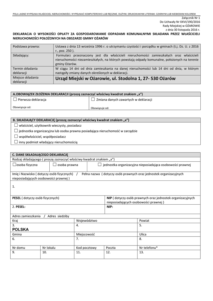 POLA JASNE WYPEŁNIA WŁAŚCICIEL NIERUCHOMOŚCI, WYPEŁNIAĆ KOMPUTEROWO LUB RĘCZNIE, DUŻYMI, DRUKOWANYMI LITERAMI, CZARNYM LUB NIEBIESKIM KOLOREM Załącznik Nr 1 Do Uchwały Nr XXVI/190/2016 Rady Miejskiej w OŻAROWIE z dnia 30 listopada 2016 r. DEKLARACJA O WYSOKOŚCI OPŁATY ZA GOSPODAROWANIE ODPADAMI KOMUNALNYMI SKŁADANA PRZEZ WŁAŚCICIELI NIERUCHOMOŚCI POŁOŻONYCH NA OBSZARZE GMINY OŻARÓW Podstawa prawna: Ustawa z dnia 13 września 1996 r. o utrzymaniu czystości i porządku w gminach (t.j. Dz. U. z 2016 r., poz. 250 ). Formularz przeznaczony jest dla właścicieli nieruchomości zamieszkałych oraz właścicieli nieruchomości niezamieszkałych, na których powstają odpady komunalne, położonych na terenie gminy Ożarów. W ciągu 14 dni od dnia zamieszkania na danej nieruchomości lub 14 dni od dnia, w którym nastąpiły zmiany danych określonych w deklaracji. Składający: Termin składania deklaracji Miejsce składania deklaracji Urząd Miejski w Ożarowie, ul. Stodolna 1, 27- 530 Ożarów A.OBOWIĄZEK ZŁOŻENIA DEKLARACJI (proszę zaznaczyć właściwy kwadrat znakiem „x”) ☐ Pierwsza deklaracja ☐ Zmiana danych zawartych w deklaracji Obowiązuje od: Obowiązuje od: B. SKŁADAJĄCY DEKLARACJĘ (proszę zaznaczyć właściwy kwadrat znakiem „x”) ☐ właściciel, użytkownik wieczysty, posiadacz ☐ jednostka organizacyjna lub osoba prawna posiadająca nieruchomość w zarządzie ☐ współwłaściciel, współposiadacz ☐ inny podmiot władający nieruchomością C. DANE SKŁADAJĄCEGO DEKLARACJĘ Rodzaj składającego ( proszę zaznaczyć właściwy kwadrat znakiem „x”) ☐osoba fizyczna ☐ osoba prawna Imię i Nazwisko ( dotyczy osób fizycznych) / nieposiadających osobowości prawnej ) ☐ jednostka organizacyjna nieposiadająca osobowości prawnej Pełna nazwa ( dotyczy osób prawnych oraz jednostek organizacyjnych 1. PESEL ( dotyczy osób fizycznych) NIP ( dotyczy osób prawnych oraz jednostek organizacyjnych nieposiadających osobowości prawnej ) NIP: 2. PESEL: Adres zamieszkania / Adres siedziby Kraj 3. Województwo 4. Powiat 5. Miejscowość 7. Ulica 8. POLSKA Gmina 6. Nr domu 9. Nr lokalu 10. Kod pocztowy 11. Poczta 12. Nr telefonu* 13. D. ADRES NIERUCHOMOŚCI, NA KTÓREJ POWSTAJĄ ODPADY KOMUNALNE Gmina Miejscowość 14. 15. 1, 2) ( jeżeli jest inny niż w części C) Ulica 16. OŻARÓW Nr domu Nr. lokalu 17. 18. Nr działki w przypadku braku numeru 19. Kod pocztowy Poczta Nr. telefonu 20. 21. 22. Dotyczy właścicieli nieruchomości, na której zamieszkują mieszkańcy Nieruchomość wskazana w części D jest: Proszę zaznaczyć właściwy kwadrat znakiem „x” ☐ zamieszkana (nieruchomość na której zamieszkują mieszkańcy) Właściciel takiej nieruchomości wypełnia dział F ☐ niezamieszkana, na której powstają odpady komunalne ( nieruchomości wykorzystywane do prowadzenia działalności gospodarczej, obiekty użyteczności publicznej, szkoły, szpitale, hotele, ogródki działkowe, targowiska itp.) ☐ w części zamieszkała oraz w części niezamieszkała, na której powstają odpady komunalne. Właściciel takiej nieruchomości wypełnia dział F, H i I. Właściciel takiej nieruchomości wypełnia dział H E. Oświadczam, że na terenie nieruchomości wskazanej w części D niniejszej deklaracji odpady będą gromadzone i 3) odbierane w sposób selektywny ( proszę zaznaczyć właściwy kwadrat znakiem „x”) ☐ TAK F. OBLICZENIE WYSOKOŚCI OPŁATY ZA GOSPODAROWANIE ODPADAMI KOMUNALNYMI ☐ NIE 4) F.1. Dotyczy właścicieli nieruchomości zabudowy jednorodzinnej 24. LICZBA OSÓB ZAMIESZKUJĄCYCH GOSPODARSTWO DOMOWE - …………………………… Odpady komunalne zbierane i odbierane w sposób selektywny ( segregowane) Miesięczna stawka od gospodarstwa Gospodarstwo domowe jednoosobowe Gospodarstwo domowe dwuosobowe Zaznaczyć x Odpady komunalne, które nie są zbierane i odbierane w sposób selektywny ( niesegregowane) Miesięczna stawka od gospodarstwa 8 zł Gospodarstwo domowe jednoosobowe 14 zł 28 zł 16 zł Gospodarstwo domowe dwuosobowe Gospodarstwo domowe trzyosobowe 24 zł Gospodarstwo domowe trzyosobowe 42 zł Gospodarstwo domowe czteroosobowe i większe 32 zł Gospodarstwo domowe czteroosobowe i większe 56 zł 25. WYSOKOŚĆ MIESIĘCZNEJ OPŁATY WYNOSI - ……………………………… Zaznaczyć x F.2. Dotyczy nieruchomości zabudowanych budynkami wielolokalowymi ODPADY ZBIERANE SELEKTYWNIE Rodzaj gospodarstwa domowego Gospodarstwo domowe jednoosobowe Gospodarstwo domowe dwuosobowe Gospodarstwo domowe trzyosobowe Gospodarstwo domowe czteroosobowe i większe Liczba gospodarstw Stawka opłaty W pozycji 28 należy wpisać kwotę opłaty z pozycji 26, 27 lub ich sumę. Miesięczna kwota opłaty 8 zł 16 zł 24 zł 32 zł Razem ODPADY ZBIERANE NIESELEKTYWNIE Rodzaj gospodarstwa domowego Gospodarstwo domowe jednoosobowe Gospodarstwo domowe dwuosobowe Gospodarstwo domowe trzyosobowe Gospodarstwo domowe czteroosobowe i większe Liczba gospodarstw 26. Stawka opłaty Miesięczna kwota opłaty 14 zł 28 zł 42 zł 56 zł Razem 27. 28. WYSOKOŚĆ MIESIĘCZNEJ OPŁATY WYNOSI - ………………….. F.3. Prowadzenie kompostownika na nieruchomości ( proszę zaznaczyć właściwy kwadrat znakiem „x” ) Deklaruję, że na terenie nieruchomości, której dotyczy deklaracja, prowadzić będę kompostownik G. Deklaracja zapotrzebowania na pojemniki i worki Deklaruję następującą ilość 60 l pojemników przeznaczonych do 110 l – magazynowania zmieszanych 120 l odpadów komunalnych 240 l ☐ Deklaruje następującą ilość worków 60l przeznaczonych do magazynowania segregowanych odpadów komunalnych papier szkło plastik 1100 l 5) H. Dotyczy tylko właścicieli nieruchomości niezamieszkanych, na których powstają odpady komunalne I. Wielkość II. Stawka opłaty za pojemnik III. Liczba pojemników, w które IV. Wysokość miesięcznej pojemników na wyposażona jest opłaty a. jeżeli B. jeżel