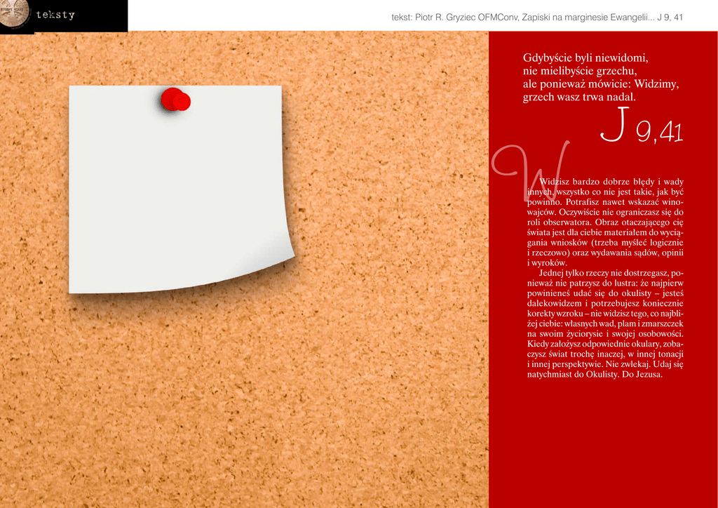 teksty tekst: Piotr R. Gryziec OFMConv, Zapiski na marginesie Ewangelii... J 9, 41 Gdybyście byli niewidomi, nie mielibyście grzechu, ale ponieważ mówicie: Widzimy, grzech wasz trwa nadal. W J 9,41 Widzisz bardzo dobrze błędy i wady innych, wszystko co nie jest takie, jak być powinno. Potrafisz nawet wskazać winowajców. Oczywiście nie ograniczasz się do roli obserwatora. Obraz otaczającego cię świata jest dla ciebie materiałem do wyciągania wniosków (trzeba myśleć logicznie i rzeczowo) oraz wydawania sądów, opinii i wyroków. Jednej tylko rzeczy nie dostrzegasz, ponieważ nie patrzysz do lustra: że najpierw powinieneś udać się do okulisty – jesteś dalekowidzem i potrzebujesz koniecznie korekty wzroku – nie widzisz tego, co najbliżej ciebie: własnych wad, plam i zmarszczek na swoim życiorysie i swojej osobowości. Kiedy założysz odpowiednie okulary, zobaczysz świat trochę inaczej, w innej tonacji i innej perspektywie. Nie zwlekaj. Udaj się natychmiast do Okulisty. Do Jezusa.