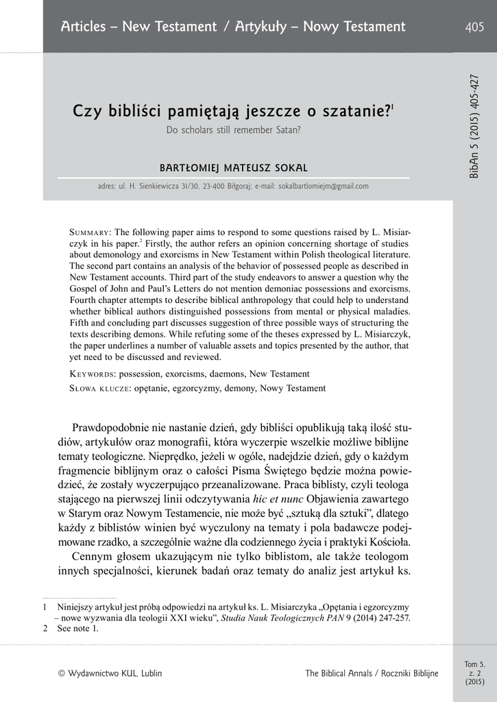 Czy bibliści pamiętają jeszcze o szatanie?1 Do scholars still remember Satan? BARTŁOMIEJ MATEUSZ SOKAL 405 BibAn 5 (2015) 405-427 Articles – New Testament / Artykuły – Nowy Testament adres: ul. H. Sienkiewicza 31/30, 23-400 Biłgoraj; e-mail: [email protected] S u m m a ry : The following paper aims to respond to some questions raised by L. Misiarczyk in his paper.2 Firstly, the author refers an opinion concerning shortage of studies about demonology and exorcisms in New Testament within Polish theological literature. The second part contains an analysis of the behavior of possessed people as described in New Testament accounts. Third part of the study endeavors to answer a question why the Gospel of John and Paul’s Letters do not mention demoniac possessions and exorcisms. Fourth chapter attempts to describe biblical anthropology that could help to understand whether biblical authors distinguished possessions from mental or physical maladies. Fifth and concluding part discusses suggestion of three possible ways of structuring the texts describing demons. While refuting some of the theses expressed by L. Misiarczyk, the paper underlines a number of valuable assets and topics presented by the author, that yet need to be discussed and reviewed. K ey wor ds: possession, exorcisms, daemons, New Testament S łowa k lucze : opętanie, egzorcyzmy, demony, Nowy Testament Prawdopodobnie nie nastanie dzień, gdy bibliści opublikują taką ilość studiów, artykułów oraz monografii, która wyczerpie wszelkie możliwe biblijne tematy teologiczne. Nieprędko, jeżeli w ogóle, nadejdzie dzień, gdy o każdym fragmencie biblijnym oraz o całości Pisma Świętego będzie można powie dzieć, że zostały wyczerpująco przeanalizowane. Praca biblisty, czyli teologa stającego na pierwszej linii odczytywania hic et nunc Objawienia zawartego w Starym oraz Nowym Testamencie, nie może być „sztuką dla sztuki”, dlatego każdy z biblistów winien być wyczulony na tematy i pola badawcze podejmowane rzadko, a szczególnie ważne dla codziennego życia i praktyki Kościoła. Cennym głosem ukazującym nie tylko biblistom, ale także teologom innych specjalności, kierunek badań oraz tematy do analiz jest artykuł ks. 1 Niniejszy artykuł jest próbą odpowiedzi na artykuł ks. L. Misiarczyka „Opętania i egzorcyzmy – nowe wyzwania dla teologii XXI wieku”, Studia Nauk Teologicznych PAN 9 (2014) 247-257. 2 See note 1. © Wydawnictwo KUL , Lublin The Biblical Annals / Roczniki Biblijne Tom 5, z. 2 (2015) 406 Bartłomiej Mateusz Sokal A rticles – NT L. Misiarczyka „Opętania i egzorcyzmy – nowe wyzwania dla teologii XXI wieku”. Podjętych zostało w nim wiele ważnych tematów, które wymagają zarówno pracy badawczej, skorelowania doświadczeń, oraz wymiany poglądów, jak i medytacji w polskim świecie teologicznym. Dużą część pierwszego paragrafu zatytułowanego „Refleksja historyczno-teologiczna” zajmuje wskazanie pól badawczych, które dotyczą pracy biblistów. Autor wskazuje braki w polskiej bibliografii biblijnej i stawia ważne pytania dotyczące natury opętania oraz egzorcyzmów w przekazach biblijnych. Wymienić można pięć najważniejszych problemów badawczych postawionych przez ks. L. Misiarczyka, do których odniesiemy się w niniejszym artykule: (1) brak opracowań; (2) pytanie o znaczenie zachowania ludzi opętanych; (3) milczenie Listów Pawłowych oraz Ewangelii Jana na temat egzorcyzmów; (4) pytanie o sposób rozumienia ewangelicznych narracji przedstawiających opętania oraz (5) proponowana próba podziału tekstów opisujących egzorcyzmy. Na początek trzeba zwrócić uwagę na problem terminologiczny, który utrudnia dotarcie do meritum wymienionych dalej zadań badawczych zarysowanych przez autora. W pierwszych zdaniach artykułu mowa jest o „zupełnym braku badań nad egzorcyzmami w Starym i Nowym Testamencie”. Jeżeli rozumie się przez to brak przyczynków naukowych (artykułów) zawierających analizy określonych tekstów biblijnych, to jest to opinia wielce przesadzona, co pokażemy poprzez podanie artykułów wpisujących się w polską powojenną literaturę biblijną odnośnie do każdego z tekstów ewangelicznych. Jeżeli zaś autor poszukuje opracowań szerszych (przekrojowych), które analizują temat egzorcyzmów w określonym kluczu lub z danej perspektywy teologicznej, to one także zostaną wskazane. Należy jednak pamiętać, że pojęcie „opracowania kompleksowego” jest tak szerokie, że wręcz niemożliwe jest stworzenie studium, które obejmowałoby wszystkie aspekty związane z tematami demonologii oraz egzorcyzmów w Starym i Nowym Testamencie3. 1. Brak opracowań Pierwszy i najpoważniejszy zarzut stawiany polskiej biblistyce to brak dostępnych analiz tekstów opisujących egzorcyzmy, a także brak opracowań 3 Vol. 5, no. 2 (2015) Warto wskazać jeszcze jedną, niecytowaną przez ks. L. Misiarczyka, a opublikowaną niedawno w języku angielskim pozycję bibliograficzną dotyczącą egzorcystycznej działalności Jezusa: A. Witmer, Jesus, the Galilean Exorcist. His Exorcisms in Social and Political Context (Library of New Testament Studies. Library of the Historical Jesus Studies 10; London 2012). The Biblical Annals / Roczniki Biblijne 407 Czy bibliści pamiętają jeszcze o szatanie? dotyczących problematyki egzorcyzmów oraz demonologii. Autor pisze w następujący sposób:4 W przypisie do pierwszego z zacytowanych zdań autor polemizuje z opinią jednego z recenzentów, który twierdzi, że istnieją studia tego zagadnienia5. Zgadzając się ze stwierdzeniem, że brak jest kompleksowych opracowań na temat demonologii w języku polskim, trudno zaakceptować spostrzeżenie, że powstałe dopiero w ostatnich latach pozycje są „wstępnymi rozważa niami”. O ile także niemożliwe jest zgodzenie się ze stwierdzeniem, że każde zagadnienie teologiczne zostało opracowane w kontekście Pisma Święte