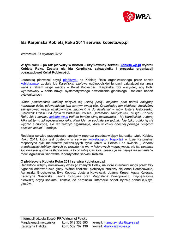 Ida Karpińska Kobietą Roku 2011 serwisu kobieta.wp.pl Warszawa, 31 stycznia 2012 W tym roku – po raz pierwszy w historii – użytkownicy serwisu kobieta.wp.pl wybrali Kobietę Roku. Została nią Ida Karpińska, założycielka i prezeska organizacji pozarządowej Kwiat Kobiecości. Laureatką pierwszej edycji plebiscytu na Kobietę Roku organizowanego przez serwis kobieta.wp.pl została Ida Karpińska, szefowa ogólnopolskiej fundacji działającej na rzecz walki z rakiem szyjki macicy – Kwiat Kobiecości. Karpińska robi wszystko, aby Polki wypracowały w sobie nawyk systematycznego odwiedzania ginekologa i robienia badań cytologicznych. „Choć powszechnie kobiety nazywa się „słabą płcią”, niejedna pani potrafi osiągnąć naprawdę dużo, udowadniając tym samym swoją siłę. Organizując ten plebiscyt chciałyśmy zainspirować nasze użytkowniczki, zachęcić je do działania” – mówi Estera Gabczenko, Kierownik Działu Styl Życia w Wirtualnej Polsce. „Internauci zdecydowali, że tytuł Kobiety Roku 2011 serwisu kobieta.wp.pl trafi do bardzo silnej osobowości – Idy Karpińskiej, u której kilka lat temu zdiagnozowano raka. Pani Ida nie poddała się jednak. Nie tylko udało jej się wygrać z chorobą, ale też założyć organizację, która w chwili obecnej pomaga tysiącom polskich kobiet” – dodaje. Redakcja serwisu przygotowała specjalny reportaż przedstawiający laureatkę tytułu Kobiety Roku 2011, który jest dostępny w serwisie kobieta.wp.pl. Reportaż o Idzie Karpińskiej rozpoczyna cykl materiałów pokazujących życie kobiet w Polsce i na świecie. „Chcemy przedstawiać kobiety, których co prawda nie ma w kolorowych magazynach, ale ich postawa życiowa jest godna naśladowania, a to co robią i jak żyją, zasługuje na najwyższe uznanie” – mówi Agnieszka Sadowska, Koordynator Serwisu Kobieta. O plebiscycie Kobieta Roku 2011 serwisu kobieta.wp.pl Redaktorki witryny nominowały dziesięć znanych Polek, na które internauci mogli przez trzy tygodnie oddawać swe głosy. Wśród finalistek plebiscytu znalazły się Anna Dereszowska, Agnieszka Grochowska, Ewa Kopacz, Justyna Kowalczyk, Joanna Krupa, Agata Kulesza, Katarzyna Nosowska, Janina Ochojska oraz Magdalena Prokopowicz. Zwyciężczynią pierwszej edycji konkursu została Ida Karpińska. Internauci oddali łącznie ponad 8,6 tys. głosów. Informacji udziela Zespół PR Wirtualnej Polski: Magdalena Zmorzyńska kom. 519 336 593 Katarzyna Halicka kom. 502 707 138 e-mail: [email protected] e-mail: [email protected]