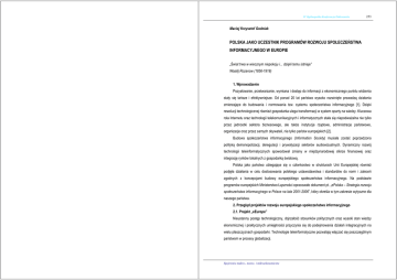 IV Ogólnopolska Konferencja Doktorantów 253 Maciej Krzysztof Godniak POLSKA JAKO UCZESTNIK PROGRAMÓW ROZWOJU SPOŁECZEŃSTWA INFORMACYJNEGO W EUROPIE „Świat trwa w wiecznym niepokoju i... dzięki temu istnieje” Wasilij Rozanow (1856-1919) 1. Wprowadzenie Pozyskiwanie, przetwarzanie, wymiana i dostęp do informacji z ekonomicznego punktu widzenia stały się tańsze i efektywniejsze. Od ponad 20 lat państwa wysoko rozwinięte prowadzą działania zmierzające do budowania i normowania tzw. systemu społeczeństwa informacyjnego [1]. Dzięki rewolucji technologicznej również gospodarka ulega transformacji w system oparty na wiedzy. Kluczowa rola Internetu oraz technologii telekomunikacyjnych i informatycznych stała się niepodważalna nie tylko przez jednostki sektora biznesowego, ale także instytucje rządowe, administracje państwowe, organizacje oraz przez samych obywateli, nie tylko państw europejskich [2]. Budowa społeczeństwa informacyjnego (Information Society) musiała zostać poprzedzona polityką demonopolizacji, deregulacji i prywatyzacji sektorów audiowizualnych. Dynamiczny rozwój technologii teleinformatycznych spowodował zmiany w międzynarodowej sferze finansowej oraz integrację rynków lokalnych z gospodarką światową. Polska jako państwo ubiegające się o członkostwo w strukturach Unii Europejskiej również podjęła działania w celu dostosowania polskiego ustawodawstwa i standardów do norm i zaleceń zgodnych z koncepcjami budowy europejskiego społeczeństwa informacyjnego. Na podstawie programów europejskich Ministerstwo Łączności opracowało dokument pt. „ePolska – Strategia rozwoju społeczeństwa informacyjnego w Polsce na lata 2001-2006”, który określa w tym zakresie wytyczne dla naszego państwa. 2. Przegląd projektów rozwoju europejskiego społeczeństwa informacyjnego 2.1. Projekt „eEurope” Nieustanny postęp technologiczny, dojrzałość stosunków politycznych oraz wysoki stan wiedzy ekonomicznej i praktycznych umiejętności przyczynia się do podejmowania działań integracyjnych na wielu płaszczyznach gospodarki. Technologie teleinformatyczne pozwalają włączać się poszczególnym państwom w procesy globalizacji. Spojrzenie makro-, mezzo- i mikroekonomiczne IV Ogólnopolska Konferencja Doktorantów 254 Tabela 1. Szczegółowe punkty do realizacji w ramach planu „eEurope2002” Do transformacji państw Europy w jedną zintegrowaną globalną „euro-wioskę” przyczynia się szereg różnych inicjatyw i przedsięwzięć podejmowanych przez instytucje i organizacje. Pierwsze koncepcje budowy społeczeństwa informacyjnego w Europie Zachodniej pojawiły się w 1979 roku. W grudniu 1999 roku Unia Europejska pod przewodnictwem Romano Prodi ogłosiła zapoczątkowanie otwartego programu pod nazwą „eEurope – An Information Society for All”. Dokument ten precyzował ramy działań mających na celu szybki rozwój społeczeństwa informacyjnego w wymiarze Unii Europejskiej oraz poszczególnych państw, w tym również kandydatów do akcesji. W marcu 2000 roku na posiedzeniu Rady Unii Europejskiej w Lizbonie przyjęto tzw. strategię lizbońską, która postuluje 255 Tańszy, szybszy i bezpieczny Internet tańszy i szybszy dostęp do Internetu szybki Internet dla ośrodków badawczych i naukowych bezpieczne sieci i inteligentne karty (smart cards) budowę do 2010 roku „najbardziej konkurencyjnej i dynamicznej, bazującej na wiedzy gospodarki Inwestowanie w ludzi i umiejętności młodzież Europy w erze cyfrowej praca w gospodarce opartej na wiedzy (knowledgebased economy) powszechne korzystanie z gospodarki opartej na wiedzy świata, zdolnej do proporcjonalnego wzrostu ekonomicznego, oferującej więcej lepszych miejsc pracy oraz większą spójność społeczną”. Wówczas uznano realizację koncepcji „eEurope” jako jedno z Pobudzanie wykorzystania Internetu przyspieszenie elektronicznej gospodarki e-government: elektroniczny dostęp obywateli do usług publicznych służba zdrowia on-line zawartość cyfrowa w sieciach globalnych inteligentny system transportu najważniejszych działań w celu budowy nowoczesnej gospodarki europejskiej opartej na wiedzy. Na Plan „eEurope2002” zakładał realizację powyższych celów do końca 2002 roku, jednak w 2003 ministerialnej konferencji „Information Society - Accelerating European Integration” w maju 2000 roku roku okazało się, że przebiegają one zdecydowanie wolniej niż wcześniej oczekiwano. Przede Polska i inne kraje kandydujące do Unii Europejskiej zadeklarowała uwzględnienie we własnych wszystkim zwrócono uwagę krajom Europy Wschodniej, w tym Polsce, na szybsze uregulowanie projektach budowania społeczeństwa opartego na wiedzy postulatów zawartych w ramach „eEurope”, tj. procesów legislacyjnych dotyczących telekomunikacji, praw autorskich i podatku VAT w handlu dążących do integracji również na tej płaszczyźnie. elektronicznym oraz na odpowiednie przygotowywanie grup informatycznych i osób zdolnych do Na realizację projektu „eEurope” Komisja Europejska nie przeznaczała specjalnych środków finansowych. Nie została także utworzona żadna instytucja koordynująca, jednak osiągnięcie umiejętnego stosowania narzędzi informatycznych (także w organach administracji państwowej). 2.3. Program „eContent” wyznaczonych w projekcie celów znajduje się w obszarze zainteresowań wielu uczestników rynków Celem programu „eContent” jest pomoc w tworzeniu, wykorzystywaniu i dystrybucji treści integrujących się. Realizacją programu „eEurope” zainteresowane są przede wszystkim następujące cyfrowych, a także promocja zróżnicowania językowego i kulturowego w globalnej sieci internetowej. grupy: Pod pojęciem treści cyfrowych rozumie się tu każdy rodzaj informacji publikowanej na dowolnej operatorzy i dostawcy branży IT, platformie internetowej, począwszy od tradycyjnych stron WWW, poprzez kom