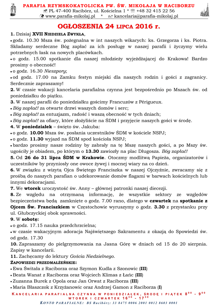 PARAFIA RZYMSKOKATOLICKA PW. ŚW. MIKOŁAJA W RACIBORZU PL 47-400 Racibórz, ul. Kościelna 1 * +48 32 415 22 56 www.parafia-mikolaj.pl * [email protected] OGŁOSZENIA 24 LIPCA 2016 r. 1. Dzisiaj XVII NIEDZIELA ZWYKŁA, godz. 10.30 Msza św. pożegnalna w int naszych wikarych: ks. Grzegorza i ks. Piotra. Składamy serdeczne Bóg zapłać za ich posługę w naszej parafii i życzymy wielu potrzebnych łask na nowych placówkach. o godz. 15.00 spotkanie dla naszej młodzieży wyjeżdżającej do Krakowa! Bardzo prosimy o obecność! o godz. 16.30 Nieszpory; od godz. 17.00 na Zamku festyn miejski dla naszych rodzin i gości z zagranicy. Serdecznie zapraszamy! 2. W czasie wakacji kancelaria parafialna czynna jest bezpośrednio po Mszach św. od poniedziałku do piątku. 3. W naszej parafii do poniedziałku gościmy Francuzów z Périgueux. Bóg zapłać! za otwarte drzwi waszych domów i serc; Bóg zapłać! za entuzjazm, radość i waszą obecność w tych dniach; Bóg zapłać! za ofiary, które złożyliście na ŚDM i przyjęcie naszych gości w środę. 4. W poniedziałek – święto św. Jakuba: o godz. 10.00 Msza św. posłania uczestników ŚDM w kościele NSPJ; o godz. 11.30 wyjazd na ŚDM spod kościoła NSPJ; bardzo prosimy nasze rodziny by zabrały na tę Mszę naszych gości, a po Mszy św. ugościły je obiadem, po którym o 13.30 zawiozły na plac Długosza. Bóg zapłać! 5. Od 26 do 31 lipca ŚDM w Krakowie. Otoczmy modlitwą Papieża, organizatorów i uczestników by przyniosły one owoce żywej i mocnej wiary na co dzień. 6. W związku z wizytą Ojca Świętego Franciszka w naszej Ojczyźnie, zwracamy się z prośbą do naszych parafian o udekorowanie domów flagami w barwach kościelnych lub innymi dekoracjami. 7. We wtorek uroczystość św. Anny – głównej patronki naszej diecezji. 8. Ze względu na otrzymaną informację, że wszystkie sektory ze względów bezpieczeństwa będą zamknięte o godz. 7.00 rano, dlatego w czwartek na spotkanie z Ojcem Św. Franciszkiem w Częstochowie wyruszymy o godz. 3.30 z przystanku przy ul. Głubczyckiej obok sprawności. 9. W sobotę: o godz. 17.15 nauka przedchrzcielna; w czasie wakacyjnym adoracja Najświętszego Sakramentu z okazją do Spowiedzi św. od godz. 17.30 10. Zapraszamy do pielgrzymowania na Jasna Górę w dniach od 15 do 20 sierpnia. Zapisy w kancelarii. 11. Zachęcamy do lektury Gościa Niedzielnego. ZAPOWIEDZI PRZEDMAŁŻEŃSKIE: Ewa Świtała z Raciborza oraz Szymon Kudla z Szonowic (III) Beata Wanat z Raciborza oraz Wojciech Klimas z Łańc (III) Zuzanna Burek z Opola oraz Jan Orwat z Raciborza (III) Maria Błaszczok z Krzyżanowic oraz Andrzej Gamon z Raciborza (I) K A N C E L A R I A PA R A F I A L N A C Z Y N N A W PO N I E D Z I A Ł E K , ŚR O D Ę I PI Ą T E K 800 - 900 3 0 W T OREK I CZ W ART EK 16 - 1730 KONTO PARAFIALNE: BS Racibórz: 33 8475 0006 2001 0012 8603 0001