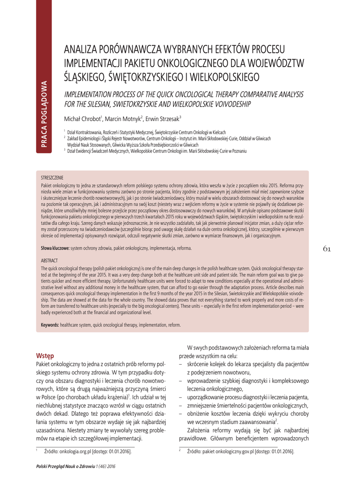PRACA POGLĄDOWA ANALIZA PORÓWNAWCZA WYBRANYCH EFEKTÓW PROCESU IMPLEMENTACJI PAKIETU ONKOLOGICZNEGO DLA WOJEWÓDZTW ŚLĄSKIEGO, ŚWIĘTOKRZYSKIEGO I WIELKOPOLSKIEGO IMPLEMENTATION PROCESS OF THE QUICK ONCOLOGICAL THERAPY COMPARATIVE ANALYSIS FOR THE SILESIAN, SWIETOKRZYSKIE AND WIELKOPOLSKIE VOIVODESHIP Michał Chrobot1, Marcin Motnyk2, Erwin Strzesak3 1 2 3 Dział Kontraktowania, Rozliczeń i Statystyki Medycznej, Świętokrzyskie Centrum Onkologii w Kielcach Zakład Epidemiologii i Śląski Rejestr Nowotworów, Centrum Onkologii – Instytut im. Marii Skłodowskiej-Curie, Oddział w Gliwicach Wydział Nauk Stosowanych, Gliwicka Wyższa Szkoła Przedsiębiorczości w Gliwicach Dział Ewidencji Świadczeń Medycznych, Wielkopolskie Centrum Onkologii im. Marii Skłodowskiej-Curie w Poznaniu STRESZCZENIE Pakiet onkologiczny to jedna ze sztandarowych reform polskiego systemu ochrony zdrowia, która weszła w życie z początkiem roku 2015. Reforma przyniosła wiele zmian w funkcjonowaniu systemu zarówno po stronie pacjenta, który zgodnie z podstawowym jej założeniem miał mieć zapewnione szybsze i skuteczniejsze leczenie chorób nowotworowych), jak i po stronie świadczeniodawcy, który musiał w wielu obszarach dostosować się do nowych warunków na poziomie tak operacyjnym, jak i administracyjnym na swój koszt (niestety wraz z wejściem reformy w życie w systemie nie pojawiły się dodatkowe pieniądze, które umożliwiłyby mniej bolesne przejście przez początkowy okres dostosowawczy do nowych warunków). W artykule opisano podstawowe skutki funkcjonowania pakietu onkologicznego w pierwszych trzech kwartałach 2015 roku w województwach śląskim, świętokrzyskim i wielkopolskim na tle rezultatów dla całego kraju. Szereg danych wskazuje jednoznacznie, że nie wszystko zadziałało, tak jak pierwotnie planował inicjator zmian, a duży ciężar reformy został przerzucony na świadczeniodawców (szczególnie biorąc pod uwagę skalę działań na duże centra onkologiczne), którzy, szczególnie w pierwszym okresie od implementacji opisywanych rozwiązań, odczuli negatywnie skutki zmian, zarówno w wymiarze finansowym, jak i organizacyjnym. Słowa kluczowe: system ochrony zdrowia, pakiet onkologiczny, implementacja, reforma. ABSTRACT The quick oncological therapy (polish pakiet onkologiczny) is one of the main deep changes in the polish healthcare system. Quick oncological therapy started at the beginning of the year 2015. It was a very deep change both at the healthcare unit side and patient side. The main reform goal was to give patients quicker and more efficient therapy. Unfortunately healthcare units were forced to adapt to new conditions especially at the operational and administrative level without any additional money in the healthcare system, that can afford to go easier through the adaptation process. Article describes main consequences quick oncological therapy implementation in the first 9 months of the year 2015 in the Silesian, Swietokrzyskie and Wielokopolskie voivodeship. The data are showed at the data for the whole country. The showed data proves that not everything started to work properly and more costs of reform are transferred to healthcare units (especially to the big oncological centers). These units – especially in the first reform implementation period – were badly experienced both at the financial and organizational level. Keywords: healthcare system, quick oncological therapy, implementation, reform. Pakiet onkologiczny to jedna z ostatnich prób reformy polskiego systemu ochrony zdrowia. W tym przypadku dotyczy ona obszaru diagnostyki i leczenia chorób nowotworowych, które są drugą najważniejszą przyczyną śmierci w Polsce (po chorobach układu krążenia)1. Ich udział w tej niechlubnej statystyce znacząco wzrósł w ciągu ostatnich dwóch dekad. Dlatego też poprawa efektywności działania systemu w tym obszarze wydaje się jak najbardziej uzasadniona. Niestety zmiany te wywołały szereg problemów na etapie ich szczegółowej implementacji. W swych podstawowych założeniach reforma ta miała przede wszystkim na celu: – skrócenie kolejek do lekarza specjalisty dla pacjentów z podejrzeniem nowotworu, – wprowadzenie szybkiej diagnostyki i kompleksowego leczenia onkologicznego, – uporządkowanie procesu diagnostyki i leczenia pacjenta, – zmniejszenie śmiertelności pacjentów onkologicznych, – obniżenie kosztów leczenia dzięki wykryciu choroby we wczesnym stadium zaawansowania2. Założenia reformy wydają się być jak najbardziej prawidłowe. Głównym beneficjentem wprowadzonych 1 2 Wstęp Źródło: onkologia.org.pl [dostęp: 01.01.2016]. Polski Przegląd Nauk o Zdrowiu 1 (46) 2016 Źródło: pakiet onkologiczny.gov.pl [dostęp: 01.01.2016]. 61 zmian ma zostać najważniejszy podmiot systemu ochrony zdrowia, jakim jest pacjent. W artykule podjęto próbę oceny implementacji opisanych wyżej rozwiązań w trzech województwach: śląskim, świętokrzyskim i wielkopolskim, na tle statystyk dotyczących całego kraju, w pierwszych trzech kwartałach 2015 roku. Analizy dokonano na podstawie danych statystycznych dotyczących realizacji pakietu onkologicznego w Polsce, otrzymanych z Centrali NFZ oraz poszczególnych oddziałów wojewódzkich NFZ. Idea, założenia i podstawowe dane dotyczące pakietu onkologicznego 62 Pod potocznie używaną nazwą „pakiet onkologiczny” kryje się zbiór regulacji, które, wprowadzone od 1 stycznia 2015 roku, zasadniczo zmieniły organizację diagnostyki i leczenia onkologicznego w Polsce. Kluczowym aktem prawnym pakietu jest Ustawa z dnia 22 lipca 2014 r. o zmianie ustawy o świadczeniach opieki zdrowotnej finansowanych ze środków publicznych oraz niektórych innych ustaw 3, na podstawie której wydano rozporządzenia Ministra Zdrowia4. Natomiast szczegółowe kwestie w zakresie realizacji pakietu onkologicznego określają wydane przez Prezesa NFZ zarządzenia o numerach: