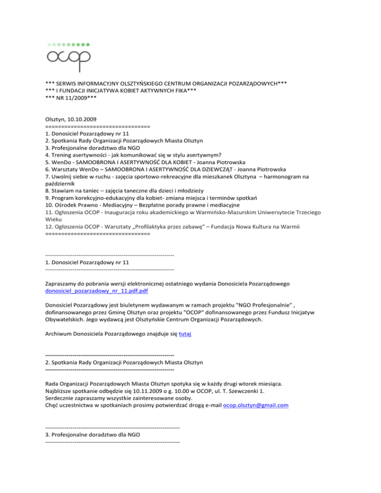 *** SERWIS INFORMACYJNY OLSZTYOSKIEGO CENTRUM ORGANIZACJI POZARZĄDOWYCH*** *** I FUNDACJI INICJATYWA KOBIET AKTYWNYCH FIKA*** *** NR 11/2009*** Olsztyn, 10.10.2009 ================================= 1. Donosiciel Pozarządowy nr 11 2. Spotkania Rady Organizacji Pozarządowych Miasta Olsztyn 3. Profesjonalne doradztwo dla NGO 4. Trening asertywności - jak komunikowad się w stylu asertywnym? 5. WenDo - SAMOOBRONA I ASERTYWNOŚD DLA KOBIET - Joanna Piotrowska 6. Warsztaty WenDo – SAMOOBRONA I ASERTYWNOŚD DLA DZIEWCZĄT - Joanna Piotrowska 7. Uwolnij siebie w ruchu - zajęcia sportowo-rekreacyjne dla mieszkanek Olsztyna – harmonogram na październik 8. Stawiam na taniec – zajęcia taneczne dla dzieci i młodzieży 9. Program korekcyjno-edukacyjny dla kobiet- zmiana miejsca i terminów spotkao 10. Ośrodek Prawno - Mediacyjny – Bezpłatne porady prawne i mediacyjne 11. Ogłoszenia OCOP - Inauguracja roku akademickiego w Warmiosko-Mazurskim Uniwersytecie Trzeciego Wieku 12. Ogłoszenia OCOP - Warsztaty „Profilaktyka przez zabawę” – Fundacja Nowa Kultura na Warmii ================================= -----------------------------------------------------------------1. Donosiciel Pozarządowy nr 11 -----------------------------------------------------------------Zapraszamy do pobrania wersji elektronicznej ostatniego wydania Donosiciela Pozarządowego donosiciel_pozarzadowy_nr_11.pdf.pdf Donosiciel Pozarządowy jest biuletynem wydawanym w ramach projektu "NGO Profesjonalnie" , dofinansowanego przez Gminę Olsztyn oraz projektu "OCOP" dofinansowanego przez Fundusz Inicjatyw Obywatelskich. Jego wydawcą jest Olsztyoskie Centrum Organizacji Pozarządowych. Archiwum Donosiciela Pozarządowego znajduje się tutaj -----------------------------------------------------------------2. Spotkania Rady Organizacji Pozarządowych Miasta Olsztyn -----------------------------------------------------------------Rada Organizacji Pozarządowych Miasta Olsztyn spotyka się w każdy drugi wtorek miesiąca. Najbliższe spotkanie odbędzie się 10.11.2009 o g. 10.00 w OCOP, ul. T. Szewczenki 1. Serdecznie zapraszamy wszystkie zainteresowane osoby. Chęd uczestnictwa w spotkaniach prosimy potwierdzad drogą e-mail [email protected] --------------------------------------------------------------------3. Profesjonalne doradztwo dla NGO --------------------------------------------------------------------- Zapraszamy do korzystania z profesjonalnego doradztwa dla organizacji pozarządowych: We wtorki g.17.00-19.00 (prosimy o zgłoszenie chęci przybycia na [email protected] lub telefonicznie pod numerem 512558349) lub po umówieniu terminu na [email protected] Natomiast osoby zajmujące się w organizacji sprawami księgowymi i finansowymi zapraszamy do skorzystania z bezpłatnego doradztwa w Olsztyoskim Centrum Organizacji Pozarządowych Tematy konsultacji: podstawy księgowości plan kont wynagrodzenia i ZUS sprawozdawczośd finansowa We wtorki g.17.00-19.00 Miejsce: Olsztyoskie Centrum Organizacji Pozarządowych, ul. Tarasa Szewczenki 1, 10-274 Olsztyn mapa Doradztwo jest organizowane przez Olsztyoskie Centrum Organizacji Pozarządowych dofinansowane przez Ministerstwo Pracy i Polityki Społecznej w ramach Funduszu Inicjatyw Obywatelskich, Samorząd Województwa Warmiosko-Mazurskiego oraz projekt "NGO Profesjonalnie" dofinansowany przez Gminę Olsztyn. Realizatorzy projektu: Związek Stowarzyszeo "Razem w Olsztynie", Fundacja „Inicjatywa Kobiet Aktywnych” FIKA Warmiosko-Mazurski Sejmik Osób Niepełnosprawnych. -----------------------------------------------------------------4. Trening asertywności – jak komunikowad się w stylu asertywnym? -----------------------------------------------------------------Fundacja „Inicjatywa Kobiet Aktywnych” FIKA zaprasza na szkolenie pt. „Trening asertywności – jak komunikowad się w stylu asertywnym? Celem szkolenia: jest kształtowanie umiejętności komunikowania się w stylu asertywnym, niezbędnych w relacjach z innymi. Ważne słowa kluczowe: pewnośd siebie (autentyczna), poczucie własnej wartości i godności, szacunek dla siebie i innych, realizacja własnych potrzeb i praw bez naruszania godności innych, szczerośd, swoboda i aktywne rozumienie tego, co się dzieje (świadomośd własnych i ew. cudzych emocji). Elegancja działania. Prowadząca: Agnieszka Lisikiewicz: zawodowo: zajmuje się organizacją i prowadzeniem szkoleo z zakresu aktywizacji zawodowej, komunikacji interpersonalnej oraz asertywności prywatnie: wyznaje zasadę, że odnalezienie pozytywnych stron życia nie zabiera więcej czasu niż odnalezienie tych złych. Korzyści ze szkolenia: - rozwijanie umiejętności wyrażania swoich opinii, uczud, potrzeb i próśb - sztuka mówienia bez poczucia winy - wyrażanie się poprzez komunikat „ja” - poznanie technik asertywnych - szacunek dla siebie i innych Szkolenie adresowane jest do wszystkich osób, które pragną doskonalid swoje umiejętności zachowywania się w sposób asertywny, przydatny zarówno w pracy jak i w domu. Zajęcia prowadzone będą metodami pobudzającymi aktywnośd uczestników, takimi jak: pogadanka, praca indywidualna, praca w grupach, dyskusja, burza mózgów, odgrywanie ról. Więcej na: opis Czas: 09 – 10 listopada 2009, g. 9:00-15:45 (z przerwami na poczęstunek) Miejsce: Olsztyoskie Centrum Organizacji Pozarządowych, ul Tarasa Szewczenki 1, 10-274 Olsztyn mapa Szkolenie jest nieodpłatne. zapisy --------------------------------------------------------------------5. WenDo - SAMOOBRONA I ASERTYWNOŚD DLA KOBIET - Joanna Piotrowska --------------------------------------------------------------------Fundacja "Inicjatywa Kobiet Aktywnych” FIKA w partnerstwie ze Szkołą Chioskich Sztuk Walki SHAOLIN oraz Feminoteką zapraszają na zajęcia WenDo dla Kobiet, które przeprowadzi Joanna Piotrowska. WenDo jest: metodą przeciwdziałania przemocy wobec kobiet. Uczy jak w każdej sytuacji: w miejscu publi