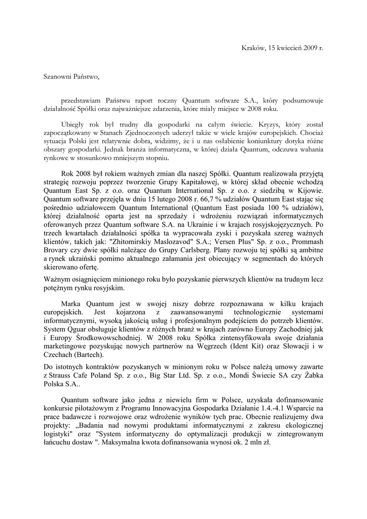 Kraków, 15 kwiecień 2009 r. Szanowni Państwo, przedstawiam Państwu raport roczny Quantum software S.A., który podsumowuje działalność Spółki oraz najwaŜniejsze zdarzenia, które miały miejsce w 2008 roku. Ubiegły rok był trudny dla gospodarki na całym świecie. Kryzys, który został zapoczątkowany w Stanach Zjednoczonych uderzył takŜe w wiele krajów europejskich. ChociaŜ sytuacja Polski jest relatywnie dobra, widzimy, Ŝe i u nas osłabienie koniunktury dotyka róŜne obszary gospodarki. Jednak branŜa informatyczna, w której działa Quantum, odczuwa wahania rynkowe w stosunkowo mniejszym stopniu. Rok 2008 był rokiem waŜnych zmian dla naszej Spółki. Quantum realizowała przyjętą strategię rozwoju poprzez tworzenie Grupy Kapitałowej, w której skład obecnie wchodzą Quantum East Sp. z o.o. oraz Quantum International Sp. z o.o. z siedzibą w Kijowie. Quantum software przejęła w dniu 15 lutego 2008 r. 66,7 % udziałów Quantum East stając się pośrednio udziałowcem Quantum International (Quantum East posiada 100 % udziałów), której działalność oparta jest na sprzedaŜy i wdroŜeniu rozwiązań informatycznych oferowanych przez Quantum software S.A. na Ukrainie i w krajach rosyjskojęzycznych. Po trzech kwartałach działalności spółka ta wypracowała zyski i pozyskała szereg waŜnych klientów, takich jak: "Zhitomirskiy Maslozavod" S.A.; Versen Plus" Sp. z o.o., Prommash Brovary czy dwie spółki naleŜące do Grupy Carlsberg. Plany rozwoju tej spółki są ambitne a rynek ukraiński pomimo aktualnego załamania jest obiecujący w segmentach do których skierowano ofertę. WaŜnym osiągnięciem minionego roku było pozyskanie pierwszych klientów na trudnym lecz potęŜnym rynku rosyjskim. Marka Quantum jest w swojej niszy dobrze rozpoznawana w kilku krajach europejskich. Jest kojarzona z zaawansowanymi technologicznie systemami informatycznymi, wysoką jakością usług i profesjonalnym podejściem do potrzeb klientów. System Qguar obsługuje klientów z róŜnych branŜ w krajach zarówno Europy Zachodniej jak i Europy Środkowowschodniej. W 2008 roku Spółka zintensyfikowała swoje działania marketingowe pozyskując nowych partnerów na Węgrzech (Ident Kit) oraz Słowacji i w Czechach (Bartech). Do istotnych kontraktów pozyskanych w minionym roku w Polsce naleŜą umowy zawarte z Strauss Cafe Poland Sp. z o.o., Big Star Ltd. Sp. z o.o., Mondi Świecie SA czy śabka Polska S.A.. Quantum software jako jedna z niewielu firm w Polsce, uzyskała dofinansowanie konkursie pilotaŜowym z Programu Innowacyjna Gospodarka Działanie 1.4.-4.1 Wsparcie na prace badawcze i rozwojowe oraz wdroŜenie wyników tych prac. Obecnie realizujemy dwa projekty: „Badania nad nowymi produktami informatycznymi z zakresu ekologicznej logistyki" oraz "System informatyczny do optymalizacji produkcji w zintegrowanym łańcuchu dostaw ". Maksymalna kwota dofinansowania wynosi ok. 2 mln zł. W 2008 roku Quantum software SA odnotowała przychody z działalności podstawowej w wysokości 17.629 tys. zł, a na poziomie Grupy w wysokości 18.260 tys. zł. W porównaniu do analogicznego okresu roku ubiegłego dynamika przychodów w Grupie wyniosła 108,3 %. SprzedaŜ produktów i usług stanowiła w 2008 roku 82 % sprzedaŜy ogółem. Dynamika tej grupy sprzedaŜy wyniosła 121 % dla Spółki dominującej oraz 125,8 % dla Grupy. Wzrost przychodów ze sprzedaŜy ogółem jest zasługą znaczącego wzrostu sprzedaŜy usług i oprogramowania Qguar, przy jednoczesnym spadku sprzedaŜy sprzętu komputerowego, ale ta sprzedaŜ ma charakter uzupełniający i mniejsze znaczenie dla dalszego rozwoju. Poziomowi przychodów wynikającemu z tych dwóch tendencji towarzyszyły zwiększone koszty będące efektem przyspieszonego rozwoju (oferty produktowej, potencjału ludzkiego, działań marketingowych, tworzenia Grupy Kapitałowej), co spowodowało spadek rentowności. Spółka zakończyła rok z wynikiem netto w wysokości 1 044 tys. zł, natomiast Grupa Kapitałowa z wynikiem netto w wysokości 1 152 tys. zł Biorąc pod uwagę nowo podpisane kontrakty, wieloletnią współpracę i długoterminowe umowy z duŜą grupą dotychczasowych klientów (centra dystrybucji, sieci sklepów i producenci) spokojnie spoglądamy w przyszłość pracując równocześnie nad rozwojem oferowanych produktów. W 2009 roku będziemy prowadzić intensywne prace rozwojowe związane z kolejnymi własnymi rozwiązaniami opartymi o technologie naszych strategicznych partnerów. ChociaŜ nasza pozycja na rynku IT (zwłaszcza w sektorze logistyki) jest juŜ ugruntowana, chcemy pogłębiać relacje z dotychczasowymi klientami poprzez oferowanie im szerszego zakresu usług. Doskonałe referencje wystawiane nam przez obecnych klientów otwierają drogę do pozyskania nowych rynków zbytu na nasze produkty i usługi. Jestem przekonany, Ŝe wytęŜona praca ostatnich lat w połączeniu ze środkami pozyskanymi z rynku publicznego w 2007 roku oraz dofinansowaniem Unii Europejskiej, pozwolą nam budować wartość Quantum software i jej pozycję rynkową. Poza wszystkim utwierdza mnie w tym przekonaniu doborowy zespół zaangaŜowanych i dynamicznych ludzi, z którymi jako Zarząd mamy przyjemność pracować. Z powaŜaniem, Tomasz Hatala Prezes Zarządu