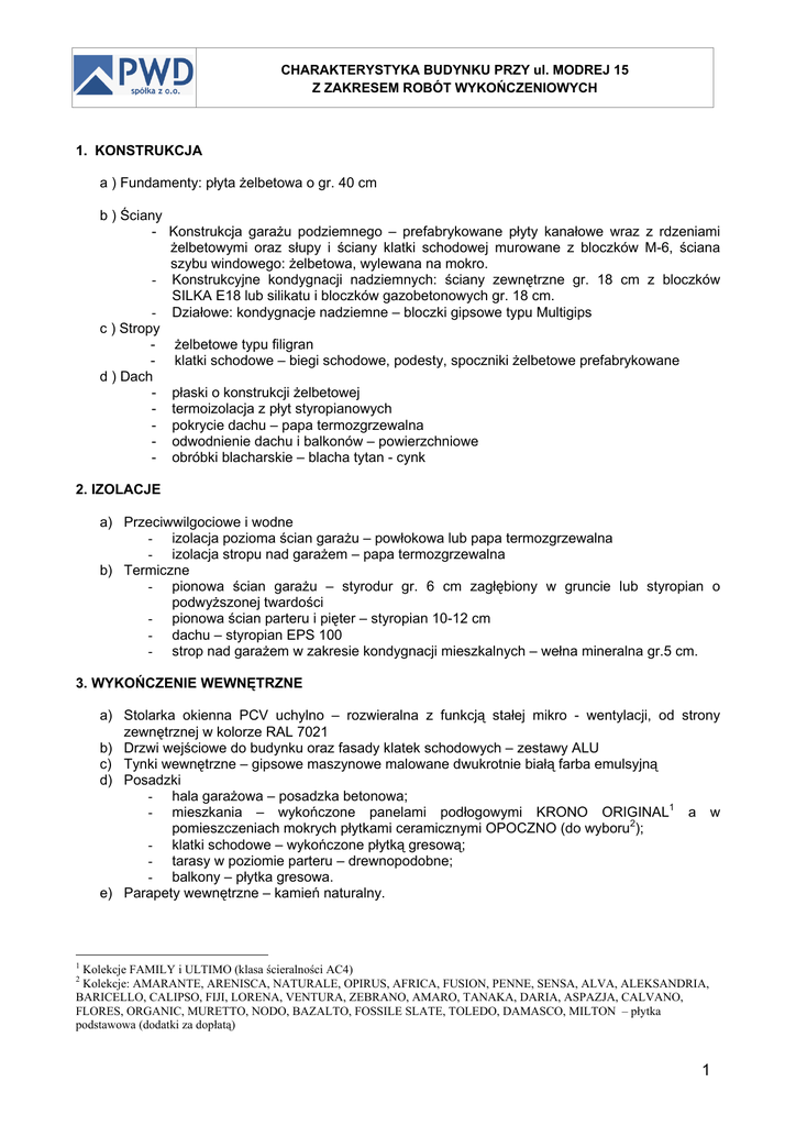 CHARAKTERYSTYKA BUDYNKU PRZY ul. MODREJ 15 Z ZAKRESEM ROBÓT WYKOŃCZENIOWYCH 1. KONSTRUKCJA a ) Fundamenty: płyta Ŝelbetowa o gr. 40 cm b ) Ściany - Konstrukcja garaŜu podziemnego – prefabrykowane płyty kanałowe wraz z rdzeniami Ŝelbetowymi oraz słupy i ściany klatki schodowej murowane z bloczków M-6, ściana szybu windowego: Ŝelbetowa, wylewana na mokro. - Konstrukcyjne kondygnacji nadziemnych: ściany zewnętrzne gr. 18 cm z bloczków SILKA E18 lub silikatu i bloczków gazobetonowych gr. 18 cm. - Działowe: kondygnacje nadziemne – bloczki gipsowe typu Multigips c ) Stropy - Ŝelbetowe typu filigran - klatki schodowe – biegi schodowe, podesty, spoczniki Ŝelbetowe prefabrykowane d ) Dach - płaski o konstrukcji Ŝelbetowej - termoizolacja z płyt styropianowych - pokrycie dachu – papa termozgrzewalna - odwodnienie dachu i balkonów – powierzchniowe - obróbki blacharskie – blacha tytan - cynk 2. IZOLACJE a) Przeciwwilgociowe i wodne - izolacja pozioma ścian garaŜu – powłokowa lub papa termozgrzewalna - izolacja stropu nad garaŜem – papa termozgrzewalna b) Termiczne - pionowa ścian garaŜu – styrodur gr. 6 cm zagłębiony w gruncie lub styropian o podwyŜszonej twardości - pionowa ścian parteru i pięter – styropian 10-12 cm - dachu – styropian EPS 100 - strop nad garaŜem w zakresie kondygnacji mieszkalnych – wełna mineralna gr.5 cm. 3. WYKOŃCZENIE WEWNĘTRZNE a) Stolarka okienna PCV uchylno – rozwieralna z funkcją stałej mikro - wentylacji, od strony zewnętrznej w kolorze RAL 7021 b) Drzwi wejściowe do budynku oraz fasady klatek schodowych – zestawy ALU c) Tynki wewnętrzne – gipsowe maszynowe malowane dwukrotnie białą farba emulsyjną d) Posadzki - hala garaŜowa – posadzka betonowa; - mieszkania – wykończone panelami podłogowymi KRONO ORIGINAL1 a w pomieszczeniach mokrych płytkami ceramicznymi OPOCZNO (do wyboru2); - klatki schodowe – wykończone płytką gresową; - tarasy w poziomie parteru – drewnopodobne; - balkony – płytka gresowa. e) Parapety wewnętrzne – kamień naturalny. 1 Kolekcje FAMILY i ULTIMO (klasa ścieralności AC4) Kolekcje: AMARANTE, ARENISCA, NATURALE, OPIRUS, AFRICA, FUSION, PENNE, SENSA, ALVA, ALEKSANDRIA, BARICELLO, CALIPSO, FIJI, LORENA, VENTURA, ZEBRANO, AMARO, TANAKA, DARIA, ASPAZJA, CALVANO, FLORES, ORGANIC, MURETTO, NODO, BAZALTO, FOSSILE SLATE, TOLEDO, DAMASCO, MILTON – płytka podstawowa (dodatki za dopłatą) 2 1 CHARAKTERYSTYKA BUDYNKU PRZY ul. MODREJ 15 Z ZAKRESEM ROBÓT WYKOŃCZENIOWYCH f) Ściany w łazience – wykończone płytkami ceramicznymi OPOCZNO do wysokości 2 m (do wyboru – kolekcje jak w przypadku podłóg w pomieszczeniach mokrych, w standardzie płytka podstawowa (dodatki za dopłatą)). g) Drzwi: - wejściowe do mieszkań: o odporności ogniowej przez 30 minut typu PORTA KWARC - wewnętrzne – płytowe z ościeŜnicą regulowaną3, klamki: LIBRA (nikiel satynowy). h) W mieszkaniach parterowych – rolety zewnętrzne 4. WYPOSAśENIE BUDYNKU W INSTALACJE a) Instalacja wod. – kan. a. zasilanie w wodę z sieci miejskiej, b. kanalizacja ogólnospławna odprowadzona do sieci miejskiej, c. instalacje ciepłej i zimnej wody, kanalizacyjna wykonane zgodnie z wymogami norm branŜowych; zainstalowane wodomierze, d. łazienka wyposaŜona w wannę, umywalkę, komplet armatury i muszlę WC (wisząca)4 b) Instalacja CO e. zasilana z indywidualnych dwufunkcyjnych pieców gazowych f. rury rozprowadzone w podłodze do grzejników panelowych z zaworem termostatycznym; indywidualne rozliczenie na podstawie licznika gazu, g. grzejniki panelowe z zaworem termostatycznym (w łazience grzejnik drabinkowy). c) Instalacja elektryczna h. podtynkowa, i. rozdzielnia główna + indywidualne liczniki energii na mieszkania, j. instalacja domofonowa, telefoniczna, telewizji kablowej, k. ilość punktów (wraz z osprzętem) w standardowym wykończeniu mieszkania: ♦ kuchnia: oświetleniowe 1 szt., sieciowe wg projektu., puszka 380V, ♦ pokoje: oświetleniowe 1 szt., sieciowe wg projektu., ♦ łazienka: oświetleniowe 2 szt., sieciowe 1 szt., pralkowe 1 szt., ♦ korytarz: oświetleniowe 1 szt., sieciowe 1 szt., ♦ domofon: 1 szt., ♦ gniazdo telefoniczne: 1 szt., ♦ gniazdo antenowe 1 szt.,. Za dopłatą dodatkowe punkty elektryczne. d) wentylacja – grawitacyjna; e) UWAGA – przez halę garaŜową prowadzona jest instalacja: gazowa, wod.-kan., elektrycznoenergetyczna, wentylacyjna. 5. ROBOTY WYKOŃCZENIOWE ZEWNĘTRZNE a. Elewacja – tynk strukturalny barwiony w masie lub malowany b. Instalacja odgromowa c. Pełne zagospodarowanie terenu w obrębie budynku obejmować będzie uporządkowanie terenu, ukształtowanie terenu po robotach zewnętrznych, wykonanie dróg dojazdowych, parkingów, dojść, ogrodzenie terenu, oświetlenia zewnętrznego oraz obsadzenie zielenią terenu działki zgodnie z planem zagospodarowania terenu. Niniejsza Charakterystyka ma charakter poglądowy, szczegółowe rozwiązania techniczne, w tym technologiczne i materiałowe, określa dokumentacja techniczna. Inwestor zastrzega sobie moŜliwość wprowadzania zmian, nie pogarszających, w sposób istotny zakładanego standardu. 3 DRE, seria PLUS TOP Ceramika sanitarna: umywalka KOŁO Idol, miska WC KOŁO Idol, wanna akrylowa prostokątna KOŁO Opal, armatura ścienna KFA, seria: CYRKON. 4 2