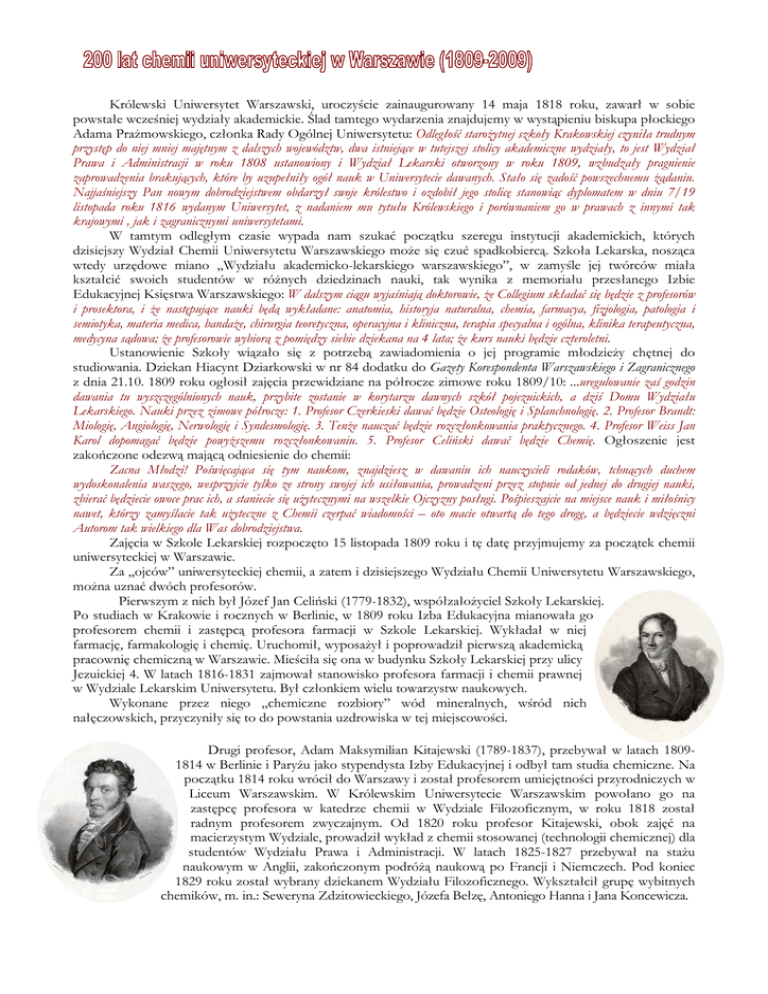 Królewski Uniwersytet Warszawski, uroczyście zainaugurowany 14 maja 1818 roku, zawarł w sobie powstałe wcześniej wydziały akademickie. Ślad tamtego wydarzenia znajdujemy w wystąpieniu biskupa płockiego Adama PraŜmowskiego, członka Rady Ogólnej Uniwersytetu: Odległość staroŜytnej szkoły Krakowskiej czyniła trudnym przystęp do niej mniej majętnym z dalszych województw, dwa istniejące w tutejszej stolicy akademiczne wydziały, to jest Wydział Prawa i Administracji w roku 1808 ustanowiony i Wydział Lekarski otworzony w roku 1809, wzbudzały pragnienie zaprowadzenia brakujących, które by uzupełniły ogół nauk w Uniwersytecie dawanych. Stało się zadość powszechnemu Ŝądaniu. Najjaśniejszy Pan nowym dobrodziejstwem obdarzył swoje królestwo i ozdobił jego stolicę stanowiąc dyplomatem w dniu 7/19 listopada roku 1816 wydanym Uniwersytet, z nadaniem mu tytułu Królewskiego i porównaniem go w prawach z innymi tak krajowymi , jak i zagranicznymi uniwersytetami. W tamtym odległym czasie wypada nam szukać początku szeregu instytucji akademickich, których dzisiejszy Wydział Chemii Uniwersytetu Warszawskiego moŜe się czuć spadkobiercą. Szkoła Lekarska, nosząca wtedy urzędowe miano „Wydziału akademicko-lekarskiego warszawskiego”, w zamyśle jej twórców miała kształcić swoich studentów w róŜnych dziedzinach nauki, tak wynika z memoriału przesłanego Izbie Edukacyjnej Księstwa Warszawskiego: W dalszym ciągu wyjaśniają doktorowie, Ŝe Collegium składać się będzie z profesorów i prosektora, i Ŝe następujące nauki będą wykładane: anatomia, historyja naturalna, chemia, farmacya, fizjologia, patologia i semiotyka, materia medica, bandaŜe, chirurgia teoretyczna, operacyjna i kliniczna, terapia specyalna i ogólna, klinika terapeutyczna, medycyna sądowa; Ŝe profesorowie wybiorą z pomiędzy siebie dziekana na 4 lata; Ŝe kurs nauki będzie czteroletni. Ustanowienie Szkoły wiązało się z potrzebą zawiadomienia o jej programie młodzieŜy chętnej do studiowania. Dziekan Hiacynt Dziarkowski w nr 84 dodatku do Gazety Korespondenta Warszawskiego i Zagranicznego z dnia 21.10. 1809 roku ogłosił zajęcia przewidziane na półrocze zimowe roku 1809/10: ...uregulowanie zaś godzin dawania tu wyszczególnionych nauk, przybite zostanie w korytarzu dawnych szkół pojezuickich, a dziś Domu Wydziału Lekarskiego. Nauki przez zimowe półrocze: 1. Profesor Czerkieski dawać będzie Osteologię i Splanchnologię. 2. Profesor Brandt: Miologię, Angiologię, Nerwologię i Syndesmologię. 3. TenŜe nauczać będzie rozczłonkowania praktycznego. 4. Profesor Weiss Jan Karol dopomagać będzie powyŜszemu rozczłonkowaniu. 5. Profesor Celiński dawać będzie Chemię. Ogłoszenie jest zakończone odezwą mającą odniesienie do chemii: Zacna Młodzi! Poświęcająca się tym naukom, znajdziesz w dawaniu ich nauczycieli rodaków, tchnących duchem wydoskonalenia waszego, wesprzyjcie tylko ze strony swojej ich usiłowania, prowadzeni przez stopnie od jednej do drugiej nauki, zbierać będziecie owoce prac ich, a staniecie się uŜytecznymi na wszelkie Ojczyzny posługi. Pośpieszajcie na miejsce nauk i miłośnicy nawet, którzy zamyślacie tak uŜyteczne z Chemii czerpać wiadomości – oto macie otwartą do tego drogę, a będziecie wdzięczni Autorom tak wielkiego dla Was dobrodziejstwa. Zajęcia w Szkole Lekarskiej rozpoczęto 15 listopada 1809 roku i tę datę przyjmujemy za początek chemii uniwersyteckiej w Warszawie. Za „ojców” uniwersyteckiej chemii, a zatem i dzisiejszego Wydziału Chemii Uniwersytetu Warszawskiego, moŜna uznać dwóch profesorów. Pierwszym z nich był Józef Jan Celiński (1779-1832), współzałoŜyciel Szkoły Lekarskiej. Po studiach w Krakowie i rocznych w Berlinie, w 1809 roku Izba Edukacyjna mianowała go profesorem chemii i zastępcą profesora farmacji w Szkole Lekarskiej. Wykładał w niej farmację, farmakologię i chemię. Uruchomił, wyposaŜył i poprowadził pierwszą akademicką pracownię chemiczną w Warszawie. Mieściła się ona w budynku Szkoły Lekarskiej przy ulicy Jezuickiej 4. W latach 1816-1831 zajmował stanowisko profesora farmacji i chemii prawnej w Wydziale Lekarskim Uniwersytetu. Był członkiem wielu towarzystw naukowych. Wykonane przez niego „chemiczne rozbiory” wód mineralnych, wśród nich nałęczowskich, przyczyniły się to do powstania uzdrowiska w tej miejscowości. Drugi profesor, Adam Maksymilian Kitajewski (1789-1837), przebywał w latach 18091814 w Berlinie i ParyŜu jako stypendysta Izby Edukacyjnej i odbył tam studia chemiczne. Na początku 1814 roku wrócił do Warszawy i został profesorem umiejętności przyrodniczych w Liceum Warszawskim. W Królewskim Uniwersytecie Warszawskim powołano go na zastępcę profesora w katedrze chemii w Wydziale Filozoficznym, w roku 1818 został radnym profesorem zwyczajnym. Od 1820 roku profesor Kitajewski, obok zajęć na macierzystym Wydziale, prowadził wykład z chemii stosowanej (technologii chemicznej) dla studentów Wydziału Prawa i Administracji. W latach 1825-1827 przebywał na staŜu naukowym w Anglii, zakończonym podróŜą naukową po Francji i Niemczech. Pod koniec 1829 roku został wybrany dziekanem Wydziału Filozoficznego. Wykształcił grupę wybitnych chemików, m. in.: Seweryna Zdzitowieckiego, Józefa Bełzę, Antoniego Hanna i Jana Koncewicza. Królewski Uniwersytet Warszawski od momentu swego powstawania nie dysponował własną pracownią chemiczną. Laboratorium, stworzone i wyposaŜone przez profesora Kitajewskiego jeszcze na potrzeby Liceum Warszawskiego, zaczęło słuŜyć obu uczelniom. W 1817 roku wraz z Liceum zostało ono przeniesione do Pałacu Kazimierzowskiego. Pracownia chemiczna i audytorium mieściły się na parterze dawnej kuchni królewskiej, w pawilonie od północnej strony Pałacu, na piętrze tego budynku znajdowało się mieszkanie profesora. Widok tego fragmentu przyszłego U