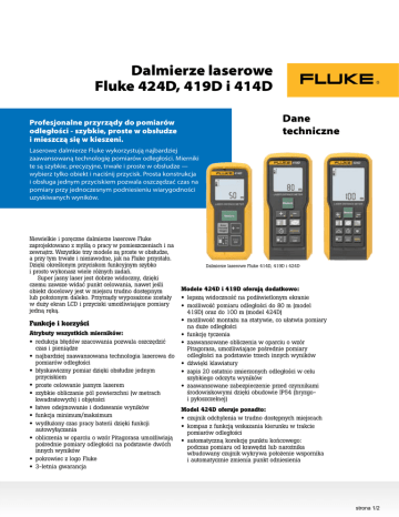 Dalmierze laserowe Fluke 424D, 419D i 414D Dane techniczne Profesjonalne przyrządy do pomiarów odległości - szybkie, proste w obsłudze i mieszczą się w kieszeni. Laserowe dalmierze Fluke wykorzystują najbardziej zaawansowaną technologię pomiarów odległości. Mierniki te są szybkie, precyzyjne, trwałe i proste w obsłudze — wybierz tylko obiekt i naciśnij przycisk. Prosta konstrukcja i obsługa jednym przyciskiem pozwala oszczędzać czas na pomiary przy jednoczesnym podniesieniu wiarygodności uzyskiwanych wyników. Niewielkie i poręczne dalmierze laserowe Fluke zaprojektowano z myślą o pracy w pomieszczeniach i na zewnątrz. Wszystkie trzy modele są proste w obsłudze, a przy tym trwałe i niezawodne, jak na Fluke przystało. Dzięki określonym przyciskom funkcyjnym szybko i prosto wykonasz wiele różnych zadań. Super jasny laser jest dobrze widoczny, dzięki czemu zawsze widać punkt celowania, nawet jeśli obiekt docelowy jest w miejscu trudno dostępnym lub położonym daleko. Przyrządy wyposażone zostały w duży ekran LCD i przyciski umożliwiające pomiary jedną ręką. Funkcje i korzyści Atrybuty wszystkich mierników: • redukcja błędów szacowania pozwala oszczędzić czas i pieniądze • najbardziej zaawansowana technologia laserowa do pomiarów odległości • błyskawiczny pomiar dzięki obsłudze jednym przyciskiem • proste celowanie jasnym laserem • szybkie obliczanie pól powierzchni (w metrach kwadratowych) i objętości • łatwe odejmowanie i dodawanie wyników • funkcja minimum/maksimum • wydłużony czas pracy baterii dzięki funkcji autowyłączania • obliczenia w oparciu o wzór Pitagorasa umożliwiają pośrednie pomiary odległości na podstawie dwóch innych wyników • pokrowiec z logo Fluke • 3-letnia gwarancja Dalmierze laserowe Fluke 414D, 419D i 424D Modele 424D i 419D oferują dodatkowo: • lepszą widoczność na podświetlonym ekranie • możliwość pomiaru odległości do 80 m (model 419D) oraz do 100 m (model 424D) • możliwość montażu na statywie, co ułatwia pomiary na duże odległości • funkcję tyczenia • zaawansowane obliczenia w oparciu o wzór Pitagorasa, umożliwiające pośrednie pomiary odległości na podstawie trzech innych wyników • dźwięki klawiatury • zapis 20 ostatnio zmierzonych odległości w celu szybkiego odczytu wyników • zaawansowane zabezpieczenie przed czynnikami środowiskowymi dzięki obudowie IP54 (bryzgoi pyłoszczelnej) Model 424D oferuje ponadto: • czujnik odchylenia w trudno dostępnych miejscach • kompas z funkcją wskazania kierunku w trakcie pomiarów odległości • automatyczną korekcję punktu końcowego: podczas pomiaru od krawędzi lub narożnika wbudowany czujnik wykrywa położenie wspornika i automatycznie zmienia punkt odniesienia strona 1/2 Parametry ogólne 414D 419D 424D Pomiary odległości Typowa tolerancja pomiarowa[1] ± 2,0 mm[3] Maksymalna tolerancja pomiarowa[2] ± 3,0 mm[3] ± 1,0 mm[3] ± 2,0 mm[3] Zasięg z płytką celowniczą Leica GZM26 50 m 80 m 100 m Typowy zasięg[1] 40 m 80 m 80 m Zasięg w niekorzystnych warunkach[4] 35 m 60 m Najmniejsza wyświetlana jednostka 1 mm nie Power Range Technology™ punkt lasera w odległości 60 m 1 mm tak 6 / 30 / 60 mm (10 / 50 / 100 m) tak 6 / 30 / 60 mm (10 / 50 / 100 m) Pomiar odchylenia Tolerancja pomiarowa dla promienia lasera[5] Nie Nie ± 0,2° Tolerancja pomiarowa do obudowy[5] Nie Nie ± 0,2° Zakres Nie Nie 360° Ogólne Klasa lasera II Typ lasera 635 nm, <1 mW Klasa zabezpieczenia IP40 IP54 Automatyczny wyłącznik lasera Po 90 sekundach Autowyłączanie zasilania Po 180 sekundach Żywotność baterii (2 x AAA) 1,5 V NEDA 24A/ IEC LR03 Wymiary (wys. x szer. x dł.) Do 3000 pomiarów 127 mm x 56 mm x 33 mm 127 mm x 56 mm x 33 mm 113 g 153 g 158 g Waga (z bateriami) Zakres temperatur: Przechowywania Cykl kalibracji Maksymalna wysokość Maksymalna wilgotność względna Do 5000 pomiarów 116 mm x 53 mm x 33 mm -25 °C do +70 °C 0 °C do +40 °C -25 °C do +70 °C -10 °C do +50 °C Nie dotyczy Nie dotyczy 3000 m 3000 m 3000 m 85% przy -7 °C do 50 °C 85% przy -7 °C do 50 °C 85% przy -7 °C do 50 °C Bezpieczeństwo odchylenie i kompas CAN/CSA-C22.2 Nr 61010-1-04, UL Std. Nr 61010-1 (2nd Edition), ISA-82.02.01, IEC Standard Nr 61010-1:2001, EN60825-1:2007 (Class II) EMC [1] Dotyczy 100% odbicia od celu (biała ściana), słabe oświetlenie tła, 25 °C. [2] Dotyczy 10% do 500% odbicia od celu, silne oświetlenie tła, -10 °C do +50 °C. [3] Tolerancje od 0,05 m do 10 m na poziome ufności 95%. Maksymalna tolerancja może ulec pogorszeniu do 0,1 mm/m między 10 m a 30 m oraz do 0,15 mm/m powyżej 30 m. [4] Dotyczy 100% odbicia od celu, oświetlenia tła od 10 000 luksów do 30 000 luksów. [5] Po kalibracji przez użytkownika. Dodatkowe odchylenie związane z kątem ± 0,01° na stopień do ± 45° w każdej ćwiartce. Dotyczy temperatury pokojowej. Dla całego zakresu temperatury eksploatacji maksymalne odchylenie rośnie o ± 0,1°. Dlaczego warto stosować dalmierze? 61326-1:2006 Jak zamawiać Dalmierz laserowy Fluke 424D Dalmierz laserowy Fluke 419D Dalmierz laserowy Fluke 414D Wszystkie modele zawierają: Dalmierz laserowy, dwie baterie AAA, instrukcję obsługi na CD, skrócony podręcznik użytkownika, pokrowiec winylowy i 3-letnią gwarancję Natychmiastowe pomiary aż do 100 metrów. Wystarczy wycelować, kliknąć i gotowe. Mierz z większą dokładnością. Do ± 1 mm. Żadnych skal stwarzających okazję do popełnienia błędów. Pracuj za dwóch. Pomocnik zamiast trzymać miarę może wykonywać inne zadania. Przyspieszenie pracy. Proste pomiary trudno dostępnych miejsc, jak wysokie sufity, bez wchodzenia na drabinę. Utrzymuj poziom. Nowy czujnik odchylenia w modelu Fluke 424D pomaga w poziomowaniu, śledzeniu wysokości i pomiarach wokół przeszkód. Redukcja błędów szacowania — miernik wykona wszystkie obliczenia. Obliczanie pól powierzchni i ob