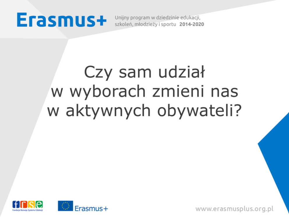 Czy sam udział w wyborach zmieni nas w aktywnych obywateli? Obywatele Obywatel - członek społeczeństwa danego państwa, mający określone uprawnienia i obowiązki zastrzeżone przez prawo i konstytucję Prawa • Prawo do życia • Nietykalność i wolność osobista • Prawo głosu • Prawo do posiadania własności Obowiązki • Wierność i troska o wspólne dobro narodu i społeczeństwa • Przestrzeganie prawa • Obrona ojczyzny • Ponoszenie ciężaru świadczeń Statystyki - wybory do PE Frekwencja w wyborach do Parlamentu Europejskiego 2014 100 80 60 40 20 0 Źródło: Eurobarometr, 2014 Statystyki - wybory parlamentarne Frekwencja w wyborach parlamentarnych 100 90 80 70 60 50 40 30 20 10 0 Źródło: European Elections Database, 2014 Statystyki wolontariat 54% Polaków pracowało kiedyś dobrowolnie i nieodpłatnie na rzecz swojego środowiska, kościoła, osiedla, wsi, miasta czy potrzebujących •Częściej są to osoby z wykształceniem wyższym (73%) niż podstawowym (43%) W styczniu 2014 roku 20% Polaków udzieliło pozytywnej odpowiedzi na to pytanie •Regres w stosunku do lat 2004 - 2010 Źródło: CBOS, 2014 Statystyki wolontariat Praca w charakterze wolontariusza – 6% Polaków • Polska na 18. miejscu w Europie (Holandia – 33%, Norwegia, Dania – 28%) 49% Polaków przekazało na cele dobroczynne pieniądze, a 37% dary rzeczowe • Jeden z wyższych wyników w Europie Źródła: CBOS, 2014, ESS, 2011 Aktywni nieaktywni obywatele Aktywni •Przekazują środki finansowe i rzeczowe •Przynajmniej raz w życiu zrobili coś woluntarystycznie •Coraz częściej angażują się w działania lokalne Nieaktywni •Bardzo niska frekwencja wyborcza •Bardzo mała liczba wolontariuszy Świadomi i aktywni obywatele Kim są? Źródło: CBOS, 2014 Świadomi i aktywni obywatele Dlaczego to robią? Źródło: CBOS, 2014 Świadomi i aktywni młodzi obywatele nie jest nastawiony na zysk rozwija swoje zainteresowania często angażuje się w ważne dla niego sprawy jest akceptowany przez najbliższe otoczenie aktywny w internecie i w sporcie czyta książki bywa, że łączy sprzeczności rodzina jest dla niego ważna, ale czas wolny spędza ze znajomymi ceni zdrowie i przyjaciół słucha rocka ma rodzeństwo jest na Facebooku, korzysta z Youtube czasami wagaruje lubi oglądać komedie stawia rozwój ponad wykształceniem mówi po angielsku Źródło: Młodzi, aktywni 2013 Nieaktywni obywatele Dlaczego nic nie robią? Źródło: CBOS, 2014 Budowanie świadomości społecznej i obywatelskiej Kampanie społeczne (bierne budowanie świadomości) • Kampanie podnoszące świadomość • Kampanie nakłaniające do pewnych zachowań Projekty edukacyjne (czynne budowanie świadomości) • Edukacja formalna • Edukacja pozaformalna Budowanie świadomości społecznej i obywatelskiej Kampania „Autyzm wprowadza zmysły w błąd” Identyfikacja problemu Przedstawienie społeczeństwu Reakcja Budowanie świadomości społecznej i obywatelskiej Kampania „Ojczysty – dodaj do ulubionych” Budowanie świadomości społecznej i obywatelskiej Projekty edukacyjne – edukacja formalna Projekt „TeachNET – Edukacja w każdym wieku” • Aktywne zaangażowanie uczniów i nauczycieli • Rozwijanie kompetencji • Budowanie świadomości społecznej •Rozwój potencjału instytucji Budowanie świadomości społecznej i obywatelskiej Projekty edukacyjne – edukacja pozaformalna Projekt „Kobieta, kreatywność, kultura” • zmiana stereotypu • aktywizacja społeczności • wiara w siebie i w swoje możliwości • zachęta do realizacji podobnych przedsięwzięć Budowanie świadomości społecznej i obywatelskiej Kampanie społeczne • Duży zasięg • Ważne społecznie tematy • Podnoszenie świadomości • Bierne budowanie świadomości Projekty edukacyjne • Zasięg lokalny • Odpowiedź na lokalne potrzeby • Aktywne zaangażowanie i realna zmiana