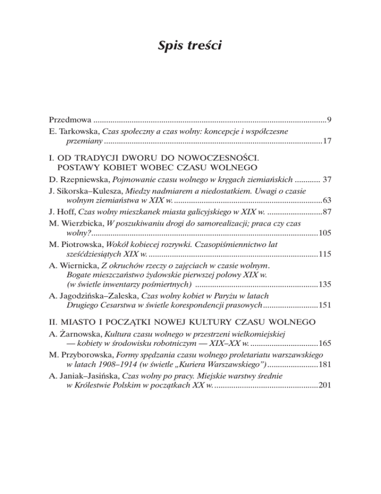 Spis treœci Spis treœci Przedmowa ..............................................................................................................9 E. Tarkowska, Czas spo³eczny a czas wolny: koncepcje i wspó³czesne przemiany .......................................................................................................17 I. OD TRADYCJI DWORU DO NOWOCZESNOŒCI. POSTAWY KOBIET WOBEC CZASU WOLNEGO D. Rzepniewska, Pojmowanie czasu wolnego w krêgach ziemiañskich ............ 37 J. Sikorska–Kulesza, Miedzy nadmiarem a niedostatkiem. Uwagi o czasie wolnym ziemiañstwa w XIX w.......................................................................63 J. Hoff, Czas wolny mieszkanek miasta galicyjskiego w XIX w. ..........................87 M. Wierzbicka, W poszukiwaniu drogi do samorealizacji; praca czy czas wolny?...........................................................................................................105 M. Piotrowska, Wokó³ kobiecej rozrywki. Czasopiœmiennictwo lat szeœædziesi¹tych XIX w.................................................................................115 A. Wiernicka, Z okruchów rzeczy o zajêciach w czasie wolnym. Bogate mieszczañstwo ¿ydowskie pierwszej po³owy XIX w. (w œwietle inwentarzy poœmiertnych) ..........................................................135 A. Jagodziñska–Zaleska, Czas wolny kobiet w Pary¿u w latach Drugiego Cesarstwa w œwietle korespondencji prasowych..........................151 II. MIASTO I POCZ¥TKI NOWEJ KULTURY CZASU WOLNEGO A. ¯arnowska, Kultura czasu wolnego w przestrzeni wielkomiejskiej — kobiety w œrodowisku robotniczym — XIX–XX w.................................165 M. Przyborowska, Formy spêdzania czasu wolnego proletariatu warszawskiego w latach 1908–1914 (w œwietle „Kuriera Warszawskiego”)........................181 A. Janiak–Jasiñska, Czas wolny po pracy. Miejskie warstwy œrednie w Królestwie Polskim w pocz¹tkach XX w..................................................201 6 Spis treœci M. Kondracka, „Czas swobodny” zamo¿nego mieszczañstwa warszawskiego (w II po³owie XIX i na pocz¹tku XX w.) ....................................................227 M. Olkuœnik, Zwierciad³o i drogowskaz. Prasa warszawska prze³omu XIX i XX w. o podró¿y i wypoczynku kobiet poza miastem .......................239 M. Sikorska–Kowalska, Miasto wielkoprzemys³owe i czas wolny kobiet. £ódŸ na prze³omie XIX i XX w ...................................................................265 U. Perkowska, Czas wolny w kulturze studenckiej na prze³omie XIX i XX w. (w œwietle pamiêtników i korespondencji krakowskich studentek)............275 K. Sierakowska, Dwudziestolecie miêdzywojenne: kobieta w rodzinie inteligenckiej i jej czas wolny. (Próba rekonesansu)...................................295 III. CZAS WOLNY A PRZEMIANY OBYCZAJU D. Hüchtker, Kobieta w podró¿y. Czas emancypacji, czas wolnoœci czy kontynuacja codziennoœci?....................................................................313 M. Rotkiewicz, Maria Sk³odowska–Curie — wzory aktywnego wypoczynku .....325 T. Stegner, Kobieta na wczasach w Sopocie w XIX i na pocz¹tku XX w. ........ 345 M. Gawin, Kobieta na pla¿y. Przemiany modelu seksualnoœci kobiecej w latach miêdzywojennych ..........................................................................357 E. Mazur, Ruch dba³oœci o kulturê fizyczn¹ kobiet w XIX i na pocz¹tku XX w. ............................................................................................................373 J. Snopko, Dziewczêta w „Sokole” galicyjskim.................................................. 383 P. Vošahliková, Czas wolny kobiet w Czechach w XIX i na pocz¹tku XX w. .. 393 IV. WZORCE KULTURY CZASU WOLNEGO W ŒRODKACH MASOWEGO PRZEKAZU T. Kulak, Wzory wypoczynku i rekreacji propagowane w piœmiennictwie Zwi¹zku Pañ Domu (1927–1939) ..............................................................411 H. Krajewska, Kino w £odzi, repertuar, reklama i kobieca publicznoœæ.......... 427 Z. Chyra–Rolicz, Wzory rekreacji propagowane przez spó³dzielczynie w Polsce miêdzywojennej.............................................................................441 A. Landau–Czajka, Pró¿niactwo, odpoczynek, rozrywka. Czas wolny w podrêcznikach szkolnych dla dzieci najm³odszych .................................453 D. Jarosz, Robotnicy, robotnice i Fundusz Wczasów Pracowniczych w Polsce (do 1956 r.) ...................................................................................481 Spis treœci 7 I. Kurz, Czas wolny na ekranie. Bohaterki filmu popularnego w PRL a „bud¿et czasu wolnego”............................................................................495 ANEKS J. Flasiñska, B. Spiechowicz, Czas wolny kobiet na wsi rzeszowskiej.............. 511 Summary ..............................................................................................................519 Informacje o Autorach .......................................................................................527 Indeks osób..........................................................................................................535 Indeks organizacji i czasopism...........................................................................550