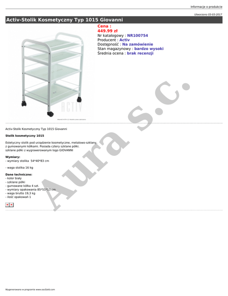 Informacje o produkcie Utworzono 03-03-2017 Activ-Stolik Kosmetyczny Typ 1015 Giovanni Cena : 449.99 zł s. c. Nr katalogowy : NR100754 Producent : Activ Dostępność : Na zamówienie Stan magazynowy : bardzo wysoki Średnia ocena : brak recenzji Activ-Stolik Kosmetyczny Typ 1015 Giovanni Stolik kosmetyczny 1015 Au r Wymiary: - wymiary stolika 54*40*83 cm a Estetyczny stolik pod urządzenie kosmetyczne, metalowo-szklany, z gumowanymi kółkami. Posiada cztery szklane półki. szklane półki z wygrawerowanym logo GIOVANNI - waga stolika 16 kg Dane techniczne: - kolor biały - szklane półki - gumowane kółka 4 szt. - wymiary opakowania 85*51*13 cm - waga brutto 19,3 kg - ilość opakowań 1 Wygenerowano w programie www.oscGold.com