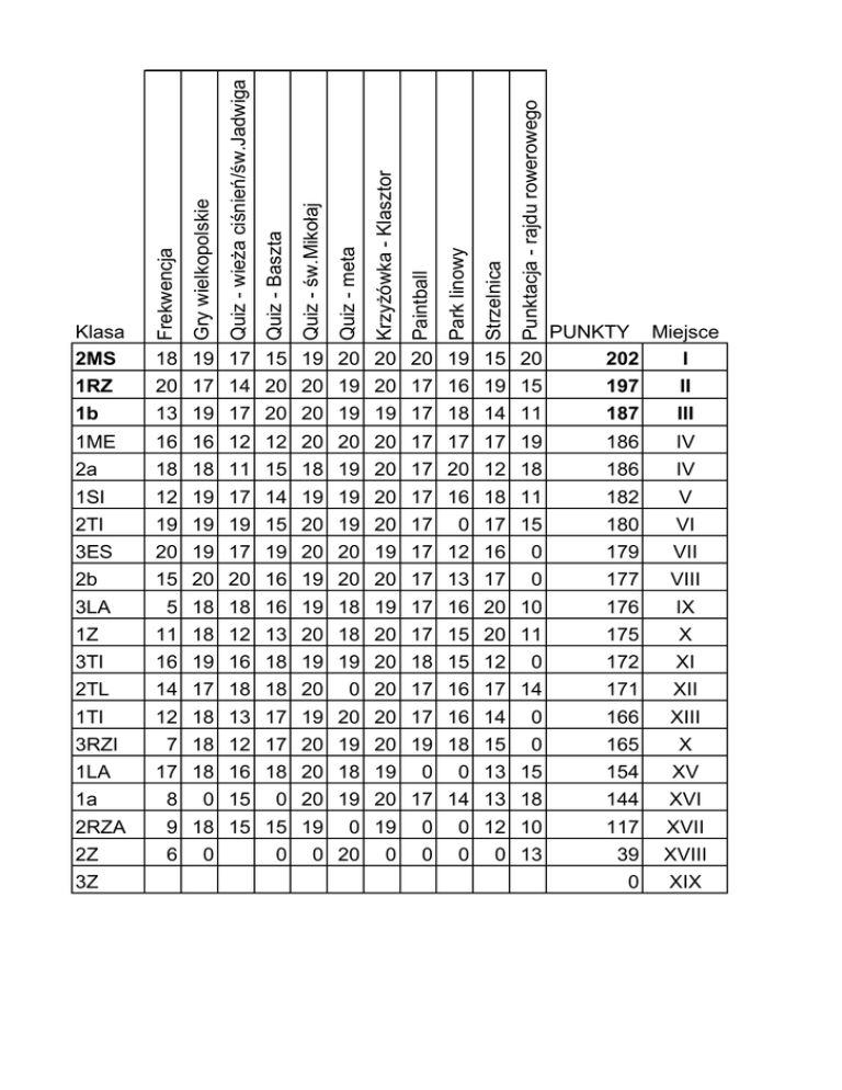 Punktacja - rajdu rowerowego Strzelnica Park linowy Paintball Krzyżówka - Klasztor Quiz - meta Quiz - św.Mikołaj Quiz - Baszta Quiz - wieża ciśnień/św.Jadwiga Gry wielkopolskie Frekwencja Klasa 2MS PUNKTY Miejsce 18 19 17 15 19 20 20 20 19 15 20 202 I 1RZ 20 17 14 20 20 19 20 17 16 19 15 197 II 1b 13 19 17 20 20 19 19 17 18 14 11 187 III 1ME 16 16 12 12 20 20 20 17 17 17 19 186 IV 2a 18 18 11 15 18 19 20 17 20 12 18 186 IV 1SI 12 19 17 14 19 19 20 17 16 18 11 182 V 2TI 19 19 19 15 20 19 20 17 180 VI 3ES 20 19 17 19 20 20 19 17 12 16 0 179 VII 2b 15 20 20 16 19 20 20 17 13 17 0 177 VIII 5 18 18 16 19 18 19 17 16 20 10 176 IX 1Z 11 18 12 13 20 18 20 17 15 20 11 175 X 3TI 16 19 16 18 19 19 20 18 15 12 0 172 XI 2TL 14 17 18 18 20 0 20 17 16 17 14 171 XII 1TI 12 18 13 17 19 20 20 17 16 14 0 166 XIII 7 18 12 17 20 19 20 19 18 15 0 165 X 0 13 15 154 XV 0 20 19 20 17 14 13 18 144 XVI 117 XVII 39 XVIII 0 XIX 3LA 3RZI 1LA 17 18 16 18 20 18 19 1a 8 2RZA 9 18 15 15 19 2Z 6 3Z 0 15 0 0 0 19 0 20 0 0 0 17 15 0 0 12 10 0 0 0 13