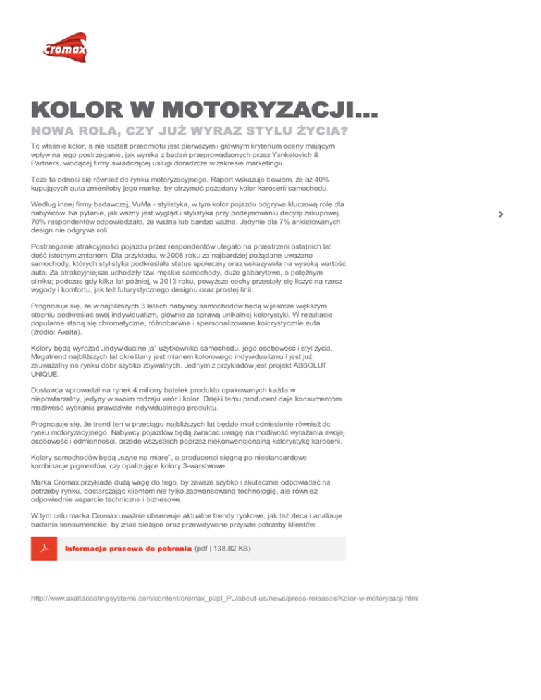KOLOR W MOTORYZACJI... NOWA ROLA, CZY JUŻ WYRAZ STYLU ŻYCIA? To właśnie kolor, a nie kształt przedmiotu jest pierwszym i głównym kryterium oceny mającym wpływ na jego postrzeganie, jak wynika z badań przeprowadzonych przez Yankelovich & Partners, wiodącej firmy świadczącej usługi doradzcze w zakresie marketingu. Teza ta odnosi się również do rynku motoryzacyjnego. Raport wskazuje bowiem, że aż 40% kupujących auta zmieniłoby jego markę, by otrzymać pożądany kolor karoserii samochodu. Według innej firmy badawczej, VuMa - stylistyka, w tym kolor pojazdu odgrywa kluczową rolę dla nabywców. Na pytanie, jak ważny jest wygląd i stylistyka przy podejmowaniu decyzji zakupowej, 70% respondentów odpowiedziało, że ważna lub bardzo ważna. Jedynie dla 7% ankietowanych design nie odgrywa roli. Postrzeganie atrakcyjności pojazdu przez respondentów ulegało na przestrzeni ostatnich lat dość istotnym zmianom. Dla przykładu, w 2008 roku za najbardziej pożądane uważano samochody, których stylistyka podkreślała status społeczny oraz wskazywała na wysoką wartość auta. Za atrakcyjniejsze uchodziły tzw. męskie samochody, duże gabarytowo, o potężnym silniku; podczas gdy kilka lat później, w 2013 roku, powyższe cechy przestały się liczyć na rzecz wygody i komfortu, jak też futurystycznego designu oraz prostej linii. Prognozuje się, że w najbliższych 3 latach nabywcy samochodów będą w jeszcze większym stopniu podkreślać swój indywidualizm, głównie za sprawą unikalnej kolorystyki. W rezultacie popularne staną się chromatyczne, różnobarwne i spersonalizowane kolorystycznie auta (źródło: Axalta). Kolory będą wyrażać „indywidualne ja” użytkownika samochodu, jego osobowość i styl życia. Megatrend najbliższych lat określany jest mianem kolorowego indywidualizmu i jest już zauważalny na rynku dóbr szybko zbywalnych. Jednym z przykładów jest projekt ABSOLUT UNIQUE. Dostawca wprowadził na rynek 4 miliony butelek produktu opakowanych każda w niepowtarzalny, jedyny w swoim rodzaju wzór i kolor. Dzięki temu producent daje konsumentom możliwość wybrania prawdziwie indywidualnego produktu. Prognozuje się, że trend ten w przeciągu najbliższych lat będzie miał odniesienie również do rynku motoryzacyjnego. Nabywcy pojazdów będą zwracać uwagę na możliwość wyrażania swojej osobowość i odmienności, przede wszystkich poprzez niekonwencjonalną kolorystykę karoserii. Kolory samochodów będą „szyte na miarę”, a producenci sięgną po niestandardowe kombinacje pigmentów, czy opalizujące kolory 3-warstwowe. Marka Cromax przykłada dużą wagę do tego, by zawsze szybko i skutecznie odpowiadać na potrzeby rynku, dostarczając klientom nie tylko zaawansowaną technologię, ale również odpowiednie wsparcie techniczne i biznesowe. W tym celu marka Cromax uważnie obserwuje aktualne trendy rynkowe, jak też zleca i analizuje badania konsumenckie, by znać bieżące oraz przewidywane przyszłe potrzeby klientów. f Informacja prasowa do pobrania (pdf | 138.82 KB) http://www.axaltacoatingsystems.com/content/cromax_pl/pl_PL/about-us/news/press-releases/Kolor-w-motoryzacji.html u
