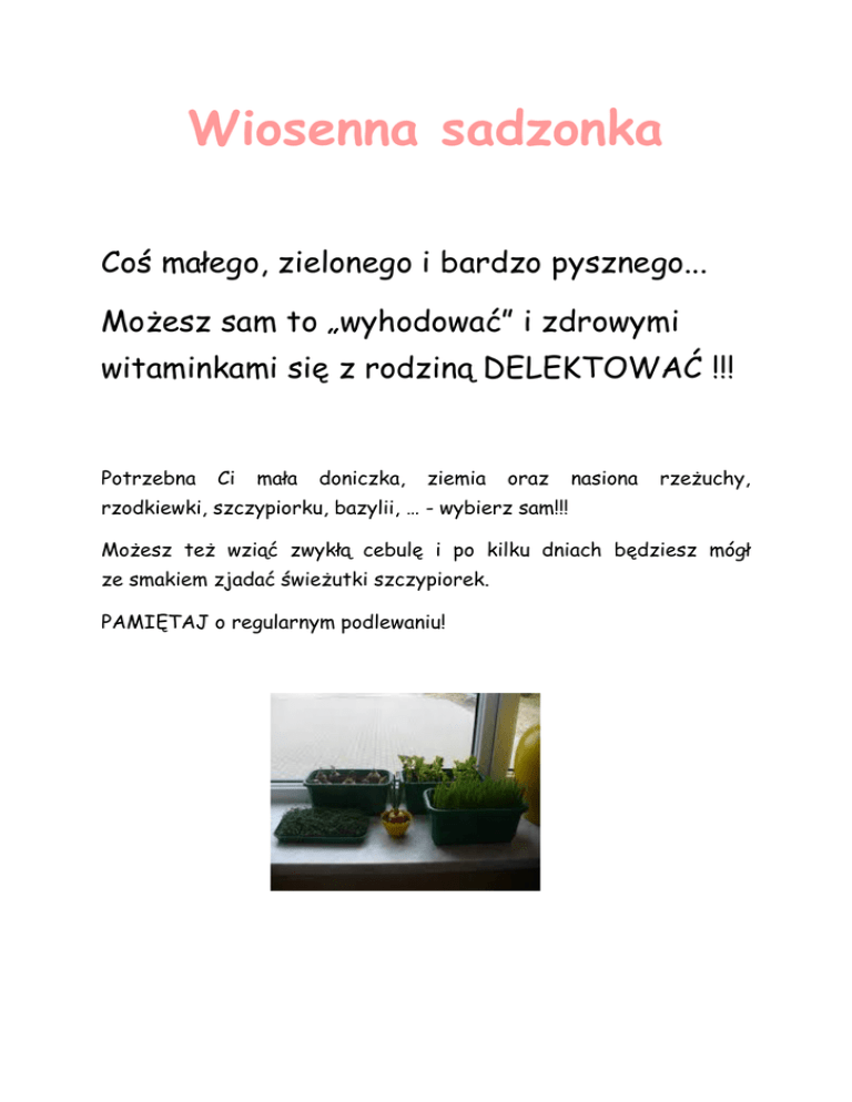 Wiosenna sadzonka Coś małego, zielonego i bardzo pysznego... Możesz sam to „wyhodować” i zdrowymi witaminkami się z rodziną DELEKTOWAĆ !!! Potrzebna Ci mała doniczka, ziemia oraz nasiona rzeżuchy, rzodkiewki, szczypiorku, bazylii, … - wybierz sam!!! Możesz też wziąć zwykłą cebulę i po kilku dniach będziesz mógł ze smakiem zjadać świeżutki szczypiorek. PAMIĘTAJ o regularnym podlewaniu!