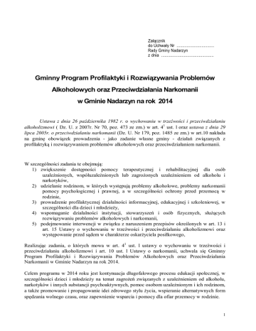 Załącznik do Uchwały Nr ................................. Rady Gminy Nadarzyn z dnia .............................................. Gminny Program Profilaktyki i Rozwiązywania Problemów Alkoholowych oraz Przeciwdziałania Narkomanii w Gminie Nadarzyn na rok 2014 Ustawa z dnia 26 października 1982 r. o wychowaniu w trzeźwości i przeciwdziałaniu alkoholizmowi ( Dz. U. z 2007r. Nr 70, poz. 473 ze zm.) w art. 41 ust. l oraz ustawa z dnia 29 lipca 2005r. o przeciwdziałaniu narkomanii (Dz. U. Nr 179, poz. 1485 ze zm.) w art.10 nakłada na gminę obowiązek prowadzenia - jako zadanie własne gminy - działań związanych z profilaktyką i rozwiązywaniem problemów alkoholowych oraz przeciwdziałaniem narkomanii. W szczególności zadania te obejmują: 1) zwiększenie dostępności pomocy terapeutycznej i rehabilitacyjnej dla osób uzależnionych, współuzależnionych lub zagrożonych uzależnieniem od alkoholu i narkotyków, 2) udzielanie rodzinom, w których występują problemy alkoholowe, problemy narkomanii pomocy psychologicznej i prawnej, a w szczególności ochrony przed przemocą w rodzinie, 3) prowadzenie profilaktycznej działalności informacyjnej, edukacyjnej i szkoleniowej, w szczególności dla dzieci i młodzieży, 4) wspomaganie działalności instytucji, stowarzyszeń i osób fizycznych, służących rozwiązywaniu problemów alkoholowych i narkomanii, 5) podejmowanie interwencji w związku z naruszeniem przepisów określonych w art. 13 i art. 15 Ustawy o wychowaniu w trzeźwości i przeciwdziałaniu alkoholizmowi oraz występowanie przed sądem w charakterze oskarżyciela posiłkowego, Realizując zadania, o których mowa w art. 41 ust. l ustawy o wychowaniu w trzeźwości i przeciwdziałaniu alkoholizmowi i art. 10 ust. l Ustawy o narkomanii, uchwala się Gminny Program Profilaktyki i Rozwiązywania Problemów Alkoholowych oraz Przeciwdziałania Narkomanii w Gminie Nadarzyn na rok 2014. Celem programu w 2014 roku jest kontynuacja długofalowego procesu edukacji społecznej, w szczególności dzieci i młodzieży na temat zagrożeń związanych z uzależnieniem od alkoholu, narkotyków i innych substancji psychoaktywnych, pomoc osobom uzależnionym i ich rodzinom, a także promowanie i propagowanie idei zdrowego stylu życia, wspieranie alternatywnych form spędzania wolnego czasu, oraz zapewnienie wsparcia i pomocy dla ofiar przemocy w rodzinie. 1 W programie uwzględnione zostały wnioski z „Diagnozy lokalnych zagrożeń społecznych” przeprowadzonej w 2013 roku wśród uczniów szkół podstawowych i gimnazjum z Gminy Nadarzyn. Badane było: poczucie bezpieczeństwa uczniów, zjawisko przemocy rówieśniczej i domowej oraz wiedza nastolatków na temat alkoholu i narkotyków. I. Zwiększanie dostępności pomocy terapeutycznej i rehabilitacyjnej dla osób uzależnionych od alkoholu i narkotyków. 1) Prowadzenie działalności Punktu Konsultacyjnego – finansowanie pracy psychologa i terapeuty uzależnień dla osób uzależnionych, współuzależnionych, członków ich rodzin oraz dla ofiar przemocy w rodzinie; udostępnienie możliwości uzyskania porad prawnych oraz konsultacji Pełnomocnika Wójta ds. uzależnień i przewodniczącego GKRPA 2) Wspieranie grupy Samopomocowej „Klemens" w Nadarzynie 3) Zakup i rozpowszechnianie materiałów edukacyjnych dot. uzależnień, prenumerata czasopism. 4) Kierowanie wniosków do Sądu, celem zobowiązania do podjęcia leczenia odwykowego nadużywających alkoholu, w szczególności wobec osób nadużywających alkohol, stosujących przemoc w rodzinie wobec dorosłych i dzieci. 5) Finansowanie badań przeprowadzonych przez biegłych sądowych ds. uzależnień. 6) Podnoszenie kwalifikacji i kompetencji osób działających w sferze profilaktyki uzależnień i rozwiązywania problemów alkoholowych i narkomanii. 7) Wspieranie placówek zajmujących się leczeniem osób uzależnionych od alkoholu i narkotyków. II. Udzielanie rodzinom, w których występuje problem alkoholowy i narkotykowy pomocy psychologicznej i prawnej, a w szczególności w zakresie ochrony przed przemocą. 1) Koordynowanie działań dotyczących pomocy ofiarom przemocy w rodzinie - poprzez bieżącą współpracę z pracownikami Gminnego Ośrodka Pomocy Społecznej w Nadarzynie, Zespołem Interdyscyplinarnym, z funkcjonariuszami Policji, pracownikami służby zdrowia, dyrekcją i nauczycielami szkół na terenie Gminy Nadarzyn, Strażą Gminną oraz organizacjami pozarządowymi, np. CARITAS. 2) Umieszczanie materiałów informacyjnych o możliwościach uzyskania pomocy dla osób z problemem alkoholowym, narkotykowym i ofiar przemocy w rodzinie („Wiadomości Nadarzyńskie", strona internetowa www.stopprzemocy.nadarzyn.pl, www.nadarzyn.pl, ulotki informacyjne, itp.). 3) Objęcie opieką finansową placówki wsparcia dziennego : Gminnego Ogniska DziecięcoMłodzieżowego „Tęcza” działającego na terenie Gminy Nadarzyn. . 4) Dofinansowywanie - ze środków pochodzących z opłat za korzystanie z zezwoleń na sprzedaż napojów alkoholowych - wypoczynku letniego i zimowego dla dzieci z rodzin z problemem alkoholowym lub realnie zagrożonych tym problemem (dysfunkcyjnych), uwarunkowane opracowaniem i wdrożeniem do realizacji przez organizatorów kolonii letnich i zimowych programu profilaktycznego dotyczącego zagrożeń wynikających z alkoholizmu i narkomanii. 5) W porozumieniu z Policją, GOPS, Strażą Gminną monitorowanie rodzin z występującymi symptomami problemu alkoholowego i narkomanii oraz przemocy w rodzinie, zwłaszcza tam gdzie przybiera to znamiona patologii oraz tam, gdzie uczestnikami tego problemu są dzieci i młodzież zagrożone demoralizacją, przemocą w rodzinie. 2 6) Dofinasowanie do obozów, kolonii i innych form wypoczynku promującego zdrowy styl życia, bez nałogów alkoholowego i narkotycznego – dla dzieci i młodzieży. 7) Organizacja II Nadarzyńskich Dni Profilaktyki i Zdrowego Stylu Życia we współpracy 