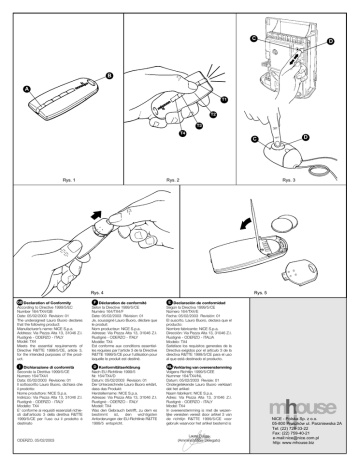 C D B A T1 T2 T3 T4 Rys. 1 Rys. 2 Rys. 4 Rys. 3 Rys. 5 GB Declaration of Conformity According to Directive 1999/5/EC Number 164/TX4/GB Date: 05/02/2003 Revision: 01 The undersigned Lauro Buoro declares that the following product: Manufacturer’s name: NICE S.p.a. Address: Via Pezza Alta 13, 31046 Z.I. Rustignè - ODERZO - ITALY Model: TX4 Meets the essential requirements of Directive R&TTE 1999/5/CE, article 3, for the intended purposes of the product. F Déclaration de conformité Selon la Directive 1999/5/CE Numéro 164/TX4/F Date: 05/02/2003 Révision: 01 Je, soussigné Lauro Buoro, déclare que le produit: Nom producteur: NICE S.p.a. Adresse: Via Pezza Alta 13, 31046 Z.I. Rustignè - ODERZO - ITALY Modèle: TX4 Est conforme aux conditions essentielles requises par l’article 3 de la Directive R&TTE 1999/5/CE pour l’utilisation pour laquelle le produit est destiné. E Declaración de conformidad Según la Directiva 1999/5/CE Número 164/TX4/E Fecha: 05/02/2003 Revisión: 01 El suscrito, Lauro Buoro, declara que el producto: Nombre fabricante: NICE S.p.a. Dirección: Via Pezza Alta 13, 31046 Z.I. Rustignè - ODERZO - ITALIA Modelo: TX4 Satisface los requisitos generales de la Directiva exigidos por el artículo 3 de la directiva R&TTE 1999/5/CE para el uso al que está destinado el producto. I Dichiarazione di conformità Secondo la Direttiva 1999/5/CE Numero 164/TX4/I Data: 05/02/2003 Revisione: 01 Il sottoscritto Lauro Buoro, dichiara che il prodotto: Nome produttore: NICE S.p.a. Indirizzo: Via Pezza Alta 13, 31046 Z.I. Rustignè - ODERZO - ITALY Modello: TX4 E’ conforme ai requisiti essenziali richiesti dall’articolo 3 della direttiva R&TTE 1999/5/CE per l’uso cui il prodotto è destinato D Konformitätserklärung Nach EU-Richtlinie 1999/5 Nr. 164/TX4/D Datum: 05/02/2003 Revision: 01 Der Unterzeichnete Lauro Buoro erklärt, dass das Produkt: Herstellername: NICE S.p.a. Adresse: Via Pezza Alta 13, 31046 Z.I. Rustignè - ODERZO - ITALY Modell: TX4 Was den Gebrauch betrifft, zu dem es bestimmt ist, den wichtigsten Anforderungen der EU-Richtlinie R&TTE 1999/5 entspricht. NL Verklaring van overeenstemming Volgens Richtlijn 1999/5/CEE Nummer 164/TX4/NL Datum: 05/02/2003 Revisie: 01 Ondergetekende Lauro Buoro verklaart dat het artikel: Naam fabrikant: NICE S.p.a. Adres: Via Pezza Alta 13, 31046 Z.I. Rustignè - ODERZO - ITALY Model: TX4 In overeenstemming is met de wezenlijke vereisten vereist door artikel 3 van de richtlijn R&TTE 1999/5/CE voor gebruik waarvoor het artikel bestemd is ODERZO, 05/02/2003 D C Lauro Buoro (Amministratore Delegato) NICE - Polska Sp. z o.o. 05-800 Pruszków ul. Parzniewska 2A Tel: (22) 728-33-22 Fax: (22) 759-40-21 e-mail:[email protected] http: www.mhouse.biz PL Pilot radiowy "TX4" Ostrzeżenie • MHOUSE nie bierze odpowiedzialności za jakiekolwiek szkody będące wynikiem niewłaściwego użycia produktu; dopuszczamy jedynie zastosowanie opisane w tej instrukcji. • Opakowanie produktu musi być usunięte zgodnie z odpowiednimi przepisami. •Chroń nadajnik przed wodą i innymi płynami. Jeżeli zamoknie, natychmiast przerwij używanie go i skontaktuj się z Serwisem NICE; dalsze używanie nadajnika może być niebezpieczne. • Nie kładź nadajnika w pobliżu źródeł ciepła lub przy otwartym ogniu. Może to uszkodzić nadajnik lub spowodować błędne działanie, pożar lub inne zagrożenie. •UWAGA: baterie pilota zawierają substancje szkodliwe: nie wyrzucaj ich do śmieci. Usuwając je kieruj się odpowiednimi przepisami dotyczącymi tego rodzaju odpadów. Opis i przeznaczenie Pilot TX4 (rys.1) jest przeznaczony do zdalnej obsługi odpowiedniego odbiornika radiowego (R2) lub centrali sterującej; jest kompatybilny z systemami automatyki MHOUSE i może być użyty tylko do tych zastosowań. Wczytywanie pilota sposobem 2 Przy wczytywaniu pilota sposobem 2 każdy jego przycisk może być dowolnie przypisany komendom centrali ("OTWIERA", "Otwiera częściowo", "Tylko otwiera", "Tylko zamyka") lub dowolnemu z 2 wyjść odbiornika radiowego (tabela 3). Przy wczytywaniu sposobem 2, każdy przycisk wymaga oddzielnego wczytania. 1. Naciśnij przycisk D (krótkie, szybkie naciśnięcia) tyle razy, ile wynosi numer wybranej funkcji, według poniższej tabeli ( na przykład 3 razy dla komendy "Tylko otwiera" lub dwa razy dla drugiego wyjścia odbiornika) Tabela 3 Przycisk D 1 raz 2 razy 3 razy 4 razy Centrala sterująca funkcja "OTWIERA" funkcja "Otwiera częściowo" funkcja "Tylko otwiera" funkcja "Tylko zamyka" Odbiornik radiowy aktywacja wyjścia 1 aktywacja wyjścia 2 nie wykorzystane nie wykorzystane Zawiera cztery przyciski mogące obsługiwać cztery różne funkcje jednej centrali sterującej, lub kilka (maksymalnie 4) różnych central lub odbiorników. 2. Upewnij się, że dioda C błyska seriami (tyle błysków w serii, ile wynosi numer wybranej funkcji). 3. W ciągu 10s naciśnij przeznaczony do wczytania przycisk pilota i przytrzymaj przez co najmniej 2s. Jeżeli procedura się powiodła, dioda C mignie 3 razy. Wysłanie komendy jest potwierdzone diodą [A] pokazaną na rys. 1. Zaczep [B] pozwala zaczepić pilot do kółka na klucze. 4. Jeśli chcesz inne piloty przyporządkować tej samej komendzie, powtórz krok 3 w ciągu 10s, lub faza wczytywania zakończy się automatycznie. Wczytywanie pilota Aby umożliwić współpracę pilota z centralą lub odbiornikiem, należy przeprowadzić procedurę wczytywania. Nowego pilota można wczytać dwoma sposobami: • Sposób 1: tak wczytany pilot realizuje największą ilość funkcji a poszczególne przyciski aktywują fabrycznie ustawione komendy. Oczywiście tak wczytany pilot może być użyty do sterowania tylko jedną centralą. W tym trybie przyciskom odpowiadają następujące komendy (rys. 2): Tabela 1 Pilot Przycisk T1 Przycisk T2 Przycisk T3 Przycisk T4 Centrala sterująca funkcja "OTWIERA" funkcja "Otwiera częściowo" funkcja "Tylko otwiera" funkcja "Tylko zamyka" Odbiornik radio