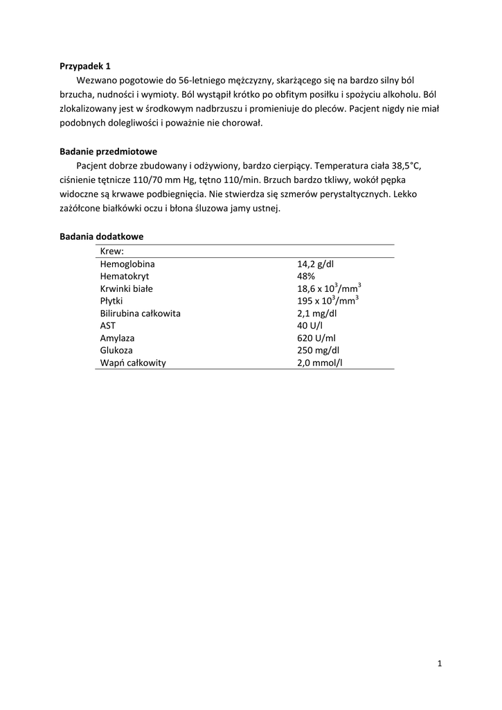 Przypadek 1 Wezwano pogotowie do 56-letniego mężczyzny, skarżącego się na bardzo silny ból brzucha, nudności i wymioty. Ból wystąpił krótko po obfitym posiłku i spożyciu alkoholu. Ból zlokalizowany jest w środkowym nadbrzuszu i promieniuje do pleców. Pacjent nigdy nie miał podobnych dolegliwości i poważnie nie chorował. Badanie przedmiotowe Pacjent dobrze zbudowany i odżywiony, bardzo cierpiący. Temperatura ciała 38,5°C, ciśnienie tętnicze 110/70 mm Hg, tętno 110/min. Brzuch bardzo tkliwy, wokół pępka widoczne są krwawe podbiegnięcia. Nie stwierdza się szmerów perystaltycznych. Lekko zażółcone białkówki oczu i błona śluzowa jamy ustnej. Badania dodatkowe Krew: Hemoglobina Hematokryt Krwinki białe Płytki Bilirubina całkowita AST Amylaza Glukoza Wapń całkowity 14,2 g/dl 48% 18,6 x 103/mm3 195 x 103/mm3 2,1 mg/dl 40 U/l 620 U/ml 250 mg/dl 2,0 mmol/l 1 Przypadek 2 Pod koniec czerwca do lekarza zgłosił się 25-letni mężczyzna z powodu powtarzających się napadów duszności. Pacjent od wielu lat leczy się z powodu alergicznego nieżytu nosa i sporadycznych duszności. Od 3 tygodni odczuwa pogorszenie samopoczucia oraz nocne duszności, kicha, ma ciągły katar i odczuwa pieczenie i łzawienie oczu. Podobne objawy występowały u niego w poprzednich latach, ale duszność bywała wówczas niewielka. Badanie przedmiotowe Chory przestraszony brakiem tchu, oczy załzawione, z nosa wydobywa się wodnista wydzielina. W badaniu osłuchowym stwierdza się wydłużenie wydechu oraz pojedyncze świsty. Badanie spirometryczne Wartości stwierdzone VC FEV1 FRC TLC FEV1 / VC 4.0 l 1.5 l 4.0 l 6.6 l 35% Wartości spodziewane u zdrowej osoby w tym samym wieku 4.9 l 3.9 l 3.6 l 6.0 l >80% 2 Przypadek 3 Do szpitala został przyjęty 70-letni mężczyzna z silną dusznością. Wiadomo, że pacjent od wielu lat leczy się z powodu nadciśnienia i cukrzycy typu 2. W przeszłości przebył 2 zawały serca. Badanie przedmiotowe Pacjent otyły, ewidentnie cierpiący, z silną dusznością okresowo przerywaną napadami kaszlu. Siedzi podparty na brzegu łóżka, z trudem łapiąc oddech, chwilami odkrztuszając różowo podbarwioną, pienistą plwocinę. Rytm oddechowy około 40/min. Ciśnienie tętnicze 150/95 mm Hg. Sylwetka serca powiększona, rytm serca miarowy 120/min. Nad polami płucnymi rozległe trzeszczenia, najsilniej wyrażone u podstawy płuc i sięgające do łopatek. Brzuch miękki, wątroba powiększona, wystaje 4 cm spod luku żebrowego, obrzęki kończyn dolnych i okolicy lędźwiowej, wyraźnie przepełnione żyły szyjne. Badania dodatkowe Krew: Hemoglobina 11,5 g/dl Hematokryt 36% Sód 130 mmol/l Potas 3,0 mmol/l Mocznik 55 mg/dl Kreatynina 1,4 mg/dl Albumina 3,8 g/dl ALT 50 U/l Cholesterol 280 mg/dl Glukoza 120 mg/dl pCO2 60 mm Hg pO2 55 mm Hg Saturacja O2 70% Troponina I W normie Ekg: Cechy przerostu lewej komory serca. Cechy przebytego zawału serca ściany dolnej i bocznej. Rtg klatki piersiowej: rozległe zacienienia obu płuc, szczególnie przy podstawie; płyn w obu jamach opłucnowych 3 Przypadek 4 Do kliniki endokrynologii została skierowana 30-letnia kobieta skarżąca się, że mimo ogromnego apetytu, straciła na wadze około 6 kg w ciągu minionych 3 miesięcy. W tym czasie zaczęła też nadmiernie się pocić, odczuwać kołatania serca i ogólną nerwowość. Badanie przedmiotowe Pacjentka szczupła, ale bez cech niedożywienia. Zwraca uwagę wyraźnie powiększona tarczyca, delikatna i wilgotna skóra oraz ledwo dostrzegalne drżenie rąk. Ciśnienie tętnicze 115/75 mm Hg, czynność serca około 115/min., okresowo niemiarowa. Badania dodatkowe Zlecono badanie T4 i TSH, cholesterolu, glukozy oraz badanie morfologiczne krwi i ekg. 4 Przypadek 5 Do lekarza zgłosił się 55-letni mężczyzna z bólem w nadbrzuszu i ogólnym osłabieniem. Bóle pojawiają się okresowo od około 6 miesięcy. Pacjent opisuje je jako dość silne i niepromieniujące; wskazuje na jeden konkretny punkt, gdzie odczuwa największy ból. Twierdzi, że ból często występuje na czczo i nieco łagodnieje po spożyciu posiłku lub środków zobojętniających. Próbował stosować również leki przeciwbólowe, ale one nie przynosiły ulgi, a wręcz zaostrzały dolegliwości. Od 2 miesięcy chory czuje się osłabiony i łatwo się męczy, co przypisuje wyczerpującej i stresującej pracy na kierowniczym stanowisku. Ostatnio zauważył też, że jego stolce stały się bardzo ciemne, „prawie czarne”, jednak nie zauważył, by zawierały krew. Mężczyzna nie pije alkoholu, wypala 15-20 papierosów dziennie. Badanie przedmiotowe Chory proporcjonalnie zbudowany o prawidłowej masie ciała, sprawia wrażenie osłabionego. Ciśnienie tętnicze 135/80 mm Hg. Tętno miarowe 95/min. Skóra i błona śluzowa jamy ustnej blada. Brzuch miękki, nieznaczna bolesność uciskowa w nadbrzuszu, objawy otrzewnowe ujemne. Badanie per rectum bez istotnych nieprawidłowości. Badania dodatkowe Krew: Hemoglobina 9,4 g/dl Hematokryt 36% Krwinki białe 7 x 103/mm3 Płytki 420 x 103/mm3 Żelazo 50 µg/dl Badanie endoskopowe górnego odcinka przewodu pokarmowego: zmiany w obrębie błony śluzowej dwunastnicy Badanie na obecność Helicobacter pylori: + 5 Przypadek 6 Do lekarza zgłosił się 26-letni mężczyzna, skarżąc się na pogłębiające się uczucie zmęczenia i nalany wygląd twarzy. Mówi, że w dzieciństwie chorował na nerki, ale nie potrafi podać bliższych szczegółów. Badanie przedmiotowe Pacjent jest blady i osłabiony. Wyraźne są ciastowate obrzęki na stopach i twarzy. Ciśnienie tętnicze 180/100 mm Hg, tętno miarowe 110/min. Badania dodatkowe Krew: Hemoglobina Mocznik Kreatynina Sód Potas Wapń Fosforany Albuminy Cholesterol Glukoza ASAT ALT Mocz: Białko Wałeczki ziarniste w osadzie Ekg: Wysokie, spiczaste załamki T 8,0 g/dl 240 mg/dl 8,2 mg/dl 135 mmol/l 6,5 mmol/l 2,0 mmol/l 2,8 mmol/l 3,2 g/dl 420 mg/dl 100 mg/dl 30 U/l 28 U/l ++ 6