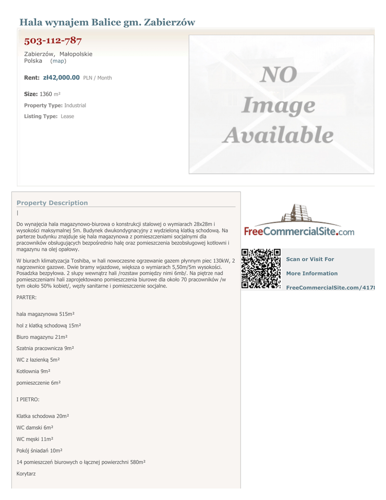 Hala wynajem Balice gm. Zabierzów 503-112-787 Zabierzów, Małopolskie Polska (map) Rent: zł42,000.00 PLN / Month Size: 1360 m² Property Type: Industrial Listing Type: Lease Property Description | Do wynajęcia hala magazynowo-biurowa o konstrukcji stalowej o wymiarach 28x28m i wysokości maksymalnej 5m. Budynek dwukondygnacyjny z wydzieloną klatką schodową. Na parterze budynku znajduje się hala magazynowa z pomieszczeniami socjalnymi dla pracowników obsługujących bezpośrednio halę oraz pomieszczenia bezobsługowej kotłowni i magazynu na olej opałowy. W biurach klimatyzacja Toshiba, w hali nowoczesne ogrzewanie gazem płynnym piec 130kW, 2 nagrzewnice gazowe. Dwie bramy wjazdowe, większa o wymiarach 5,50m/5m wysokości. Posadzka bezpyłowa. 2 słupy wewnątrz hali /rozstaw pomiędzy nimi 6mb/. Na piętrze nad pomieszczeniami hali zaprojektowano pomieszczenia biurowe dla około 70 pracowników /w tym około 50% kobiet/, węzły sanitarne i pomieszczenie socjalne. PARTER: hala magazynowa 515m² hol z klatką schodową 15m² Biuro magazynu 21m² Szatnia pracownicza 9m² WC z łazienką 5m² Kotłownia 9m² pomieszczenie 6m² I PIETRO: Klatka schodowa 20m² WC damski 6m² WC męski 11m² Pokój śniadań 10m² 14 pomieszczeń biurowych o łącznej powierzchni 580m² Korytarz Scan or Visit For More Information FreeCommercialSite.com/417871 Kontakt: Rafał Duda 507 894 500 *****************************ENG************************************ Storehouse and office space to let with steel construction (28mx28m) and max height 5m. It’s a two-story building with staircase. On the ground floor there is a storehouse and social room for staff. Moreover, there are a boiler room and fuel oils storage place. On the first floor there is office space designer for about 70 people. Ground floor: Storehouse 515m2 Staircase 15m2 Office space 21m2 Cloakroom 9m2 Toilet 5m2 Boiler room 9m2 Free room 6m2 1st floor: Staircase 20m2 Toilet(women) 6m2 Toilet(men) 6m2 Social room 10m2 14 office rooms (580m2) Corridor ::DODATKOWE INFORMACJE | Dozór budynku: tak - jest | Otoczenie: działki zabudowane | Komunikacja publ.: autobus | Recepcja: TAK | Sieć komputerowa: TAK | Położenie: obrzeża miasta | Teren ogrodzony: TAK | Plac utwardzany: TAK | Plac manewrowy: TAK | Ilość kondygnacji: 2 | Winda towarowa: TAK | Ilość wrót wejśc.: 2 | Możliwość wjazdu TIR-a: TAK | Posadzka niepyląca: TAK | Ukształtowanie działki: płaska | Kształt działki: prostokąt | Rok budowy: 2010 | Przeznaczenie hali: produkcyjno-magazynowy | Typ kaucji: jednomiesięczna | ::LINK DO STRONY | http://sadurscy.pl/oferta.aspx?id=256815 ::KONTAKT DO AGENTA | Dariusz Zieliński | 503-112-787 | [email protected] ::DANE BIURA | Bracia Sadurscy Czarnowiejska - Rynek Pierwotny | Czarnowiejska 51/5 | 30-049 Kraków | 12 630-90-45 | sadurscy.pl Pośrednik odpowiedzialny zawodowo za wykonanie umowy pośrednictwa: Magdalena Kempkowska (licencja nr: 11849) -------------------------::GRATIS | Nasza prowizja zawiera: koszt przedwstępnej notarialnej umowy sprzedaży nieruchomości z rynku wtórnego, projekt kuchni - przygotowany przez www.4funstudio.pl gratis, promocyjne ceny architekta wnętrz i łazienek! Security: Building's custody: as-is Year Built: 2010