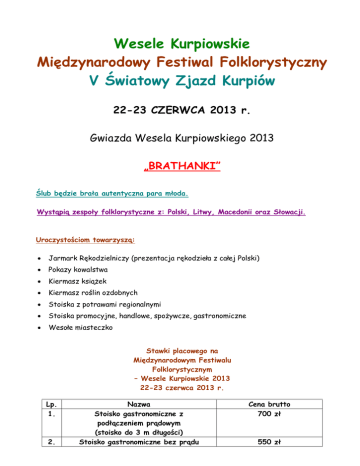 Wesele Kurpiowskie Mi dzynarodowy Festiwal Folklorystyczny V wiatowy Zjazd Kurpiów 22-23 CZERWCA 2013 r. Gwiazda Wesela Kurpiowskiego 2013 „BRATHANKI” lub b dzie bra a autentyczna para m oda. Wyst pi zespo y folklorystyczne z: Polski, Litwy, Macedonii oraz S owacji. Uroczysto ciom towarzysz : Jarmark R kodzielniczy (prezentacja r kodzie a z ca ej Polski) Pokazy kowalstwa Kiermasz ksi ek Kiermasz ro lin ozdobnych Stoiska z potrawami regionalnymi Stoiska promocyjne, handlowe, spo ywcze, gastronomiczne Weso e miasteczko Stawki placowego na Mi dzynarodowym Festiwalu Folklorystycznym – Wesele Kurpiowskie 2013 22-23 czerwca 2013 r. Lp. 1. 2. Nazwa Stoisko gastronomiczne z pod czeniem pr dowym (stoisko do 3 m d ugo ci) Stoisko gastronomiczne bez pr du Cena brutto 700 z 550 z 3. 4. 5. 6. 7. (stoisko do 3 m d ugo ci) Lody (stoisko do 3 m d ugo ci) Wata cukrowa, popcorn (stoisko do 3 m d ugo ci) Zabawki (stoisko do 3 m d ugo ci Inne (stoisko do 3 m d ugo ci) Wjazd samochodu z towarem 500 z 500 z 500 z 500 z 350 z netto Wp at prosimy dokona do 14 czerwca przed imprez na konto: Bank Spó dzielczy w Kadzidle Nr konta: 19 8916 0002 0000 0071 2000 0010 z dopiskiem: Wesele Kurpiowskie 2013. Wp aty dokonywane w dniu Wesela s wy sze o 50 z . UWAGA!!! ::: TWÓRCY LUDOWI Z GMINY KADZID O – BEZP ATNIE ::: MIESZKA CY GMINY KADZID O – R KODZIE O – 30 Z WI CEJ INFORMACJI POD NUMEREM TELEFONU: (29) 761.80.26