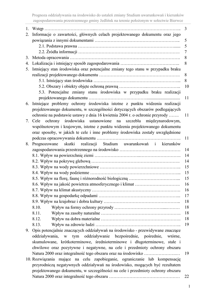 Prognoza oddziaływania na środowisko do ustaleń zmiany Studium uwarunkowań i kierunków zagospodarowania przestrzennego gminy Jedlińsk na terenie położonym w sołectwie Bierwce 1. Wstęp ……………………………...………………………………………………….. 2. Informacje o zawartości, głównych celach projektowanego dokumentu oraz jego powiązania z innymi dokumentami ………………………………………………….. 2.1. Podstawa prawna …………………………………………………………...... 2.2. Źródła informacji ……………………………………………………………. 3. Metoda opracowania …………………………………………………………………. 4. Lokalizacja i istniejący sposób zagospodarowania ………………………………….. 5. Istniejący stan środowiska oraz potencjalne zmiany tego stanu w przypadku braku realizacji projektowanego dokumentu ………………………….……………………. 5.1. Istniejący stan środowiska ……………………….…………………………... 5.2. Obszary i obiekty objęte ochroną prawną ………………..………………….. 5.3. Potencjalne zmiany stanu środowiska w przypadku braku realizacji projektowanego dokumentu ……………………….…………............................... 6. Istniejące problemy ochrony środowiska istotne z punktu widzenia realizacji projektowanego dokumentu, w szczególności dotyczących obszarów podlegających ochronie na podstawie ustawy z dnia 16 kwietnia 2004 r. o ochronie przyrody ……. 7. Cele ochrony środowiska ustanowione na szczeblu międzynarodowym, wspólnotowym i krajowym, istotne z punktu widzenia projektowanego dokumentu oraz sposoby, w jakich te cele i inne problemy środowiska zostały uwzględnione podczas opracowywania dokumentu …………………………………………………. 8. Prognozowane skutki realizacji Studium uwarunkowań i kierunków zagospodarowania przestrzennego na środowisko …………………………………… 8.1. Wpływ na powierzchnię ziemi …………………………..………………………. 8.2. Wpływ na pokrywę glebową ……………………………………………………. 8.3. Wpływ na wody powierzchniowe ……………………………………………….. 8.4. Wpływ na wody podziemne ……………………………………………………... 8.5. Wpływ na florę, faunę i różnorodność biologiczną ……………………………... 8.6. Wpływ na jakość powietrza atmosferycznego i klimat …………………………. 8.7. Wpływ na klimat akustyczny ……………………………………………………. 8.8. Wpływ na gospodarkę odpadami ………………………………………………... 8.9. Wpływ na krajobraz i dobra kultury …………………………………………….. 8.10. Wpływ na formy ochrony przyrody ……………………………....……… 8.11. Wpływ na zasoby naturalne ………………………………………………. 8.12. Wpływ na dobra materialne ………………………………………………. 8.13. Wpływ na zdrowie ludzi ………………………………………………….. 9. Opis potencjalnie znaczących oddziaływań na środowisko - przewidywane znaczące oddziaływania, w tym oddziaływanie bezpośrednie, pośrednie, wtórne, skumulowane, krótkoterminowe, średnioterminowe i długoterminowe, stałe i chwilowe oraz pozytywne i negatywne, na cele i przedmioty ochrony obszaru Natura 2000 oraz integralność tego obszaru oraz na środowisko ………………….… 10. Rozwiązania mające na celu zapobieganie, ograniczanie lub kompensację przyrodniczą negatywnych oddziaływań na środowisko, mogących być rezultatem projektowanego dokumentu, w szczególności na cele i przedmioty ochrony obszaru Natura 2000 oraz integralność tego obszaru …………………….…………………… 3 5 5 7 8 8 8 8 10 11 11 11 14 14 14 15 15 15 16 16 17 18 18 18 18 19 19 22 1 Prognoza oddziaływania na środowisko do ustaleń zmiany Studium uwarunkowań i kierunków zagospodarowania przestrzennego gminy Jedlińsk na terenie położonym w sołectwie Bierwce 11. Rozwiązania alternatywne do rozwiązań zawartych w projektowanym dokumencie wraz z uzasadnieniem ich wyboru oraz opis metod dokonania oceny prowadzącej do tego wyboru albo wyjaśnienie braku rozwiązań alternatywnych, w tym wskazania napotkanych trudności wynikających z niedostatków techniki lub luk we współczesnej wiedzy ……............................................................................................. 12. Ocena warunków zagospodarowania przestrzennego ………………………………... 13. Propozycje dotyczące przewidywanych metod analizy skutków realizacji postanowień projektowanego dokumentu oraz częstotliwości jej przeprowadzania … 14. Informacje o możliwym transgranicznym oddziaływaniu na środowisko …………… 15. Informacje zawarte w prognozach oddziaływania na środowisko innych dokumentów powiązanych z projektowanym dokumentem …………………………. 16. Przedstawienie zagadnień w formie graficznej ………………………………………. 17. Streszczenie w języku niespecjalistycznym ………………………………………….. 18. Adresowanie prognozy ……………………………………………………………….. 22 23 24 24 24 24 25 27 2 Prognoza oddziaływania na środowisko do ustaleń zmiany Studium uwarunkowań i kierunków zagospodarowania przestrzennego gminy Jedlińsk na terenie położonym w sołectwie Bierwce 1. WSTĘP Obowiązek przeprowadzenia procedury strategicznej oceny oddziaływania na środowisko do zmiany Studium uwarunkowań i kierunków zagospodarowania przestrzennego gminy Jedlińsk na terenie położonym w sołectwie Bierwce wynika z art. 