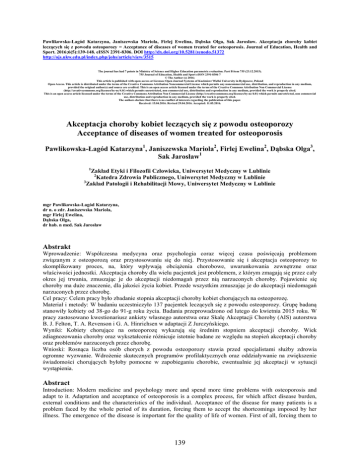 Pawlikowska-Łagód Katarzyna, Janiszewska Mariola, Firlej Ewelina, Dąbska Olga, Sak Jarosław. Akceptacja choroby kobiet leczących się z powodu osteoporozy = Acceptance of diseases of women treated for osteoporosis. Journal of Education, Health and Sport. 2016;6(5):139-148. eISSN 2391-8306. DOI http://dx.doi.org/10.5281/zenodo.51372 http://ojs.ukw.edu.pl/index.php/johs/article/view/3515 The journal has had 7 points in Ministry of Science and Higher Education parametric evaluation. Part B item 755 (23.12.2015). 755 Journal of Education, Health and Sport eISSN 2391-8306 7 © The Author (s) 2016; This article is published with open access at Licensee Open Journal Systems of Kazimierz Wielki University in Bydgoszcz, Poland Open Access. This article is distributed under the terms of the Creative Commons Attribution Noncommercial License which permits any noncommercial use, distribution, and reproduction in any medium, provided the original author(s) and source are credited. This is an open access article licensed under the terms of the Creative Commons Attribution Non Commercial License (http://creativecommons.org/licenses/by-nc/4.0/) which permits unrestricted, non commercial use, distribution and reproduction in any medium, provided the work is properly cited. This is an open access article licensed under the terms of the Creative Commons Attribution Non Commercial License (http://creativecommons.org/licenses/by-nc/4.0/) which permits unrestricted, non commercial use, distribution and reproduction in any medium, provided the work is properly cited. The authors declare that there is no conflict of interests regarding the publication of this paper. Received: 15.04.2016. Revised 29.04.2016. Accepted: 11.05.2016. Akceptacja choroby kobiet leczących się z powodu osteoporozy Acceptance of diseases of women treated for osteoporosis Pawlikowska-Łagód Katarzyna1, Janiszewska Mariola2, Firlej Ewelina2, Dąbska Olga3, Sak Jarosław1 1 Zakład Etyki i Filozofii Człowieka, Uniwersytet Medyczny w Lublinie 2 Katedra Zdrowia Publicznego, Uniwersytet Medyczny w Lublinie 3 Zakład Patologii i Rehabilitacji Mowy, Uniwersytet Medyczny w Lublinie mgr Pawlikowska-Łagód Katarzyna, dr n. o zdr. Janiszewska Mariola, mgr Firlej Ewelina, Dąbska Olga, dr hab. n med. Sak Jarosław Abstrakt Wprowadzenie: Współczesna medycyna oraz psychologia coraz więcej czasu poświęcają problemom związanym z osteoporozą oraz przystosowaniu się do niej. Przystosowanie się i akceptacja osteoporozy to skomplikowany proces, na, który wpływają obciążenia chorobowe, uwarunkowania zewnętrzne oraz właściwości jednostki. Akceptacja choroby dla wielu pacjentek jest problemem, z którym zmagają się przez cały okres jej trwania, zmuszając je do akceptacji niedomagań przez nią narzuconych choroby. Pojawienie się choroby ma duże znaczenie, dla jakości życia kobiet. Przede wszystkim zmuszając je do akceptacji niedomagań narzuconych przez chorobę. Cel pracy: Celem pracy było zbadanie stopnia akceptacji choroby kobiet chorujących na osteoporozę. Materiał i metody: W badaniu uczestniczyło 137 pacjentek leczących się z powodu osteoporozy. Grupę badaną stanowiły kobiety od 38-go do 91-g roku życia. Badania przeprowadzono od lutego do kwietnia 2015 roku. W pracy zastosowano kwestionariusz ankiety własnego autorstwa oraz Skalę Akceptacji Choroby (AIS) autorstwa B. J. Felton, T. A. Revenson i G. A. Hinrichsen w adaptacji Z Jurczyńskiego. Wyniki: Kobiety chorujące na osteoporozę wykazują się średnim stopniem akceptacji choroby. Wiek zdiagnozowania choroby oraz wykształcenie różnicuje istotnie badane ze względu na stopień akceptacji choroby oraz problemów narzuconych przez chorobę. Wnioski: Rosnąca liczba osób chorych z powodu osteoporozy stawia przed specjalistami służby zdrowia ogromne wyzwanie. Wdrożenie skutecznych programów profilaktycznych oraz oddziaływanie na zwiększenie świadomości chorujących byłoby pomocne w zapobieganiu chorobie, ewentualnie jej akceptacji w sytuacji wystąpienia. Abstract Introduction: Modern medicine and psychology more and spend more time problems with osteoporosis and adapt to it. Adaptation and acceptance of osteoporosis is a complex process, for which affect disease burden, external conditions and the characteristics of the individual. Acceptance of the disease for many patients is a problem faced by the whole period of its duration, forcing them to accept the shortcomings imposed by her illness. The emergence of the disease is important for the quality of life of women. First of all, forcing them to 139 accept the shortcomings imposed by the disease. The aim of the study was to examine the degree of acceptance of the disease women suffering from osteoporosis. Material and Methods: The study included 137 patients treated for osteoporosis. The study group were women from 38 th to 91th years. The study was conducted from February to April 2015. The study used a questionnaire survey of his own authorship and Acceptance of Illness Scale (AIS) by B. J. Felton, Revenson T. A. and G. A. Hinrichsen adaptation With Jurczyński. Results: Women suffering from osteoporosis have an average degree of acceptance of the disease. Age diagnose the disease and education differentiates significantly tested due to the degree of acceptance of the disease and the problems imposed by the disease. Conclusions: The increasing number of patients suffering from osteoporosis poses to health care professionals a huge challenge. The implementation of effective prevention programs and impact on increasing awareness of suffering would be helpful in the prevention of disease, or to accept it in a situation occur. Słowa kluczowe: akceptacja choroby, osteoporoza, kobieta. Keywords: acceptance of illness, osteoporosis, women. Wstęp Osteoporoza stanowi jeden z istotnych problemów zdrowotnych, społecznych i ekonomicznych współczesnego świata. Obok nadciśnienia tętniczego, cu