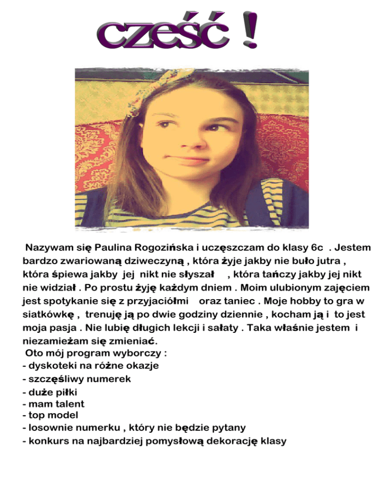 Nazywam się Paulina Rogozińska i uczęszczam do klasy 6c . Jestem bardzo zwariowaną dziweczyną , która żyje jakby nie buło jutra , która śpiewa jakby jej nikt nie słyszał , która tańczy jakby jej nikt nie widział . Po prostu żyję każdym dniem . Moim ulubionym zajęciem jest spotykanie się z przyjaciółmi oraz taniec . Moje hobby to gra w siatkówkę , trenuję ją po dwie godziny dziennie , kocham ją i to jest moja pasja . Nie lubię długich lekcji i sałaty . Taka właśnie jestem i niezamieżam się zmieniać. Oto mój program wyborczy : - dyskoteki na różne okazje - szczęśliwy numerek - duże piłki - mam talent - top model - losownie numerku , który nie będzie pytany - konkurs na najbardziej pomysłową dekorację klasy - Quizy - kolorowy piątek = czyli wszyscy w klasie ubierają się na dany kolor również nauczyciele - miss i misster szkoły - randka w ciemno - organizacja międzi klasowego turnieju piłki nożnej i piłki siatkowej Mam nadzieję że oddacie na mnie swój cenny głos !