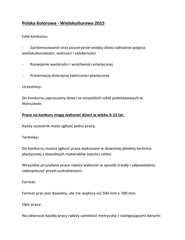 Polska Kolorowa - Wielokulturowa 2015 Cele konkursu: Zainteresowanie oraz poszerzenie wiedzy dzieci odnośnie pojęcia wielokulturowości, wolności i solidarności - Rozwijanie wyobraźni i wrażliwości estetycznej - Prezentacja dziecięcej twórczości plastycznej Uczestnicy: Do konkursu zapraszamy dzieci ze wszystkich szkół podstawowych w Warszawie. Prace na konkurs mogą wykonać dzieci w wieku 6-12 lat. Każdy uczestnik może zgłosić jedna pracę. Technika: Do konkursu można zgłosić prace wykonane w dowolnej płaskiej technice plastycznej z dowolnych materiałów (oprócz szkła). Wszystkie przysyłane prace należy wykonać w sposób trwały i odpowiednio zabezpieczyć przed uszkodzeniem. Format: Format prac jest dowolny, ale nie większy niż 500 mm x 700 mm. Opis pracy: Na odwrocie każdej pracy należy zamieścić metryczkę z następującymi danymi: a) imię i nazwisko uczestnika b) wiek uczestnika c) imię i nazwisko nauczyciela d) adres i telefon placówki e) e-mail placówki Nadsyłania prac: Prace należy wysłać na adres: Bednarska Szkoła Podstawowa ul. Kawalerii 5, 00-468 Warszawa z dopiskiem KONKURS- Polska Kolorowa-Wielokulturowa do dnia 30 listopada 2015 Wystawa: W dniu rozstrzygnięcia konkursu na stronie internetowej Bednarskiej Szkoły Podstawowej zostanie otworzona Wirtualna Wystawa wszystkich zgłoszonych prac. Przewidziane są nagrody dla najlepszych prac. organizator na terenie szkoły – p. Diana Zajkowska