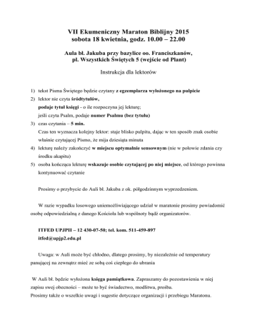 VII Ekumeniczny Maraton Biblijny 2015 sobota 18 kwietnia, godz. 10.00 – 22.00 Aula bł. Jakuba przy bazylice oo. Franciszkanów, pl. Wszystkich Świętych 5 (wejście od Plant) Instrukcja dla lektorów 1) tekst Pisma Świętego będzie czytany z egzemplarza wyłożonego na pulpicie 2) lektor nie czyta śródtytułów, podaje tytuł księgi - o ile rozpoczyna jej lekturę; jeśli czyta Psalm, podaje numer Psalmu (bez tytułu) 3) czas czytania – 5 min. Czas ten wyznacza kolejny lektor: staje blisko pulpitu, dając w ten sposób znak osobie właśnie czytającej Pismo, że mija dziesiąta minuta 4) lekturę należy zakończyć w miejscu optymalnie sensownym (nie w połowie zdania czy środku akapitu) 5) osoba kończąca lekturę wskazuje osobie czytającej po niej miejsce, od którego powinna kontynuować czytanie Prosimy o przybycie do Auli bł. Jakuba z ok. półgodzinnym wyprzedzeniem. W razie wypadku losowego uniemożliwiającego udział w maratonie prosimy powiadomić osobę odpowiedzialną z danego Kościoła lub wspólnoty bądź organizatorów. ITFED UPJPII – 12 430-07-50; tel. kom. 511-459-897 [email protected] Uwaga: w Auli może być chłodno, dlatego prosimy, by niezależnie od temperatury panującej na zewnątrz mieć ze sobą coś ciepłego do ubrania W Auli bł. będzie wyłożona księga pamiątkowa. Zapraszamy do pozostawienia w niej zapisu swej obecności – może to być świadectwo, modlitwa, prośba. Prosimy także o wszelkie uwagi i sugestie dotyczące organizacji i przebiegu Maratonu.