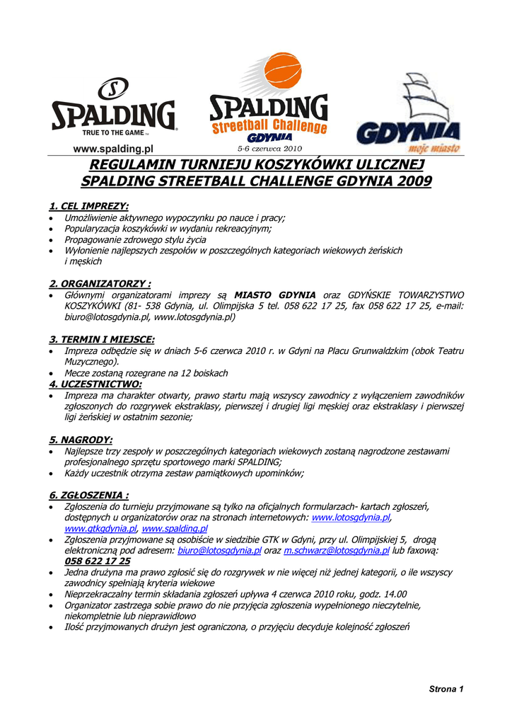 REGULAMIN TURNIEJU KOSZYKÓWKI ULICZNEJ SPALDING STREETBALL CHALLENGE GDYNIA 2009 1. CEL IMPREZY: Umożliwienie aktywnego wypoczynku po nauce i pracy; Popularyzacja koszykówki w wydaniu rekreacyjnym; Propagowanie zdrowego stylu życia Wyłonienie najlepszych zespołów w poszczególnych kategoriach wiekowych żeńskich i męskich 2. ORGANIZATORZY : Głównymi organizatorami imprezy są MIASTO GDYNIA oraz GDYŃSKIE TOWARZYSTWO KOSZYKÓWKI (81- 538 Gdynia, ul. Olimpijska 5 tel. 058 622 17 25, fax 058 622 17 25, e-mail: [email protected], www.lotosgdynia.pl) 3. TERMIN I MIEJSCE: Impreza odbędzie się w dniach 5-6 czerwca 2010 r. w Gdyni na Placu Grunwaldzkim (obok Teatru Muzycznego). Mecze zostaną rozegrane na 12 boiskach 4. UCZESTNICTWO: Impreza ma charakter otwarty, prawo startu mają wszyscy zawodnicy z wyłączeniem zawodników zgłoszonych do rozgrywek ekstraklasy, pierwszej i drugiej ligi męskiej oraz ekstraklasy i pierwszej ligi żeńskiej w ostatnim sezonie; 5. NAGRODY: Najlepsze trzy zespoły w poszczególnych kategoriach wiekowych zostaną nagrodzone zestawami profesjonalnego sprzętu sportowego marki SPALDING; Każdy uczestnik otrzyma zestaw pamiątkowych upominków; 6. ZGŁOSZENIA : Zgłoszenia do turnieju przyjmowane są tylko na oficjalnych formularzach- kartach zgłoszeń, dostępnych u organizatorów oraz na stronach internetowych: www.lotosgdynia.pl, www.gtkgdynia.pl, www.spalding.pl Zgłoszenia przyjmowane są osobiście w siedzibie GTK w Gdyni, przy ul. Olimpijskiej 5, drogą elektroniczną pod adresem: [email protected] oraz [email protected] lub faxową: 058 622 17 25 Jedna drużyna ma prawo zgłosić się do rozgrywek w nie więcej niż jednej kategorii, o ile wszyscy zawodnicy spełniają kryteria wiekowe Nieprzekraczalny termin składania zgłoszeń upływa 4 czerwca 2010 roku, godz. 14.00 Organizator zastrzega sobie prawo do nie przyjęcia zgłoszenia wypełnionego nieczytelnie, niekompletnie lub nieprawidłowo Ilość przyjmowanych drużyn jest ograniczona, o przyjęciu decyduje kolejność zgłoszeń Strona 1 7. PRZEPISY GRY : a) każda drużyna składa się z czterech zawodników (w tym jeden rezerwowy), którzy przed przystąpieniem do gry muszą zostać zgłoszeni do głównego organizatora i zarejestrowani; b) mecz musi rozpocząć minimum trzech zawodników, natomiast kończyć musi minimum dwóch; c) organizatorzy mają prawo do dyskwalifikacji z turnieju zawodnika lub całego zespołu w następujących sytuacjach: występ w zespole zawodnika zarejestrowanego lub nie zgłoszonego do turnieju ; fałszywego zaniżenia wieku przez uczestnika turnieju; wybitnie niesportowego zachowanie d) zawodnicy muszą posiadać i na żądanie organizatora okazać aktualny dokument tożsamości z datą urodzenia i zdjęciem; odmowa okazania takiego dokumentu może spowodować zawieszenie występów lub nawet wykluczenie zawodnika; e) gra toczy się na boisku o wymiarach 8,0 x 8,0 m., na jeden kosz; łukowata linia przerywana odległa od pionowej osi symetrii tablicy o 5 m., dzieli boisko na strefy rzutów za 1 pkt. oraz 2 pkt.; f) zespołom przysługuje prawo do 3 minutowej rozgrzewki, zespół rozpoczynający grę wyłaniany jest drogą losowania; g) po każdym zdobytym koszu piłka wprowadzana jest do gry przez zespół przeciwny zza linii końcowej naprzeciw kosza; a po każdej zmianie posiadania piłka musi ona zostać wyprowadzona spoza linii 5 metrów; h) piłka przed wprowadzeniem do gry musi zostać dotknięta przez obrońcę, przed rzutem do kosza musi zostać wykonane minimum jedno podanie; i) po faulu, błędzie kroków i innych wykroczeniach powodujących zmiany posiadania piłki, drużyna przeciwna wprowadza ją do gry zza linii końcowej naprzeciw kosza; j) każdy zespół ma prawo do jednej 30 sekundowej przerwy na naradę; k) w sytuacjach gdy dojdzie do wspólnego trzymania piłki, grę wznawia zza linii końcowej na wprost kosza zespół broniący; l) zmian zawodników można dokonywać tylko gdy piłka nie jest w grze; m) gra toczy się do zdobycia 15 punktów (przy minimum dwóch punktach różnicy) lub trwa 10 minut, wygrywa zespół który zdobędzie większą ilość punktów, w przypadku remisu wygrywa zespół który ostatni zdobędzie punkt; organizator ma jednak prawo do zmiany czasu gry w przypadku dużej liczby zespołów n) zawodnicy sami zgłaszają faule, w przypadkach spornych decyduje sędzia; w wyjątkowych sytuacjach sędzia może sam podjąć decyzję o faulu mimo braku sygnalizacji ze strony zawodników; o) jeżeli zawodnik jest faulowany w trakcie oddawania rzutu i rzut jest celny, to punkty zostają zaliczone, a piłka pozostaje w posiadaniu zespołu atakującego, gdy rzut jest niecelny piłka wprowadzana jest do gry zza linii końcowej na wprost kosza; p) rzuty wolne mogą być przyznane w przypadku faulu brutalnego, przewinienia umyślnego lub niesportowego zachowania, po wykonaniu dwóch rzutów piłka pozostaje w posiadaniu zespołu wykonującego rzuty; dwa przewinienia powodujące rzuty wolne wykluczają zawodnika z gry; q) zawodnik lub zawodnicy którzy wdadzą się w bójkę zostaną wykluczeni z turnieju; r) zabrania się wkładania piłki z góry do koszy, punkty zdobyte w ten sposób nie będą zaliczone, a zawodnik zostanie ukarany za niesportowe zachowanie; s) w grach grupowych o końcowej kolejności drużyn decydują: ilość zwycięstw, wynik bezpośredniego meczu, różnica zdobytych i straconych punktów we wszystkich meczach, stosunek punktów zdobytych do straconych, losowanie. t) we wszystkich spornych kwestiach dotyczących gry glos decydujący ma sędzia, on też jest odpowiedzialny za odmierzanie czasu gry i liczenie zdobywanych punktów, sędzia powinien na bieżąco informować zespoły o czasie gry i wyniku meczu; 8. POSTANOWIENIA KOŃCOWE Obowiązuje wpisowe w wysokości 10 zł od osoby Organizatorzy zabezpieczają uczestnikom ubezpieczenie od następstw nieszczęśliwych wypadków. We wszystkich sprawach s