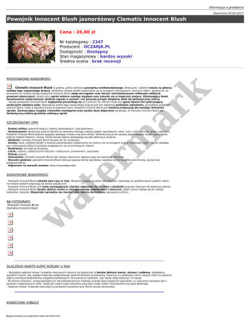 Informacje o produkcie Utworzono 03-03-2017 Powojnik Innocent Blush jasnoróżowy Clematis Innocent Blush Cena : 26,90 zł Nr katalogowy : 2347 Producent : OCZARJK.PL Dostępność : Dostępny Stan magazynowy : bardzo wysoki Średnia ocena : brak recenzji PODSTAWOWE WIADOMOŚCI SZCZEGÓŁOWY OPIS er m ar k Clematis Innocent Blush to piękna, polska odmiana powojnika wielkokwiatowego. Atrakcyjne, subtelne kwiaty są główną ozdobą tego wspaniałego pnącza. Delikatnie różowe działki wybarwione są na brzegach intensywnym, ciemnym różem. Sprawia to, że poruszone na wietrze kwiaty powojnika Innocent Blush zdają się migotać oraz iskrzyć różnokolorowymi refleksami odbitych promieni słonecznych. Dzięki temu ogród nabiera nowego wyglądu oraz zmienia się w magiczne miejsce. Olśniewający blask fenomenalnie wybarwionych płatków zapada w pamięć i nie pozwala przejść obojętnie obok tej fantastycznej rośliny. Kwiaty powojnika Innocent Blush najpiękniej prezentują się na ciemnym tle, którym może być gęsty dywan liści pokrywający atrakcyjnie splątane pędy. Największą zaletą tego wspaniałego pnącza jest bez wątpienia podwójne zakwitanie, szczególnie pożądane późnym latem, kiedy w ogrodzie zaczyna brakować barw. Powojnik Innocent Blush jest świetną propozycją dla każdego miłośnika ogrodu. Zachwycający wygląd, niewielkie wymagania oraz bardzo duża odporność sprawiają, że clematis Innocent Blush jest fantastyczną rośliną genialnie zdobiącą ogród. - Rodzaj rośliny: powojnik pnący z rodziny jaskrowatych, rząd jaskrowce. - Zastosowanie: atrakcyjne pnącze idealne do dekoracji różnego rodzaju podpór ogrodowych, altan, krat, a także murów, ścian i ogrodzeń. Powojnik Innocent Blush pięknie wygląda oplatając krzewy oraz pnie drzew. Świetne pnącze do uprawy pojemnikowej, dzięki czemu może pięknie ozdobić balkony i tarasy. Ścięte kwiaty dobrze sprawdzają się jako dekoracja wnętrza. - Wielkość: clematis Innocent Blush dorasta do 3m wysokości. - Kwiaty: duże, ozdobne działki w kolorze jasnoróżowym wybarwione na ciemny róż na brzegach oraz w środkowej części. Pręciki składają się z intensywnie żółtych pylników znajdujących się na kremowych nitkach. - Kwitnienie: od maja do września. - Liście: zielone z zaostrzonymi końcami i widocznym unerwieniem, sezonowe. - Pokrój: pnącze. - Stanowisko: clematis Innocent Blush lubi miejsca słoneczne, dobrze czuje się również w półcieniu. - Warunki glebowe: powojnik Innocent Blush toleruje typową ziemię ogrodową, najlepiej rośnie na glebie próchniczej, żyznej oraz przepuszczalnej. - Odporność na warunki zimowe: duża mrozoodporność. DODATKOWE WIADOMOŚCI NA FOTOGRAFII w Powojnik Innocent Blush Clematis Innocent Blush at - Powojnik Innocent Blush zakwita dwa razy w roku. Wiosenne kwiaty są pełne lub półpełne i zakwitają na zeszłorocznych pędach, latem na nowych pędach pojawiają się kwiaty pojedyncze. - Powojnik Innocent Blush jest mało wymagającym i bardzo odpornym na choroby i szkodniki pnączem idealnym do dekoracji ogrodu. - Powojnik Innocent Blush bardzo dobrze rośnie w różnego rodzaju pojemnikach i donicach, dzięki czemu nadaje się do ozdoby balkonów i tarasów. Wspaniale sprawdza się również jako roślina doniczkowa uprawiana w domu. DLACZEGO WARTO KUPIĆ ROŚLINY U NAS - Wszystkie sadzonki drzew i krzewów owocowych staramy się dostarczać w bardzo dobrym stanie, zdrowe i zadbane. Dokładamy wszelkich starań, aby wygląd materiału sadzeniowego spełniał Państwa oczekiwania. Poza tym na większości stron naszych ofert na ostatnim zdjęciu poniżej przedstawiamy wygląd przykładowych rzeczywistych sadzonek, aby każdy mógł zobaczyć co kupuje. - W okresie zimowym, wczesnowiosennym lub późnojesiennym możliwe są braki poszczególnych gatunków, co naturalnie związane jest z sezonem wegetacyjnym roślin. Sadzonki często mają naturalnie przycięte czubki celem rozkrzewienia się pędu głównego. - Sadzonki drzew i krzewów owocowych przeważnie wysyłane są w formie paczki kartonowej. KONIECZNIE ZOBACZ Wygenerowano w programie www.oscGold.com er m ar k at w