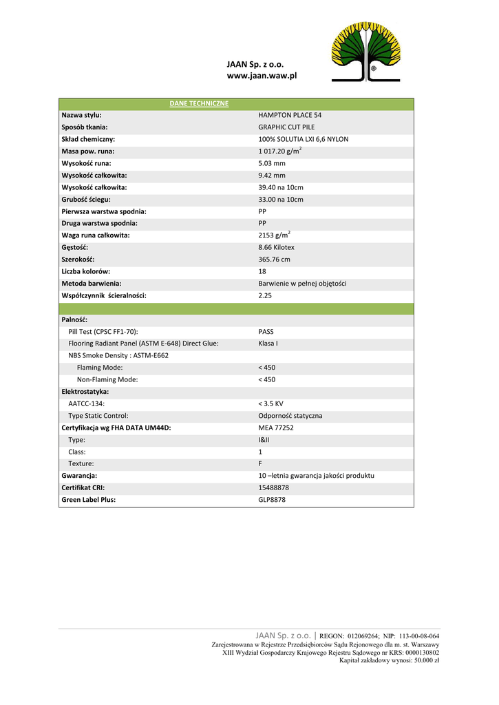 JAAN Sp. z o.o. www.jaan.waw.pl DANE TECHNICZNE Nazwa stylu: HAMPTON PLACE 54 Sposób tkania: GRAPHIC CUT PILE Skład chemiczny: 100% SOLUTIA LXI 6,6 NYLON Masa pow. runa: 1 017.20 g/m Wysokość runa: 5.03 mm Wysokość całkowita: 9.42 mm Wysokość całkowita: 39.40 na 10cm Grubość ściegu: 33.00 na 10cm Pierwsza warstwa spodnia: PP Druga warstwa spodnia: PP Waga runa całkowita: 2153 g/m Gęstość: 8.66 Kilotex Szerokość: 365.76 cm Liczba kolorów: 18 Metoda barwienia: Barwienie w pełnej objętości Współczynnik ścieralności: 2.25 2 2 Palność: Pill Test (CPSC FF1-70): PASS Flooring Radiant Panel (ASTM E-648) Direct Glue: Klasa I NBS Smoke Density : ASTM-E662 Flaming Mode: < 450 Non-Flaming Mode: < 450 Elektrostatyka: AATCC-134: < 3.5 KV Type Static Control: Odporność statyczna Certyfikacja wg FHA DATA UM44D: MEA 77252 Type: I&II Class: 1 Texture: F Gwarancja: 10 –letnia gwarancja jakości produktu Certifikat CRI: 15488878 Green Label Plus: GLP8878 JAAN Sp. z o.o. | REGON: 012069264; NIP: 113-00-08-064 Zarejestrowana w Rejestrze Przedsiębiorców Sądu Rejonowego dla m. st. Warszawy XIII Wydział Gospodarczy Krajowego Rejestru Sądowego nr KRS: 0000130802 Kapitał zakładowy wynosi: 50.000 zł