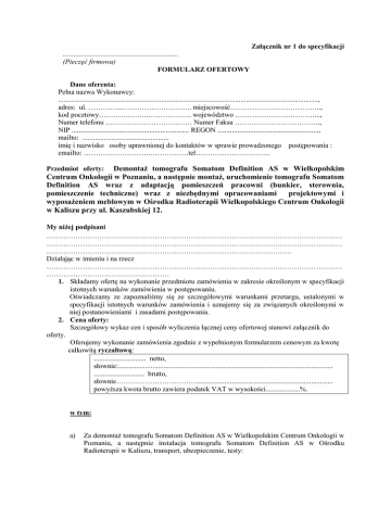 Załącznik nr 1 do specyfikacji ................................................................ (Pieczęć firmowa) FORMULARZ OFERTOWY Dane oferenta: Pełna nazwa Wykonawcy: ................................................................................................................................................, adres: ul. …………...……………………….. miejscowość……………………………….., kod pocztowy………………..………………. województwo ……………………………..., Numer telefonu ……………………………… Numer Faksu …………………….……….., NIP ................................................................. REGON ........................................................, mailto: ................................................ imię i nazwisko osoby uprawnionej do kontaktów w sprawie prowadzonego postępowania : emailto: ………………………..……………tel…………………………. Demontaż tomografu Somatom Definition AS w Wielkopolskim Centrum Onkologii w Poznaniu, a następnie montaż, uruchomienie tomografu Somatom Definition AS wraz z adaptacją pomieszczeń pracowni (bunkier, sterownia, pomieszczenie techniczne) wraz z niezbędnymi opracowaniami projektowymi i wyposażeniem meblowym w Ośrodku Radioterapii Wielkopolskiego Centrum Onkologii w Kaliszu przy ul. Kaszubskiej 12. Przedmiot oferty: My niżej podpisani …………………………………………………………………………………………………………… …………………………………………………………………………………………………………… ………………………………………………………………………………………… Działając w imieniu i na rzecz …………………………………………………………………………………………………………… …………………………………………… 1. Składamy ofertę na wykonanie przedmiotu zamówienia w zakresie określonym w specyfikacji istotnych warunków zamówienia w postępowaniu. Oświadczamy ze zapoznaliśmy się ze szczegółowymi warunkami przetargu, ustalonymi w specyfikacji istotnych warunków zamówienia i uznajemy się za związanych określonymi w niej postanowieniami i zasadami postępowania. 2. Cena oferty: Szczegółowy wykaz cen i sposób wyliczenia łącznej ceny ofertowej stanowi załącznik do oferty. Oferujemy wykonanie zamówienia zgodnie z wypełnionym formularzem cenowym za kwotę całkowitą ryczałtową: ............................. netto, słownie:....................................................................................................................... ............................ brutto, słownie……………………………............................................................................ powyższa kwota brutto zawiera podatek VAT w wysokości...................%. w tym: a) Za demontaż tomografu Somatom Definition AS w Wielkopolskim Centrum Onkologii w Poznaniu, a następnie instalacja tomografu Somatom Definition AS w Ośrodku Radioterapii w Kaliszu, transport, ubezpieczenie, testy: netto:.................................PLN (słownie:..................................................................................................................), brutto:...............................PLN (słownie...................................................................................................................), w tym podatek od towarów i usług VAT wg stawki ….....% . b) Za opracowania projektowe: netto:.................................PLN (słownie:..................................................................................................................), brutto:...............................PLN (słownie...................................................................................................................), w tym podatek od towarów i usług VAT wg stawki ….....% . c) Za roboty budowlane adaptacyjne: netto:.................................PLN (słownie:..................................................................................................................), brutto:...............................PLN (słownie...................................................................................................................), w tym podatek od towarów i usług VAT wg stawki ….....% . d) Za opracowanie dokumentacji powykonawczej: netto:.................................PLN (słownie:..................................................................................................................), brutto:...............................PLN (słownie...................................................................................................................), w tym podatek od towarów i usług VAT wg stawki ….....% . e) Za wyposażenie meblowe: netto:.................................PLN (słownie:..................................................................................................................), brutto:...............................PLN (słownie...................................................................................................................), w tym podatek od towarów i usług VAT wg stawki ….....% . 3. Wymagane oświadczenia i dokumenty wymienione w SIWZ. Dla wykazania wiarygodności ekonomicznej i technicznej naszej firmy oraz doświadczenia i praktyki w zakresie stanowiącym przedmiot niniejszego przetargu, przedkładamy oświadczenia i dokumenty wymagane w specyfikacji istotnych warunków zamówienia. 4. Potwierdzenie spełnienia wymogów dotyczących przedmiotu zamówienia. Zapewniamy, że oferowana przez nas usługa, stanowiąca przedmiot zamówienia posiada odpowiednią jakość i właściwości użytkowe dopuszczające do stosowania w placówkach ochrony zdrowia. 5. Oferujemy okres gwarancji: a. na wykonane robo