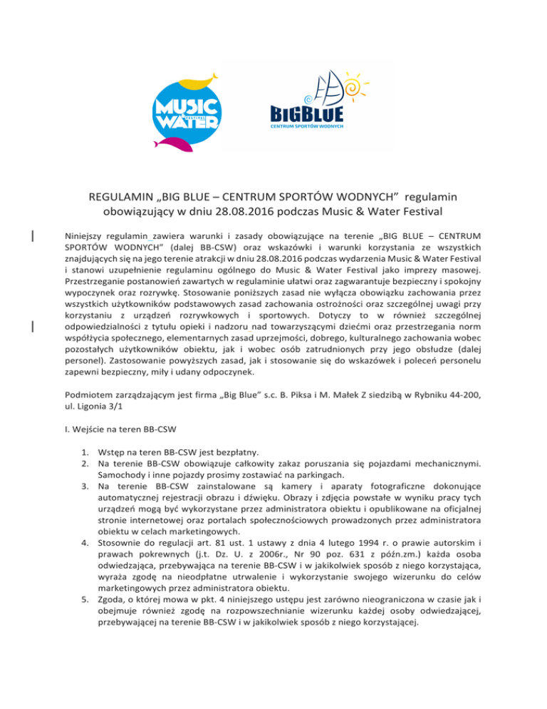 REGULAMIN „BIG BLUE – CENTRUM SPORTÓW WODNYCH” regulamin obowiązujący w dniu 28.08.2016 podczas Music & Water Festival Niniejszy regulamin zawiera warunki i zasady obowiązujące na terenie „BIG BLUE – CENTRUM SPORTÓW WODNYCH” (dalej BB-‐CSW) oraz wskazówki i warunki korzystania ze wszystkich znajdujących się na jego terenie atrakcji w dniu 28.08.2016 podczas wydarzenia Music & Water Festival i stanowi uzupełnienie regulaminu ogólnego do Music & Water Festival jako imprezy masowej. Przestrzeganie postanowień zawartych w regulaminie ułatwi oraz zagwarantuje bezpieczny i spokojny wypoczynek oraz rozrywkę. Stosowanie poniższych zasad nie wyłącza obowiązku zachowania przez wszystkich użytkowników podstawowych zasad zachowania ostrożności oraz szczególnej uwagi przy korzystaniu z urządzeń rozrywkowych i sportowych. Dotyczy to w również szczególnej odpowiedzialności z tytułu opieki i nadzoru nad towarzyszącymi dziećmi oraz przestrzegania norm współżycia społecznego, elementarnych zasad uprzejmości, dobrego, kulturalnego zachowania wobec pozostałych użytkowników obiektu, jak i wobec osób zatrudnionych przy jego obsłudze (dalej personel). Zastosowanie powyższych zasad, jak i stosowanie się do wskazówek i poleceń personelu zapewni bezpieczny, miły i udany odpoczynek. Podmiotem zarządzającym jest firma „Big Blue” s.c. B. Piksa i M. Małek Z siedzibą w Rybniku 44-‐200, ul. Ligonia 3/1 I. Wejście na teren BB-‐CSW 1. Wstęp na teren BB-‐CSW jest bezpłatny. 2. Na terenie BB-‐CSW obowiązuje całkowity zakaz poruszania się pojazdami mechanicznymi. Samochody i inne pojazdy prosimy zostawiać na parkingach. 3. Na terenie BB-‐CSW zainstalowane są kamery i aparaty fotograficzne dokonujące automatycznej rejestracji obrazu i dźwięku. Obrazy i zdjęcia powstałe w wyniku pracy tych urządzeń mogą być wykorzystane przez administratora obiektu i opublikowane na oficjalnej stronie internetowej oraz portalach społecznościowych prowadzonych przez administratora obiektu w celach marketingowych. 4. Stosownie do regulacji art. 81 ust. 1 ustawy z dnia 4 lutego 1994 r. o prawie autorskim i prawach pokrewnych (j.t. Dz. U. z 2006r., Nr 90 poz. 631 z późn.zm.) każda osoba odwiedzająca, przebywająca na terenie BB-‐CSW i w jakikolwiek sposób z niego korzystająca, wyraża zgodę na nieodpłatne utrwalenie i wykorzystanie swojego wizerunku do celów marketingowych przez administratora obiektu. 5. Zgoda, o której mowa w pkt. 4 niniejszego ustępu jest zarówno nieograniczona w czasie jak i obejmuje również zgodę na rozpowszechnianie wizerunku każdej osoby odwiedzającej, przebywającej na terenie BB-‐CSW i w jakikolwiek sposób z niego korzystającej. 6. Osobom będącym pod wpływem alkoholu, narkotyków innych środków odurzających lub w stanie wskazującym na możliwość zakłócenia ładu i porządku oraz nieprzestrzegania zasad porządkowych obowiązujących na terenie BB-‐CSW w tym w szczególności zachowującym się agresywnie, personel może odmówić sprzedaży biletu na atrakcje, zabronić wstępu do BB-‐CSW lub wyprosić z jego terenu. II. Zasady porządkowe obowiązujące na terenie BB-‐CSW 1. Na obszarze całego obiektu należy bezwzględnie przestrzegać przepisów ochrony przeciwpożarowej. 2. Zabronione jest na terenie całego BB-‐CSW grillowanie oraz palenie ognisk bez uprzedniej zgody personelu. 3. Zabrania się wnoszenia i spożywania napojów alkoholowych. 4. Zabrania się wspinania i przechodzenia przez kraty bezpieczeństwa, barierki, blokady, płoty i mury. 5. Zabrania się wnoszenia na teren BB-‐CSW broni i innych niebezpiecznych przedmiotów (pistoletów, noży, łańcuchów itp.). 6. Zabrania się umyślnego hałasowania i słuchania głośnej muzyki. 7. W celu zwiększenia bezpieczeństwa zaleca się zaopatrzyć w odpowiednie sportowe obuwie i odzież, gwarantujące nieskrępowane i bezpieczne poruszanie. 8. Zabrania się kąpieli w jeziorze znajdującym się na terenie BB-‐CSW. 9. Osoby z wadami serca, obiegu krwi itp., kobiety w ciąży, niepełnosprawni, wchodzą na teren BB-‐CSW na własną odpowiedzialność. 10. Łowienie ryb na terenie BB-‐CSW jest zabronione. 11. Nagrania radiowe oraz telewizyjne, profesjonalne filmowanie i wykonywanie zdjęć na terenie całego BB-‐CSW są dopuszczone wyłącznie za zgodą administratora obiektu. III. Korzystanie z urządzeń i atrakcji. 1. Odwiedzający mogą korzystać z dostępnych w BB-‐CSW urządzeń zabawowych i sportowych zgodnie z ich przeznaczeniem, zgodnie z regulaminami korzystania z tych urządzeń oraz zaleceniami i wskazówkami personelu. 2. Należy bezwzględnie stosować się do zaleceń personelu. 3. Wielokrotne korzystanie z tego samego urządzenia jest możliwe pod warunkiem każdorazowego, ponownego ustawienia się w kolejce oczekujących do tego urządzenia. 4. Korzystanie z urządzeń rozrywkowych i sportowych przez osoby niepełnosprawne jest uwarunkowane ze względu na stopień niepełnosprawności i możliwe tylko w obecności ich opiekuna lub osoby towarzyszącej i po dopuszczeniu do korzystania przez personel. 5. W stosunku do osób, które celowo i świadomie nie przestrzegają regulaminu, instrukcji obsługi urządzeń i atrakcji oraz poleceń personelu, personel ma prawo wydać trwały lub tymczasowy zakaz korzystania z danej atrakcji, bez prawa do rekompensaty. 6. Korzystanie z urządzeń zabawowych i sportowych podlega określonym ograniczeniom. Informacje na temat ograniczeń znajdują się na tablicach informacyjnych ulokowanych przy poszczególnych urządzeniach. 7. Użytkownik ponosi pełną odpowiedzialność za wszelkie szkody powstałe na skutek niedostosowania się do regulaminu użytkowania poszczególnych urządzeń lub szkody powstałe w wyniku własnego nieumyślnego, bądź umyślnego działania. 8. Korzystanie z urządzeń zabawowych, sportowych, placów zabaw i obiektów o podobnym char