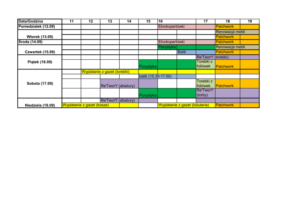 Data/Godzina Poniedziałek (12.09) 11 12 13 14 15 Wtorek (13.09) Środa (14.09) 16 Etnokopertówki Etnokopertówki Florystyka Batik Czwartek (15.09) Piątek (16.09) Florystyka 17 18 19 Patchwork Renowacja mebli Patchwork Patchwork Renowacja mebli Patchwork Re'TworY (torebki) Torebki z foliówek Patchwork Wyplatanie z gazet (torebki) batik (15.30-17.00) Sobota (17.09) Re'TworY (abażury) Florystyka Niedziela (18.09) Re'TworY (abażury) Wyplatanie z gazet (kosze) Torebki z foliówek Patchwork Re'TworY (torby) Wyplatanie z gazet (biżuteria) Patchwork