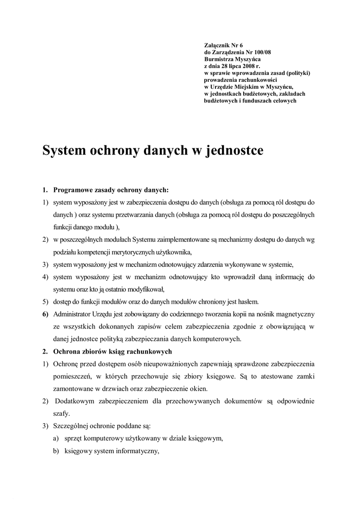 Załącznik Nr 6 do Zarządzenia Nr 100/08 Burmistrza Myszyńca z dnia 28 lipca 2008 r. w sprawie wprowadzenia zasad (polityki) prowadzenia rachunkowości w Urzędzie Miejskim w Myszyńcu, w jednostkach budżetowych, zakładach budżetowych i funduszach celowych System ochrony danych w jednostce 1. Programowe zasady ochrony danych: 1) system wyposażony jest w zabezpieczenia dostępu do danych (obsługa za pomocą ról dostępu do danych ) oraz systemu przetwarzania danych (obsługa za pomocą ról dostępu do poszczególnych funkcji danego modułu ), 2) w poszczególnych modułach Systemu zaimplementowane są mechanizmy dostępu do danych wg podziału kompetencji merytorycznych użytkownika, 3) system wyposażony jest w mechanizm odnotowujący zdarzenia wykonywane w systemie, 4) system wyposażony jest w mechanizm odnotowujący kto wprowadził daną informację do systemu oraz kto ją ostatnio modyfikował, 5) dostęp do funkcji modułów oraz do danych modułów chroniony jest hasłem. 6) Administrator Urzędu jest zobowiązany do codziennego tworzenia kopii na nośnik magnetyczny ze wszystkich dokonanych zapisów celem zabezpieczenia zgodnie z obowiązującą w danej jednostce polityką zabezpieczania danych komputerowych. 2. Ochrona zbiorów ksiąg rachunkowych 1) Ochronę przed dostępem osób nieupoważnionych zapewniają sprawdzone zabezpieczenia pomieszczeń, w których przechowuje się zbiory księgowe. Są to atestowane zamki zamontowane w drzwiach oraz zabezpieczenie okien. 2) Dodatkowym zabezpieczeniem dla przechowywanych dokumentów są odpowiednie szafy. 3) Szczególnej ochronie poddane są: a) sprzęt komputerowy użytkowany w dziale księgowym, b) księgowy system informatyczny, c) kopie zapisów księgowych, d) dowody księgowe, e) dokumentacja inwentaryzacyjna, f) sprawozdania budżetowe i finansowe, g) dokumentacja rachunkowa opisująca przyjęte przez jednostkę zasady rachunkowości. 4) Dla prawidłowej ochrony ksiąg rachunkowych stosuje się: a) regularne wykonywanie kopii bezpieczeństwa, b) odpowiedni poziom zarządzania dostępem do danych pracowników na różnych stanowiskach (imienne konta użytkowników z bezpiecznie przechowywanymi hasłami dostępu, możliwość różnicowania dostępu do baz danych i dokumentów w zależności od zakresu obowiązków danego pracownika), c) profilaktykę antywirusową – opracowane i przestrzegane odpowiednie procedury oraz stosowane programy zabezpieczające, d) zabezpieczenia przed atakiem z zewnątrz, tzw. firewalls, e) odpowiednie systemy bezpiecznej transmisji danych, f) systemy podtrzymywania napięcia w razie awarii sieci energetycznej (UPS), g) fizyczne odseparowanie komputerów z danymi księgowymi od sieci i internetu. 5) Kompletne księgi rachunkowe drukowane są nie później niż na koniec roku obrotowego. Za równoważne z wydrukiem uważa się przeniesienie treści ksiąg rachunkowych na inny komputerowy nośnik danych, zapewniający trwałość zapisu informacji, przez czas nie krótszy niż 5 lat. 3. Przechowywanie zbiorów 1) W sposób trwały (nie krótszy niż 50 lat) przechowywane są zatwierdzone sprawozdania finansowe, a także dokumentacja płacowa (listy płac, karty wynagrodzeń albo inne dowody, na podstawie których następuje ustalenie podstawy wymiaru emerytury lub renty). Licząc od dnia, w którym pracownik przestał pracować u danego płatnika składek na ubezpieczenie społeczne (art.125a ust.4 ustawy z dnia 17 grudnia 1998r. o emeryturach i rentach z FUS, tj. Dz.U. z 2004r. Nr 39, poz.353 z późn.zm.). 2) Okresowemu przechowywaniu podlegają: a) dowody księgowe dotyczące pożyczek, kredytów i innych umów, roszczeń dochodzonych w postępowaniu cywilnym, karnym i podatkowym – przez 5 lat od początku roku następującego po roku obrotowym, w którym operacje, transakcje i postępowanie zostały ostatecznie zakończone, spłacone, rozliczone lub przedawnione, b) dokumentacja przyjętego sposobu prowadzenia rachunkowości – przez okres nie krótszy niż 5 lat od upływu ich ważności, c) dokumenty dotyczące rękojmi i reklamacji – 1 rok po terminie upływu rękojmi lub rozliczeniu reklamacji, d) księgo rachunkowe, dokumenty inwentaryzacyjne oraz pozostałe dowody księgowe i dokumenty – przez okres 5 lat. 3) Powyższe terminy oblicza się od początku roku następującego po roku obrotowym, którego dane zbiory (dokumenty) dotyczą. 4. Udostępnianie danych i dokumentów. Udostępnianie sprawozdań finansowych i budżetowych oraz dowodów księgowych, ksiąg rachunkowych i innych dokumentów z zakresu rachunkowości jednostki ma miejsce: a) w siedzibie jednostki po uzyskaniu zgody kierownika jednostki lub upoważnionej przez niego osoby, b) poza siedzibą jednostki po uzyskaniu pisemnej zgody kierownika jednostki i pozostawieniu pisemnego pokwitowania zawierającego spis wydanych dokumentów. Burmistrz Myszyńca Bogdan Glinka