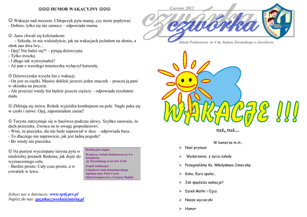HUMOR WAKACYJNY Czerwiec 2012 Wakacje nad morzem. Chłopczyk pyta mamę, czy może popływać. - Dobrze, tylko się nie zamocz – odpowiada mama. Jasio chwali się koleżankom: - Szkoda, że nie widziałyście, jak na wakacjach jechałem na słoniu, a obok nas dwa lwy... - Ojej! Nie bałeś się?! – pytają dziewczęta. - Tylko troszkę. - I długo tak wytrzymałeś? - Aż pan z wesołego miasteczka wyłączył karuzelę. Szkoła Podstawowa nr 4 im. Stefana Żeromskiego w Jarosławiu Dziewczynka wysyła list z wakacji. - On jest za ciężki. Musisz dokleić jeszcze jeden znaczek – poucza ją pani w okienku na poczcie. - Ale przecież wtedy list będzie jeszcze cięższy – odpowiada rezolutnie mała. Zbliżają się żniwa. Rolnik wyjeżdża kombajnem na pole. Nagle puka się w czoło i mówi: Ojej, zapomniałem zasiać! Turysta zatrzymuje się w bacówce podczas ulewy. Szybko zauważa, że dach przecieka. Zwraca na to uwagę gospodarzowi. - Wim, że psecieka, ale nie bede naprawiał w desc – odpowiada baca. - To dlaczego nie naprawicie, jak jest ładna pogoda? - Bo wtedy nie psecieka. Na pustyni wyczerpany turysta pyta w niedzielny poranek Beduina, jak dojść do wyznaczonego celu. - Bardzo prosto. Cały czas prosto, a w czwartek w lewo. Redakcyjna stopka Wydawca: Szkoła Podstawowa nr 4 w Jarosławiu, ul. Żeromskiego 4, tel. 621 12 48 Zespół redakcyjny: Członkowie koła dziennikarskiego Opiekun koła: Piotr Czech Skład komputerowy: Grażyna Hajduk tuż, tuż... W numerze m.in.: Nasi prymusi Wydarzenia z życia szkoły Pożegnaliśmy Ks. Władysława Janeczkę Koko, Euro spoko... Jak spędzisz wakacje? Zobacz nas w Internecie: www.sp4j.prv.pl Napisz do nas: [email protected] Dzień Matki i Ojca Nasze wycieczki Humor Komentarz numeru Muzyczna sonda UDANYCH WAKACJI W maju i czerwcu w naszej szkole wydarzyło się naprawdę wiele. Po długim weekendzie, kiedy to przeżywaliśmy Święto Pracy, Flagi, Konstytucji 3 maja i Matki Bożej Królowej Polski, wróciliśmy do „Czwórki”, by wykazać się wiedzą podczas pisania testów z wszystkich niemal przedmiotów, uczestniczyć w wycieczkach oraz różnego rodzaju programach. Mieliśmy też w szkole gości. Maj to piękny miesiąc. Niestety, jak co roku, uroki tych dni psują nam testy całoroczne m.in. z języka polskiego, przyrody, matematyki, historii i języków obcych. Kto jednak uczył się systematycznie od września, ten jakoś przeżył tą mało przyjemną, wiosenną konieczność. W tym czasie piątoklasiści pisali także próbny test z wszystkich przedmiotów, a ich starsi koledzy poznali wyniki ogólnopolskiego sprawdzianu. Były też przyjemniejsze chwile: wycieczki, występy, prezentacje. Z wszystkich tych wydarzeń pragniemy zdać Wam relację oraz pokazać zdjęcia. Rok szkolny dobiega końca. Wśród nas są tacy, którzy zasłużyli na szczególne wyróżnienia. Warto więc ich zaprezentować. Może, gdy o nich przeczytacie, sami zechcecie pójść w ślady najlepszych? Zdobywać wysokie wyniki w nauce i równie wysokie lokaty w znaczących konkursach to powód do dumy dla szkoły, Waszych rodziców i Was samych! Ostatnie tygodnie w szkole wiązały się też z przeżywaniem Euro 2012. Niestety, nasza reprezentacja odpadła już z mistrzostw. Jednak kibicowaliśmy im gorliwie. A atmosfera w szkole w dniu otwarcia turnieju była niesamowita. Nie brakło też smutnych chwil. Wraz z pocztem sztandarowym pożegnaliśmy Księdza Władysława Janeczkę, który przez 20 lat uczył religii uczniów Szkoły Podstawowej nr 4. Pewnie niejeden z Waszych rodziców był Jego uczniem. Zbliżają się wakacje, oceny już wystawione. Życzę Wam więc miłego i bezpiecznego odpoczynku, a od września pełni sił do zdobywania jak najwyższych ocen i nagród w konkursach. EMILIA MATREJEK CZY LUBIMY „KOKO, EURO SPOKO” ? Cała Polska wybierała 2 maja nasz przebój Mistrzostw Europy w Piłce Nożnej. Po podliczeniu głosów, okazało się, że zwycięskim utworem jest „Koko, Euro spoko” w wykonaniu ludowego zespołu „Jarzębiny”. Zapytaliśmy naszych koleżanek, jak im się podoba hymn Euro 2012. Oliwia Gładysz: Taki wybór przynosi wstyd całej Polsce i naszej reprezentacji, ale przynajmniej utwór „Jarzębin” i samo jego wykonanie są śmieszne. Weronika Brzozowska (V b): Moim zdaniem ta piosenka jest po prostu zabawna. Łatwo wpada w ucho, taki utwór w sam raz na stadion. Aleksandra Karcińska (V a): Piosenka promuje starsze panie i środowisko wiejskie – czyli inaczej niż zwykle. Przeważnie wszędzie pokazuje się młodych mieszkańców dużych miast. Może dlatego więc, jakby na przekór, wygrał ten utwór? Zebrała PATRYCJA KUDYBA Dzień Matki i Ojca BARDZO WAŻNE DNI Dzień Matki i Dzień Ojca to bardzo ważne święta, o których nigdy nie możemy zapominać. Nasza pamięć, wdzięczność i choćby drobny prezent są symbolicznym podziękowaniem dla rodziców za wszystko, co dla nas robią. Dzień Matki obchodzimy 26 maja. Początki tego święta sięgają czasów starożytnych Greków i Rzymian. Kultem otaczano wtedy matki-boginie, symbolem urodzaju. Zwyczaj powrócił w siedemnastowiecznej Anglii pod nazwą „niedziela u matki”. Do tradycji należało wtedy odwiedzanie mam (jeżeli już ktoś mieszkał poza domem rodzinnym) i obdarowywanie ich prezentami, głównie kwiatami i słodyczami. W zamian każda z matek błogosławiła swoje dzieci. Zwyczaj przetrwał do ok. XIX wieku. Ponownie Dzień Matki zaczęto obchodzić po zakończeniu II wojny światowej. W Polsce uroczyste obchody święta wszystkich mam po raz pierwszy odbyły się w 1914 roku w Krakowie. Dzień Ojca wypada 23 czerwca. Pierwszy raz obchodzono go 19 czerwca 1910 roku w Stanach Zjednoczonych, dokładnie w miejscowości Spokane. Jedna z tamtejszych mieszkanek postanowiła w ten sposób uczcić swojego tatę i okazać mu wdzięczność za trud wychowania. 14 lat później dzień ten stał się oficjalnym świętem w USA. Dzi