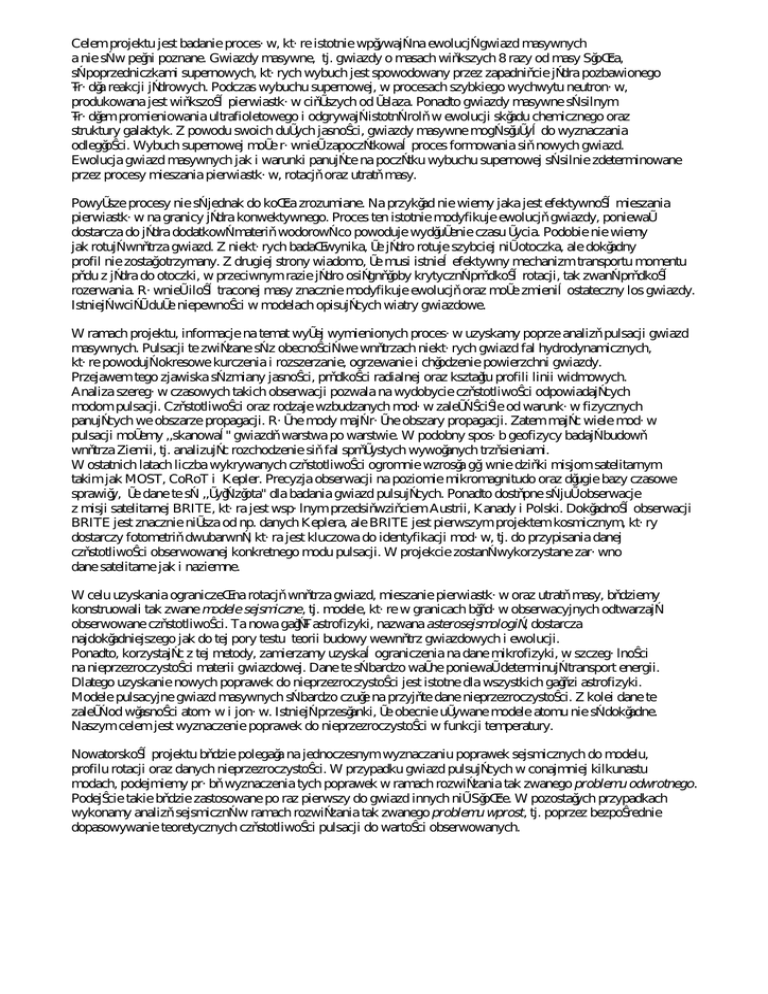 Celem projektu jest badanie procesów, które istotnie wpływają na ewolucją gwiazd masywnych a nie są w pełni poznane. Gwiazdy masywne, tj. gwiazdy o masach większych 8 razy od masy Słońca, są poprzedniczkami supernowych, których wybuch jest spowodowany przez zapadnięcie jądra pozbawionego źródła reakcji jądrowych. Podczas wybuchu supernowej, w procesach szybkiego wychwytu neutronów, produkowana jest większość pierwiastków cięższych od żelaza. Ponadto gwiazdy masywne są silnym źródłem promieniowania ultrafioletowego i odgrywają istotną rolę w ewolucji składu chemicznego oraz struktury galaktyk. Z powodu swoich dużych jasności, gwiazdy masywne mogą służyć do wyznaczania odległości. Wybuch supernowej może również zapoczątkować proces formowania się nowych gwiazd. Ewolucja gwiazd masywnych jak i warunki panujące na początku wybuchu supernowej są silnie zdeterminowane przez procesy mieszania pierwiastków, rotację oraz utratę masy. Powyższe procesy nie są jednak do końca zrozumiane. Na przykład nie wiemy jaka jest efektywność mieszania pierwiastków na granicy jądra konwektywnego. Proces ten istotnie modyfikuje ewolucję gwiazdy, ponieważ dostarcza do jądra dodatkową materię wodorową co powoduje wydłużenie czasu życia. Podobie nie wiemy jak rotują wnętrza gwiazd. Z niektórych badań wynika, że jądro rotuje szybciej niż otoczka, ale dokładny profil nie został otrzymany. Z drugiej strony wiadomo, że musi istnieć efektywny mechanizm transportu momentu pędu z jądra do otoczki, w przeciwnym razie jądro osiągnęłoby krytyczną prędkość rotacji, tak zwaną prędkość rozerwania. Również ilość traconej masy znacznie modyfikuje ewolucję oraz może zmienić ostateczny los gwiazdy. Istnieją wciąż duże niepewności w modelach opisujących wiatry gwiazdowe. W ramach projektu, informacje na temat wyżej wymienionych procesów uzyskamy poprze analizę pulsacji gwiazd masywnych. Pulsacji te związane są z obecnością we wnętrzach niektórych gwiazd fal hydrodynamicznych, które powodują okresowe kurczenia i rozszerzanie, ogrzewanie i chłodzenie powierzchni gwiazdy. Przejawem tego zjawiska są zmiany jasności, prędkości radialnej oraz kształtu profili linii widmowych. Analiza szeregów czasowych takich obserwacji pozwala na wydobycie częstotliwości odpowiadających modom pulsacji. Częstotliwości oraz rodzaje wzbudzanych modów zależą ściśle od warunków fizycznych panujących we obszarze propagacji. Różne mody mają różne obszary propagacji. Zatem mając wiele modów pulsacji możemy ,,skanować'' gwiazdę warstwa po warstwie. W podobny sposób geofizycy badają budowę wnętrza Ziemii, tj. analizując rozchodzenie się fal sprężystych wywołanych trzęsieniami. W ostatnich latach liczba wykrywanych częstotliwości ogromnie wzrosła głównie dzięki misjom satelitarnym takim jak MOST, CoRoT i Kepler. Precyzja obserwacji na poziomie mikromagnitudo oraz długie bazy czasowe sprawiły, że dane te są ,,żyłą złota" dla badania gwiazd pulsujących. Ponadto dostępne są już obserwacje z misji satelitarnej BRITE, która jest wspólnym przedsięwzięciem Austrii, Kanady i Polski. Dokładność obserwacji BRITE jest znacznie niższa od np. danych Keplera, ale BRITE jest pierwszym projektem kosmicznym, który dostarczy fotometrię dwubarwną, która jest kluczowa do identyfikacji modów, tj. do przypisania danej częstotliwości obserwowanej konkretnego modu pulsacji. W projekcie zostaną wykorzystane zarówno dane satelitarne jak i naziemne. W celu uzyskania ograniczeń na rotację wnętrza gwiazd, mieszanie pierwiastków oraz utratę masy, będziemy konstruowali tak zwane modele sejsmiczne, tj. modele, które w granicach błędów obserwacyjnych odtwarzają obserwowane częstotliwości. Ta nowa gałąź astrofizyki, nazwana asterosejsmologią, dostarcza najdokładniejszego jak do tej pory testu teorii budowy wewnętrz gwiazdowych i ewolucji. Ponadto, korzystając z tej metody, zamierzamy uzyskać ograniczenia na dane mikrofizyki, w szczególności na nieprzezroczystości materii gwiazdowej. Dane te są bardzo ważne ponieważ determinują transport energii. Dlatego uzyskanie nowych poprawek do nieprzezroczystości jest istotne dla wszystkich gałęzi astrofizyki. Modele pulsacyjne gwiazd masywnych są bardzo czułe na przyjęte dane nieprzezroczystości. Z kolei dane te zależą od własności atomów i jonów. Istnieją przesłanki, że obecnie używane modele atomu nie są dokładne. Naszym celem jest wyznaczenie poprawek do nieprzezroczystości w funkcji temperatury. Nowatorskość projektu będzie polegała na jednoczesnym wyznaczaniu poprawek sejsmicznych do modelu, profilu rotacji oraz danych nieprzezroczystości. W przypadku gwiazd pulsujących w conajmniej kilkunastu modach, podejmiemy próbę wyznaczenia tych poprawek w ramach rozwiązania tak zwanego problemu odwrotnego. Podejście takie będzie zastosowane po raz pierwszy do gwiazd innych niż Słońce. W pozostałych przypadkach wykonamy analizę sejsmiczną w ramach rozwiązania tak zwanego problemu wprost, tj. poprzez bezpośrednie dopasowywanie teoretycznych częstotliwości pulsacji do wartości obserwowanych.