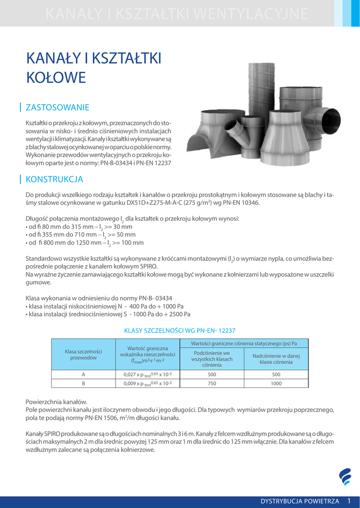 KANAŁY I KSZTAŁTKI WENTYLACYJNE KANAŁY I KSZTAŁTKI KOŁOWE ZASTOSOWANIE Kształtki o przekroju z kołowym, przeznaczonych do stosowania w nisko- i średnio ciśnieniowych instalacjach wentylacji i klimatyzacji. Kanały i kształtki wykonywane są z blachy stalowej ocynkowanej w oparciu o polskie normy. Wykonanie przewodów wentylacyjnych o przekroju kołowym oparte jest o normy: PN-B-03434 i PN-EN 12237 KONSTRUKCJA Do produkcji wszelkiego rodzaju kształtek i kanałów o przekroju prostokątnym i kołowym stosowane są blachy i taśmy stalowe ocynkowane w gatunku DX51D+Z275-M-A-C (275 g/m2) wg PN-EN 10346. Długość połączenia montażowego l2 dla kształtek o przekroju kołowym wynosi: • od fi 80 mm do 315 mm – l2 >= 30 mm • od fi 355 mm do 710 mm – l2 >= 50 mm • od fi 800 mm do 1250 mm – l2 >= 100 mm Standardowo wszystkie kształtki są wykonywane z króćcami montażowymi (l2) o wymiarze nypla, co umożliwia bezpośrednie połączenie z kanałem kołowym SPIRO. Na wyraźne życzenie zamawiającego kształtki kołowe mogą być wykonane z kołnierzami lub wyposażone w uszczelki gumowe. Klasa wykonania w odniesieniu do normy PN-B- 03434 • klasa instalacji niskociśnieniowej N - 400 Pa do + 1000 Pa • klasa instalacji średniociśnieniowej S - 1000 Pa do + 2500 Pa KLASY SZCZELNOŚCI WG PN-EN- 12237 Klasa szczelności przewodów Wartość graniczna wskaźnika nieszczelności (fmax)m3.s-1.m-2 A B Wartości graniczne ciśnienia statycznego (ps) Pa Podciśnienie we wszystkich klasach ciśnienia Nadciśnienie w danej klasie ciśnienia 0,027 x p test0,65 x 10-3 500 500 0,009 x p test0,65 x 10-3 750 1000 Powierzchnia kanałów. Pole powierzchni kanału jest iloczynem obwodu i jego długości. Dla typowych wymiarów przekroju poprzecznego, pola te podają normy PN-EN 1506, m2/m długości kanału. Kanały SPIRO produkowane są o długościach nominalnych 3 i 6 m. Kanały z felcem wzdłużnym produkowane są o długościach maksymalnych 2 m dla średnic powyżej 125 mm oraz 1 m dla średnic do 125 mm włącznie. Dla kanałów z felcem wzdłużnym zalecane są połączenia kołnierzowe. DYSTRYBUCJA POWIETRZA 1 MONTAŻ Złączka nasuwana do stosowania z kształtkami Złączka wsuwana do stosowania między przewodami Złączka wsuwana z uszczelnieniem Połączenie na styk z kołnierzami spawanymi RÓŻNICE W WARIANTACH WYKONANIA Wg szczelności: Wskaźnik szczelności przewodów (f) powinien być niższy niż wartość graniczna (fmax), odpowiadająca danej klasie szczelności przewodów, w odniesieniu do każdej wartości ciśnienia próbnego (ptest) równego obliczeniowemu ciśnieniu roboczemu lub niższego. Wymaganie to powinno być spełnione zarówno w przypadku nadciśnienia, jak i podciśnienia. Wg wytrzymałości: Sieć przewodów powinna wytrzymać wartości graniczne ciśnienia statycznego (ps) bez stałego odkształcenia lub nagłej zmiany przecieku powietrza, lub ciśnienia próbnego. Odkształcenie należy tylko wtedy odnotować, gdy nastąpi zmniejszenie przekroju poprzecznego co najmniej o 10%. WARUNKI PRACY Konstrukcja i wykonanie przewodów wentylacyjnych blaszanych oraz ich połączeń powinna umożliwiać ich stosowanie przy następujących parametrach pracy: • temperatura transportowanego powietrza w zakresie od -30 °C do +80 °C • wilgotność względna transportowanego powietrza do 100% • prędkość przepływu powietrza do 16 m/s • różnicę ciśnień statycznych powietrza wewnątrz i na zewnątrz przewodu w zależności od klasy wykonania przewodów prostokątnych: klasa wykonania A (wykonanie niskociśnieniowe): od -400 Pa do +1000 Pa klasa wykonania B (wykonanie średniociśnieniowe) od -1000 Pa do +2500 Pa • klasy szczelności klasa szczelności A: w przypadku wykonania normalnego klasa szczelności B: w przypadku wykonania o podwyższonej szczelności 2 DYSTRYBUCJAPOWIETRZA KANAŁY I KSZTAŁTKI WENTYLACYJNE Króćce i zaślepki Zaślepki Symbol: EP – zaślepka do rury EPF – zaślepka do kształtki Króćce Symbol: IL d1 [mm] 100 125 150 160 180 200 220 250 280 315 355 400 450 500 560 630 710 800 900 1000 1120 1250 Powierzchnia [m2] 0,020 0,026 0,031 0,033 0,037 0,041 0,046 0,067 0,075 0,084 0,095 0,132 0,148 0,165 0,185 0,208 0,279 0,314 0,353 0,393 0,510 0,569 Masa [kg] 0,10 0,12 0,15 0,16 0,18 0,20 0,22 0,32 0,42 0,47 0,53 0,74 0,83 0,92 1,04 1,50 2,01 2,26 3,11 3,46 4,49 5,01 Powierzchnia [m2] 0,033 0,043 0,056 0,061 0,072 0,083 0,097 0,129 0,150 0,178 0,211 0,278 0,329 0,386 0,459 0,572 0,733 0,882 0,975 1,162 1,477 1,776 Masa [kg] 0,16 0,21 0,27 0,29 0,35 0,40 0,47 0,62 0,84 1,00 1,18 1,56 1,84 2,16 2,57 4,12 5,28 6,35 8,58 10,23 13,00 15,63 PRODUKTY KOMPLEMENTARNE Produkty komplementarne: kanały okrągłe DYSTRYBUCJA POWIETRZA 3 PRZYKŁADZAMÓWIENIA IL - 315 - M 0 R W - RAL9010 Kolor malowania - podać tylko, gdy wybrano malowanie - przy malowaniu E możliwe tylko 2 kolory: RAL 9005, RAL 7035 Wariant malowania - podać tylko, gdy wybrano malowanie W - malowany wewnętrznie Z - malowany zewnętrznie D - malowany obustronnie 0 - nie malowany R - malowany proszkowo E - malowany proszkowo farbą epoksydową 0 - stal ocynkowana N - stal nierdzewna gatunku 0H18N9 9 - stal nierdzewna gatunku 1.4509 - brak oznaczenia: połączenie nypel M - mufa U - nypel z uszczelką K - kołnierz wg PN-EN 12220 P - wykonanie nietypowe wg opisu klienta d1 - średnica, dopuszczalne wymiary od 100 mm do 1250 mm IL - symbol króćca EP - 315 - U - S - 0 R W - RAL9010 Kolor malowania - podać tylko, gdy wybrano malowanie - przy malowaniu E możliwe tylko 2 kolory: RAL 9005, RAL 7035 Wariant malowania - podać tylko, gdy wybrano malowanie W - malowany wewnętrznie Z - malowany zewnętrznie D - malowany obustronnie 0 - nie malowany R - malowany proszkowo E - malowany proszkowo farbą epoksydową 0 - stal ocynkowana N - stal nierdzewna gatunku 0H18N9 9 - stal nierdzewna gatunku 1.4509 - brak oznaczenia: bez siatki S1 - blacha perforowana 10x10 S2 - siatka 12