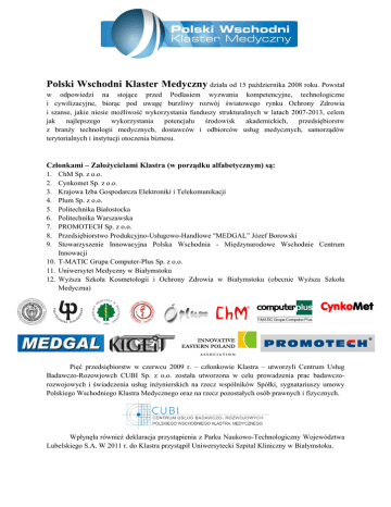 Polski Wschodni Klaster Medyczny działa od 15 października 2008 roku. Powstał w odpowiedzi na stojące przed Podlasiem wyzwania kompetencyjne, technologiczne i cywilizacyjne, biorąc pod uwagę burzliwy rozwój światowego rynku Ochrony Zdrowia i szanse, jakie niesie możliwość wykorzystania funduszy strukturalnych w latach 2007-2013, celem jak najlepszego wykorzystania potencjału środowisk akademickich, przedsiębiorstw z branży technologii medycznych, dostawców i odbiorców usług medycznych, samorządów terytorialnych i instytucji otoczenia biznesu. Członkami – Założycielami Klastra (w porządku alfabetycznym) są: 1. 2. 3. 4. 5. 6. 7. 8. 9. ChM Sp. z o.o. Cynkomet Sp. z o.o. Krajowa Izba Gospodarcza Elektroniki i Telekomunikacji Plum Sp. z o.o. Politechnika Białostocka Politechnika Warszawska PROMOTECH Sp. z o.o. Przedsiębiorstwo Produkcyjno-Usługowo-Handlowe "MEDGAL” Józef Borowski Stowarzyszenie Innowacyjna Polska Wschodnia - Międzynarodowe Wschodnie Centrum Innowacji 10. T-MATIC Grupa Computer-Plus Sp. z o.o. 11. Uniwersytet Medyczny w Białymstoku 12. Wyższa Szkoła Kosmetologii i Ochrony Zdrowia w Białymstoku (obecnie Wyższa Szkoła Medyczna) Pięć przedsiębiorstw w czerwcu 2009 r. – członkowie Klastra – utworzyli Centrum Usług Badawczo-Rozowjowch CUBI Sp. z o.o. została utworzona w celu prowadzenia prac badawczorozwojowych i świadczenia usług inżynierskich na rzecz wspólników Spółki, sygnatariuszy umowy Polskiego Wschodniego Klastra Medycznego oraz na rzecz pozostałych osób prawnych i fizycznych. Wpłynęła również deklaracja przystąpienia z Parku Naukowo-Technologiczny Województwa Lubelskiego S.A. W 2011 r. do Klastra przystąpił Uniwersytecki Szpital Kliniczny w Białymstoku. Misja Polskiego Wschodniego Klastra Medycznego Misją Klastra jest wspieranie rozwoju szeroko rozumianego sektora biotechnologii, technologii medycznych i ochrony zdrowia jako regionalnej szansy województwa Podlaskiego, poprzez stworzenie sieci współpracy przedsiębiorstw, dostawców i odbiorców technologii, produktów i usług, samorządu terytorialnego, uczelni wyższych i jednostek naukowo-badawczych oraz instytucji otoczenia biznesu działających na rzecz tego sektora. Klaster jest narzędziem realizacji strategii rozwoju regionu, poprzez wspieranie tworzenia konkurencyjnej, otwartej i innowacyjnej gospodarki opartej na wiedzy oraz wspieranie rozwoju społecznego. Cel Klastra Strategicznym celem Klastra jest stworzenie nowoczesnego środowiska technologii medycznych w zakresie badań, wdrożeń, zastosowań i kształcenia kadr z zapewnieniem wzajemnych transferów wiedzy, środków i technologii. Będzie on osiągany między innymi poprzez utworzenie Parku Naukowo – Technologicznego pod nazwą BEST PARK (Biomedical Engineering Science & Technology Park). Klaster stawia sobie za cel również: a) integrację podlaskich firm i uczelni wyższych działających w obszarze inżynierii biomedycznej i biotechnologii; b) zwiększanie dostępności wykwalifikowanych kadr dla potrzeb dostawców i odbiorców produktów, technologii i usług medycznych; c) wzmacnianie konkurencyjności przedsiębiorstw z siedzibą na terenie województwa podlaskiego na rynku globalnym; d) tworzenie korzystnych warunków dla nowych inwestycji w branży medycznej; e) zwiększenie liczby atrakcyjnych miejsc pracy w regionie; f) efektywne wykorzystywanie środków przeznaczonych na wzmocnienie konkurencyjności gospodarczej województwa; g) istotne polepszenie stanu zdrowia mieszkańców regionu; h) zapewnienie lepszej dostępności i jakości usług medycznych dla mieszkańców oraz osób spoza regionu. Cele Klastra osiągane będą w szczególności poprzez: a) budowę mechanizmów przygotowywania kadr dla potrzeb firm działających w obszarze branży medycznej oraz rozwijania ich kompetencji, w szczególności utworzenie odpowiedniego Centrum Kształcenia Kadr w ramach BEST Park; b) stworzenie platformy wymiany informacji pomiędzy uczelniami i jednostkami naukowobadawczymi a przedsiębiorcami o potrzebach i wzajemnej ofercie obu środowisk; c) stworzenie platformy i narzędzi przepływu informacji oraz koordynacji działań wspierających proces tworzenia nowych przedsiębiorstw, w tym w oparciu o powstające innowacyjne technologie; d) budowę konsorcjów realizujących wspólne przedsięwzięcia badawczo – wdrożeniowe i gospodarcze; e) budowę zespołów aplikujących o środki finansowe do funduszy strukturalnych, programów ramowych i innych potencjalnych źródeł finansowania badań i wdrożeń; 2 f) współpracę z przedsiębiorstwami i jednostkami sfery B+R w stworzeniu oferty zaawansowanych produktów, technologii i usług medycznych dla placówek ochrony zdrowia i społeczeństwa; g) zapewnienie wszechstronnego, indywidualnego rozwoju zawodowego w oparciu o unikalne zaplecze Klastra z możliwością projektowania ścieżki kariery zawodowej w oparciu o kumulowanie wieloletniego doświadczenia zdobywanego naprzemiennie na zajmowanych stanowiskach w gospodarce oraz jednostkach naukowych czy też B+R; h) promocję współpracy przedsiębiorstw; i) promocję regionu jako atrakcyjnego miejsca inwestowania, w szczególności w branżę medyczną; j) czynne uczestnictwo partnerów Klastra w rozwoju społecznym i gospodarczym Podlasia. Klaster jest otwarty na udział w strukturach ponadregionalnych, Partnerzy deklarują chęć współpracy w wymiarze krajowym i zagranicznym. Każdy z Partnerów Klastra uczestniczy w nim na równych prawach. Polski Wschodni Klaster Medyczny jest organizacją, która łączy ze sobą świat nauki ze światem biznesu. Struktura organizacyjna PWKM Wszystkie decyzje w zakresie strategicznej i programowej działalności Klastra podejmowane są przez Radę Klastra, na czele której stoi Przewodniczący Rady Klastra. Każdy z Partnerów desygnował do Rady Klastra swojego przedstawiciela. Wśród najważniejszych zadań Rady Klastra możemy w