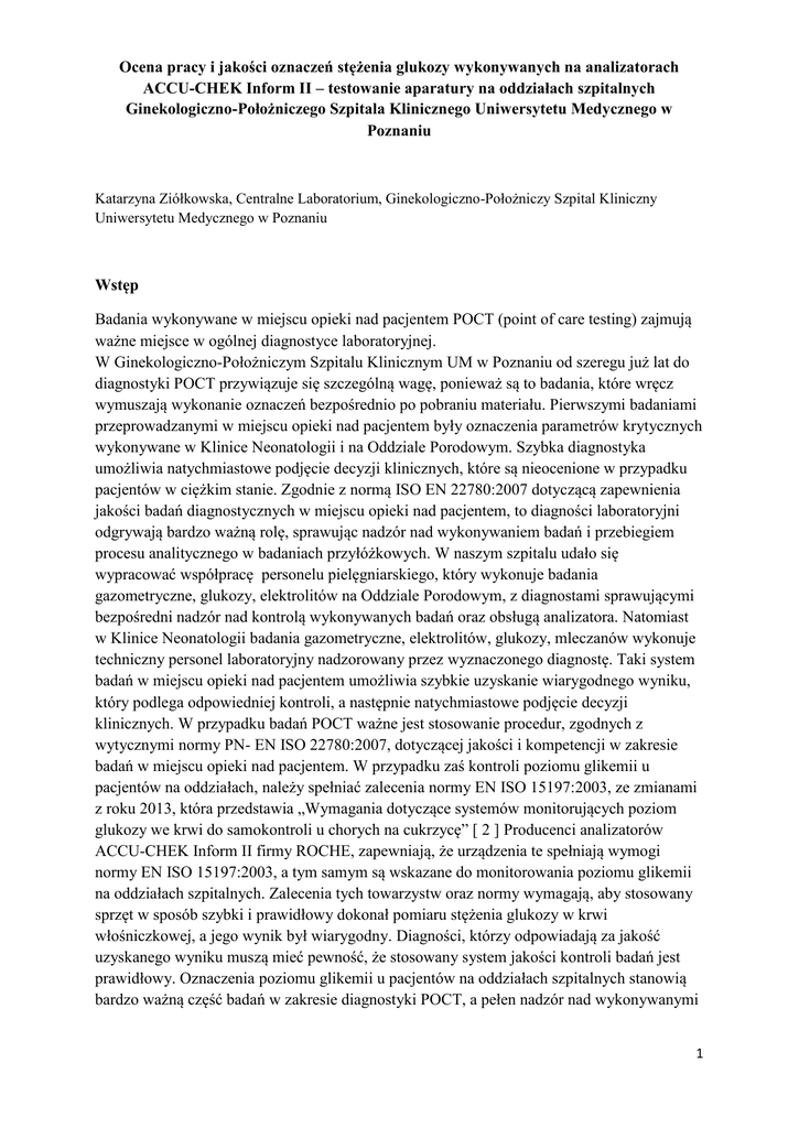 Ocena pracy i jakości oznaczeń stężenia glukozy wykonywanych na analizatorach ACCU-CHEK Inform II – testowanie aparatury na oddziałach szpitalnych Ginekologiczno-Położniczego Szpitala Klinicznego Uniwersytetu Medycznego w Poznaniu Katarzyna Ziółkowska, Centralne Laboratorium, Ginekologiczno-Położniczy Szpital Kliniczny Uniwersytetu Medycznego w Poznaniu Wstęp Badania wykonywane w miejscu opieki nad pacjentem POCT (point of care testing) zajmują ważne miejsce w ogólnej diagnostyce laboratoryjnej. W Ginekologiczno-Położniczym Szpitalu Klinicznym UM w Poznaniu od szeregu już lat do diagnostyki POCT przywiązuje się szczególną wagę, ponieważ są to badania, które wręcz wymuszają wykonanie oznaczeń bezpośrednio po pobraniu materiału. Pierwszymi badaniami przeprowadzanymi w miejscu opieki nad pacjentem były oznaczenia parametrów krytycznych wykonywane w Klinice Neonatologii i na Oddziale Porodowym. Szybka diagnostyka umożliwia natychmiastowe podjęcie decyzji klinicznych, które są nieocenione w przypadku pacjentów w ciężkim stanie. Zgodnie z normą ISO EN 22780:2007 dotyczącą zapewnienia jakości badań diagnostycznych w miejscu opieki nad pacjentem, to diagności laboratoryjni odgrywają bardzo ważną rolę, sprawując nadzór nad wykonywaniem badań i przebiegiem procesu analitycznego w badaniach przyłóżkowych. W naszym szpitalu udało się wypracować współpracę personelu pielęgniarskiego, który wykonuje badania gazometryczne, glukozy, elektrolitów na Oddziale Porodowym, z diagnostami sprawującymi bezpośredni nadzór nad kontrolą wykonywanych badań oraz obsługą analizatora. Natomiast w Klinice Neonatologii badania gazometryczne, elektrolitów, glukozy, mleczanów wykonuje techniczny personel laboratoryjny nadzorowany przez wyznaczonego diagnostę. Taki system badań w miejscu opieki nad pacjentem umożliwia szybkie uzyskanie wiarygodnego wyniku, który podlega odpowiedniej kontroli, a następnie natychmiastowe podjęcie decyzji klinicznych. W przypadku badań POCT ważne jest stosowanie procedur, zgodnych z wytycznymi normy PN- EN ISO 22780:2007, dotyczącej jakości i kompetencji w zakresie badań w miejscu opieki nad pacjentem. W przypadku zaś kontroli poziomu glikemii u pacjentów na oddziałach, należy spełniać zalecenia normy EN ISO 15197:2003, ze zmianami z roku 2013, która przedstawia „Wymagania dotyczące systemów monitorujących poziom glukozy we krwi do samokontroli u chorych na cukrzycę” [ 2 ] Producenci analizatorów ACCU-CHEK Inform II firmy ROCHE, zapewniają, że urządzenia te spełniają wymogi normy EN ISO 15197:2003, a tym samym są wskazane do monitorowania poziomu glikemii na oddziałach szpitalnych. Zalecenia tych towarzystw oraz normy wymagają, aby stosowany sprzęt w sposób szybki i prawidłowy dokonał pomiaru stężenia glukozy w krwi włośniczkowej, a jego wynik był wiarygodny. Diagności, którzy odpowiadają za jakość uzyskanego wyniku muszą mieć pewność, że stosowany system jakości kontroli badań jest prawidłowy. Oznaczenia poziomu glikemii u pacjentów na oddziałach szpitalnych stanowią bardzo ważną część badań w zakresie diagnostyki POCT, a pełen nadzór nad wykonywanymi 1 badaniami i odpowiedzialność za wiarygodność uzyskiwanych wyników spoczywa na barkach diagnostów laboratoryjnych. Materiał i metoda Ocenie poddano 9 analizatorów ACCU-CHEK Inform II firmy ROCHE Diagnostics, które służą do pomiaru poziomu glikemii poza laboratorium. Testowano je wymiennie na 11 oddziałach szpitalnych, w Punkcie Poboru i Centralnym Laboratorium GPSK UM w Poznaniu. Na oddziałach szpitalnych aparaty były obsługiwane przez personel pielęgniarski, pod nadzorem wyznaczonych diagnostów, w Centralnym Laboratorium sprzęt był obsługiwany przez samych diagnostów. Ocena glukometrów polegała na sprawdzeniu jakości obsługi tych urządzeń oraz współpracy z oprogramowaniem cobas IT1000. W celu ułatwienia tej analizy przygotowano dwa rodzaje ankiet – ankieta 1 i ankieta 2. Wykonano ponad 1000 oznaczeń poziomu glukozy na testowanych urządzeniach, natomiast szczegółowej analizie poddano 124 oznaczenia stężenia glukozy u pacjentów dorosłych, które zostały wykonane na aparatach ACCU-CHEK Inform II i porównane z badaniami wykonanymi na analizatotrze cobas c311 metodą referencyjną. W systemie ACCU-CHEK Inform II zastosowano metodę enzymatyczną i elektrochemiczną technikę pomiarową. Innowacyjność tej opatentowanej metody polega na połączeniu dwóch technik elektrochemicznych AC z konwencjonalną DC. Na teście paskowym znajduje się zmutowana odmiana chinoproteiny dehydrogenazy glukozowej (Mut. Q-GDH), z Acinetobacter calcoaceticus, rekombinant E. coli, enzym, który przekształca glukozę w glukonolakton. Reakcja ta powoduje powstanie nieszkodliwego prądu stałego, który jest odpowiednio przetwarzany i umożliwia wyrażenie wyniku pomiaru na stężenie glukozy we krwi [ 6 ]. Jako metodę referencyjną zastosowano oznaczanie stężenia glukozy w osoczu krwi, zgodnie zaleceniami Międzynarodowej Federacji Chemii Klinicznej i Medycyny Laboratoryjnej (IFCC), ponieważ glukometr ACCU-CHEK Inform II, zgodnie z zapewnieniami producenta, podaje wartości w odniesieniu do stężenia glukozy w osoczu, pomimo umieszczania na teście paskowym krwi włośniczkowej.[ 6 ] W badaniach jako metodę referencyjną zastosowano metodę kolorymetryczną z heksokinazą, na analizatorze cobas c311. Heksokinaza katalizuje reakcję fosforylacji glukozy przy udziale ATP do glukozo-6-fosforanu i ADP. Następnie przebiega reakcja katalizowana przez dehydrogenazę glukozo-6-fosforanową (G6PDH), pod wpływem NAD+, następuje utlenianie glukozo-6fosforanu i powstaje zredukowana forma NADH oraz 6-fosfoglukonolakton. Stężenie zredukowanej formy NADH jest wprost proporcjonalne do stężenia glukozy i jest mierzone jako wzrost absorbancji przy długości fali równej 340 nm. Uzyskane w