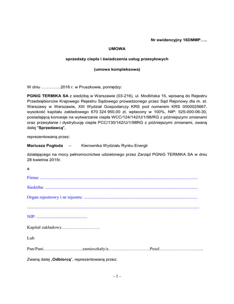 Nr ewidencyjny 16DMMP….. UMOWA sprzedaży ciepła i świadczenia usług przesyłowych (umowa kompleksowa) W dniu …………..2016 r. w Pruszkowie, pomiędzy: PGNiG TERMIKA SA z siedzibą w Warszawie (03-216), ul. Modlińska 15, wpisaną do Rejestru Przedsiębiorców Krajowego Rejestru Sądowego prowadzonego przez Sąd Rejonowy dla m. st. Warszawy w Warszawie, XIII Wydział Gospodarczy KRS pod numerem KRS 0000025667, wysokość kapitału zakładowego 670 324 950,00 zł, wpłacony w 100%, NIP: 525-000-06-30, posiadającą koncesje na wytwarzanie ciepła WCC/124/142/U/1/98/RG z późniejszymi zmianami oraz przesyłanie i dystrybucję ciepła PCC/130/142/U/1/98RG z późniejszymi zmianami, zwaną dalej "Sprzedawcą", reprezentowaną przez: Mariusza Pogłoda – Kierownika Wydziału Rynku Energii działającego na mocy pełnomocnictwa udzielonego przez Zarząd PGNiG TERMIKA SA w dniu 28 kwietnia 2015r. a Firma: ......................................................................................................................................... Siedziba: ..................................................................................................................................... Organ rejestrowy i nr rejestru: ................................................................................................... ...................................................................................................................................................... NIP: ............................................ Kapitał zakładowy……………………. Lub Pan/Pani……………………..zamieszkały/a………………………Pesel……………………….. Zwaną dalej „Odbiorcą”, reprezentowaną przez: -1- 1. 2. ................................................................................................ ................................................................................................ została zawarta umowa następującej treści: §1 Obowiązywanie umowy 1. Umowa niniejsza zostaje zawarta na czas nieokreślony z mocą obowiązującą od dnia …………………………… §2 Postanowienia ogólne 1. Przedmiotem umowy jest dostarczanie przez Sprzedawcę energii cieplnej (ciepła) oraz mocy cieplnej do obiektów Odbiorcy oraz świadczenie usługi przesyłowej. 2. Ciepło dostarczane będzie za pośrednictwem nośnika - gorącej wody, o parametrach regulowanych wg zasad określonych dla sieci ciepłowniczej, zgodnie z Załącznikiem Nr 1. 3. Granicę dostarczania, wielkość dostawy wynikającej z mocy cieplnej zamówionej przez Odbiorcę wraz z jej przeznaczeniem oraz podstawowe parametry określa „Zapotrzebowanie na dostawę energii cieplnej” stanowiące Załącznik Nr 2. 4. Przez zamówioną moc cieplną rozumie się ustaloną przez Odbiorcę największą moc cieplną, jaka w ciągu roku występuje w danym obiekcie dla warunków obliczeniowych, uwzględniającą moc cieplną niezbędną dla: a) pokrycia strat ciepła w obiekcie, zapewniającą utrzymanie normatywnej temperatury i wymiany powietrza w pomieszczeniach znajdujących się w tym obiekcie, b) zapewnienia utrzymania normatywnej temperatury ciepłej wody w punktach czerpalnych znajdujących się w tym obiekcie, a także c) zapewnienia prawidłowej pracy innych urządzeń lub instalacji, zgodnie z określonymi dla nich warunkami technicznymi i wymaganiami technologicznymi. 5. Odbiór ciepła będzie następował za pośrednictwem węzłów cieplnych. 6. Granicę eksploatacji urządzeń określa Załącznik Nr 2. 7. Sprzedawca zapewnia dostawę ciepła w ciągu całego roku, z przerwą na remont lub konserwację sieci ciepłowniczej. -2- 8. Okresem rozliczeniowym dla dostaw ciepła jest okres miesiąca kalendarzowego. 9. Planowana przerwa w dostawie ciepła na wykonanie planowanych remontów lub konserwacji sieci ciepłowniczej może wystąpić tylko w okresie maj ÷ wrzesień i nie może przekroczyć 14 dni, następujących po sobie kolejno a Odbiorca będzie powiadomiony o terminie przerwy z pięciodniowym wyprzedzeniem. 10. Poza okresem planowanej przerwy określonym w ust. 7 niniejszego paragrafu, przerwy w dostawie ciepła mogą nastąpić tylko z powodu siły wyższej lub awarii urządzeń po stronie Sprzedawcy lub Odbiorcy. 11. Rozpoczęcie i przerwanie dostarczania ciepła w celu ogrzewania i dla innych potrzeb w przypadkach innych niż wymienione w powyższym ust. 7 i 10 następuje wyłącznie na zlecenie Odbiorcy. 12. Jeżeli węzeł cieplny nie został wyposażony w urządzenia automatycznej regulacji dostawy ciepła to Sprzedawca dokona rozpoczęcia lub przerwania dostarczania ciepła w następującym trybie: 1) w ciągu 36 godzin od złożenia zlecenia przez Odbiorcę, gdy realizacja wypada w dniu roboczym, 2) w pierwszym dniu roboczym po dniach wolnych od pracy, gdy zlecenia dokonano tak, że realizacja wypadłaby w dniu wolnym od pracy. 13. Węzły cieplne wyposażone w urządzenia automatycznej regulacji dostawy ciepła będą automatycznie uruchamiały dostarczanie ciepła (dodatkowe opłaty z tego tytułu nie będą pobierane). 14. Z tytułu jednorazowego rozpoczęcia i przerwania dostaw ciepła w ciągu roku Sprzedawca nie pobiera dodatkowej opłaty. 15. Za każde dodatkowe w danym roku zlecenie Odbiorcy dotyczące przerwania lub rozpoczęcia dostawy ciepła w celu ogrzewania wskazanych przez Odbiorcę obiektów, Sprzedawca będzie pobierał opłatę określoną w załączniku Nr 4 do niniejszej umowy. 16. Upoważnieni przedstawiciele Sprzedawcy wykonują kontrole układów pomiarowych, dotrzymywania warunków umowy i prawidłowości rozliczeń. 17. Pracownikom Sprzedawcy po okazaniu legitymacji i pisemnego upoważnienia wydanego przez Sprzedawcę przysługuje prawo: 1) wstępu na teren nieruchomości lub do pomieszczeń gdzie przeprowadzana jest kontrola, 2) przeprowadzenia w ramach kontroli niezbędnych przeglądów urządzeń będących własnością Sprzedawcy, a 