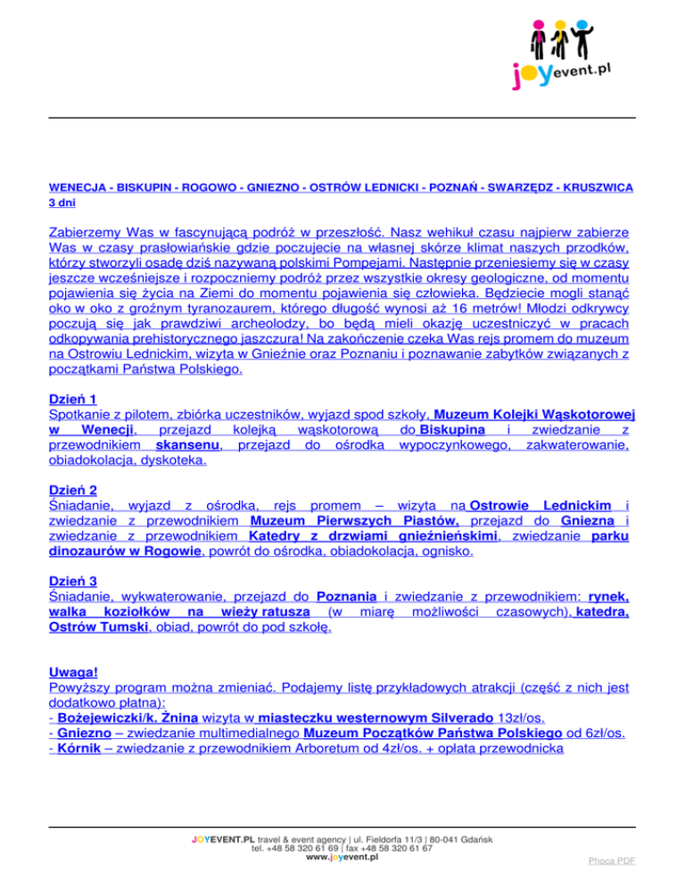 WENECJA - BISKUPIN - ROGOWO - GNIEZNO - OSTRÓW LEDNICKI - POZNAŃ - SWARZĘDZ - KRUSZWICA 3 dni Zabierzemy Was w fascynującą podróż w przeszłość. Nasz wehikuł czasu najpierw zabierze Was w czasy prasłowiańskie gdzie poczujecie na własnej skórze klimat naszych przodków, którzy stworzyli osadę dziś nazywaną polskimi Pompejami. Następnie przeniesiemy się w czasy jeszcze wcześniejsze i rozpoczniemy podróż przez wszystkie okresy geologiczne, od momentu pojawienia się życia na Ziemi do momentu pojawienia się człowieka. Będziecie mogli stanąć oko w oko z groźnym tyranozaurem, którego długość wynosi aż 16 metrów! Młodzi odkrywcy poczują się jak prawdziwi archeolodzy, bo będą mieli okazję uczestniczyć w pracach odkopywania prehistorycznego jaszczura! Na zakończenie czeka Was rejs promem do muzeum na Ostrowiu Lednickim, wizyta w Gnieźnie oraz Poznaniu i poznawanie zabytków związanych z początkami Państwa Polskiego. Dzień 1 Spotkanie z pilotem, zbiórka uczestników, wyjazd spod szkoły, Muzeum Kolejki Wąskotorowej w Wenecji, przejazd kolejką wąskotorową do Biskupina i zwiedzanie z przewodnikiem skansenu, przejazd do ośrodka wypoczynkowego, zakwaterowanie, obiadokolacja, dyskoteka. Dzień 2 Śniadanie, wyjazd z ośrodka, rejs promem – wizyta na Ostrowie Lednickim i zwiedzanie z przewodnikiem Muzeum Pierwszych Piastów, przejazd do Gniezna i zwiedzanie z przewodnikiem Katedry z drzwiami gnieźnieńskimi, zwiedzanie parku dinozaurów w Rogowie, powrót do ośrodka, obiadokolacja, ognisko. Dzień 3 Śniadanie, wykwaterowanie, przejazd do Poznania i zwiedzanie z przewodnikiem: rynek, walka koziołków na wieży ratusza (w miarę możliwości czasowych), katedra, Ostrów Tumski, obiad, powrót do pod szkołę. Uwaga! Powyższy program można zmieniać. Podajemy listę przykładowych atrakcji (część z nich jest dodatkowo płatna): - Bożejewiczki/k. Żnina wizyta w miasteczku westernowym Silverado 13zł/os. - Gniezno – zwiedzanie multimedialnego Muzeum Początków Państwa Polskiego od 6zł/os. - Kórnik – zwiedzanie z przewodnikiem Arboretum od 4zł/os. + opłata przewodnicka JOYEVENT.PL travel & event agency | ul. Fieldorfa 11/3 | 80-041 Gdańsk tel. +48 58 320 61 69 | fax +48 58 320 61 67 www.joyevent.pl Phoca PDF - Kórnik – zwiedzanie z przewodnikiem zamku od 7zł/os. + opłata przewodnicka - Kruszwica – wejście na Krzywą Wieżę, rejs po Gople od 5,5zł/os - Pobiedziska – Park Miniatur 5zł/os - Pobiedziska – wystawa maszyn oblężniczych od 5zł/os + opłata przewodnicka - Puszczykowo – Muzeum Arkadego Fiedlera 9zł/os + opłata przewodnicka - Rogalin – zwiedzanie z przewodnikiem zespołu parkowo-pałacowego 1zł/os +opłata przewodnicka - Rogalin – wizyta w kaplicy Św. Marcelina - Swarzędz – wizyta w Aqua Parku lub parku wodnym Octopus w Suchym Lesie k. Poznania od 8zł/godz - Wenecja - Muzeum Kolejki Wąskotorowej - zwiedzanie z przewodnikiem + lekcja muzealna od 8zł/os + opłata przewodnicka - Poznań: turystyczna gra miejska w Poznaniu, obserwatorium astronomiczne, muzeum uzbrojenia, muzeum instrumentów muzycznych, muzeum rogala, palmiarnia, zwiedzanie Poznania zabytkowym tramwajem, wyjście do teatru/kina IMAX, makiety Dawnego Poznania, legendy Poznania w 6D, rekreacja na Malcie, wizyta w obserwatorium astronomicznym. O szczegóły zapytaj w biurze! Cena: od 359 PLN/os (przy grupie min. 45 os.) Bilety wstępu płatne dodatkowo – w wersji programu proponowanej powyżej przez nas: 40 zł/os. Cena zawiera: Zakwaterowanie w ośrodku w Wenecji lub okolicy, pokoje 3-5 osobowe z łazienkami (WC, umywalka, prysznic), wyżywienie zgodne z programem – 2x śniadanie, 2x obiadokolacja, 1x obiad, przejazd autokarem klasy turystycznej, opieka i pomoc pilota/reprezentanta biura, usługi przewodnickie zgodnie z programem, bezpłatne uczestnictwo 3 opiekunów, podatek VAT. Program imprezy jest ramowy, kolejność zwiedzania może ulec zmianie. Planujesz zorganizować klasową wycieczkę „z klasą”? Szukasz transportu, przewodnika, pilota, programu wycieczki? Nasze biuro podróży z przyjemnością Ci w tym pomoże. Joytrip.pl to organizator wycieczek szkolnych nastawiony przede wszystkim na satysfakcję klientów. W ramach turystyki szkolnej oferujemy autorskie programy wyjazdów szkolnych, zielonych szkół, biwaków i wycieczek krajoznawczych. Najchętniej wybierane przez naszych klientów programy i regiony to: Kraków, Warszawa, Lwów, Praga, Łeba, Zakopane, Poznań, Mazury, Pomorze, Bieszczady, Tatry, Szlak Piastowski, Pomorze. Podróżujemy zawsze bezpiecznie autokarem, busem lub pociągiem. Każda z naszych wycieczek daje możliwość aktywnego JOYEVENT.PL travel & event agency | ul. Fieldorfa 11/3 | 80-041 Gdańsk tel. +48 58 320 61 69 | fax +48 58 320 61 67 www.joyevent.pl Phoca PDF wypoczynku, naturalnego poszerzenia wiedzy uczniów i ich integracji przez zabawę, której tak często brakuje w dobie intensywnej komputeryzacji. JOYEVENT.PL travel & event agency | ul. Fieldorfa 11/3 | 80-041 Gdańsk tel. +48 58 320 61 69 | fax +48 58 320 61 67 www.joyevent.pl Phoca PDF